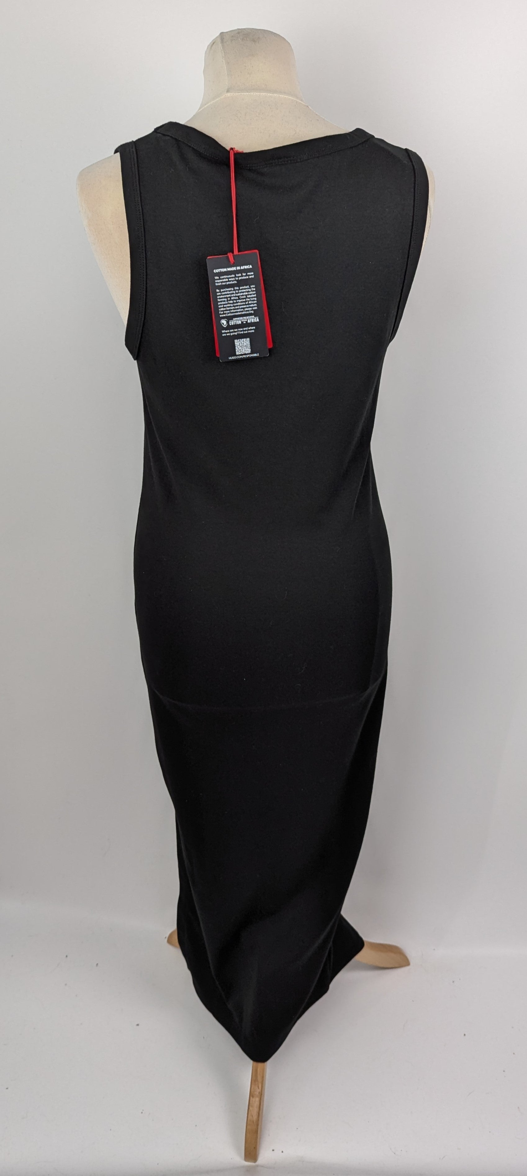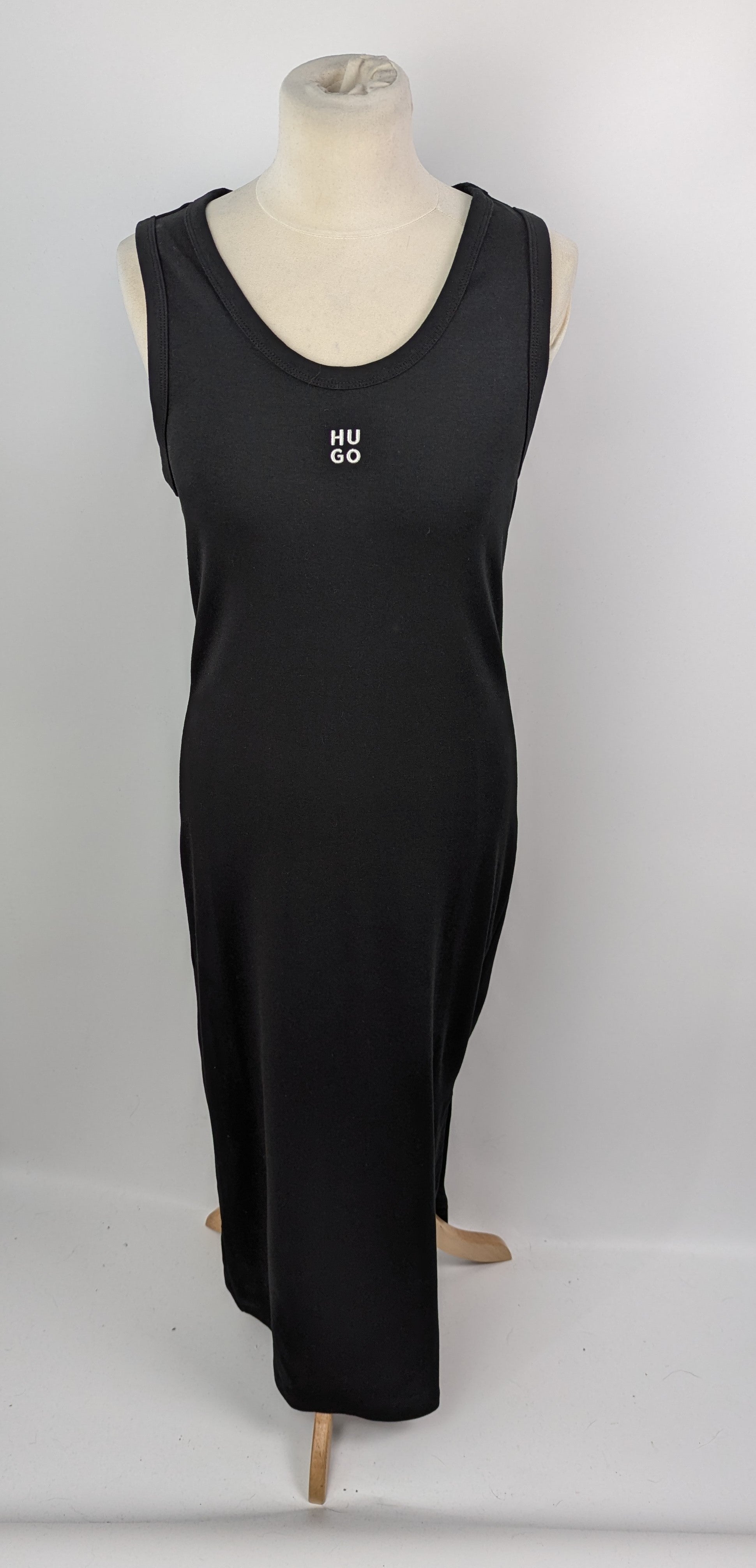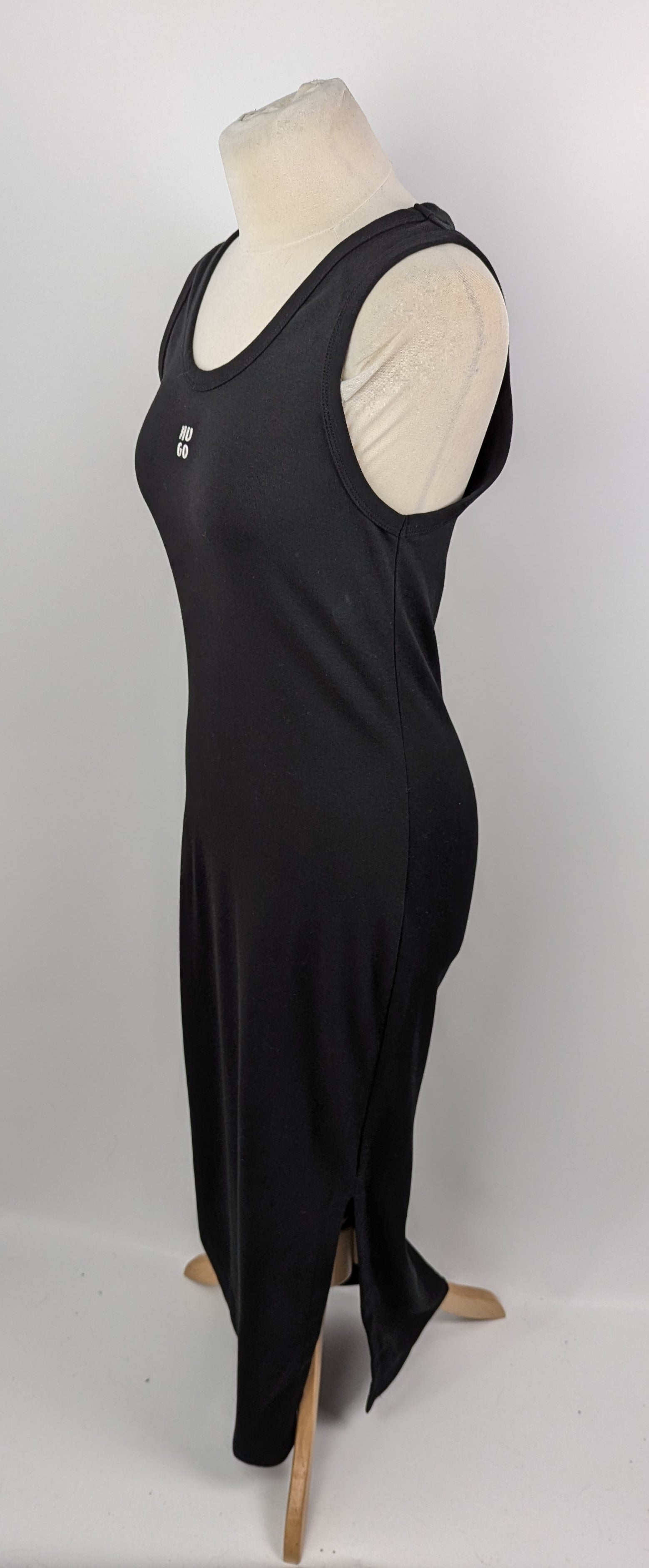 The Hugo Nalimera Bodycon Dress in Black features a chest logo and a bottom slit designed for easy movement.