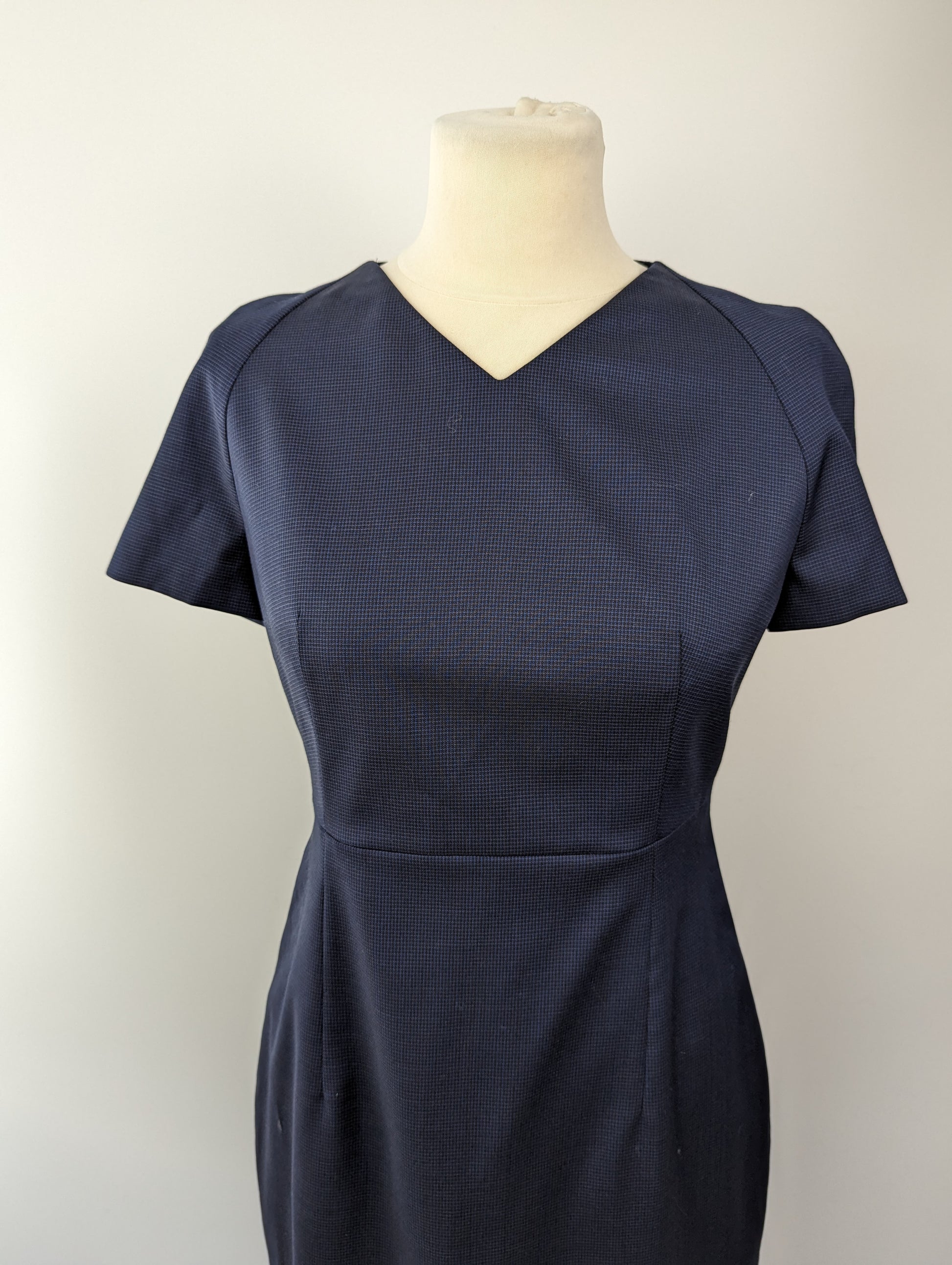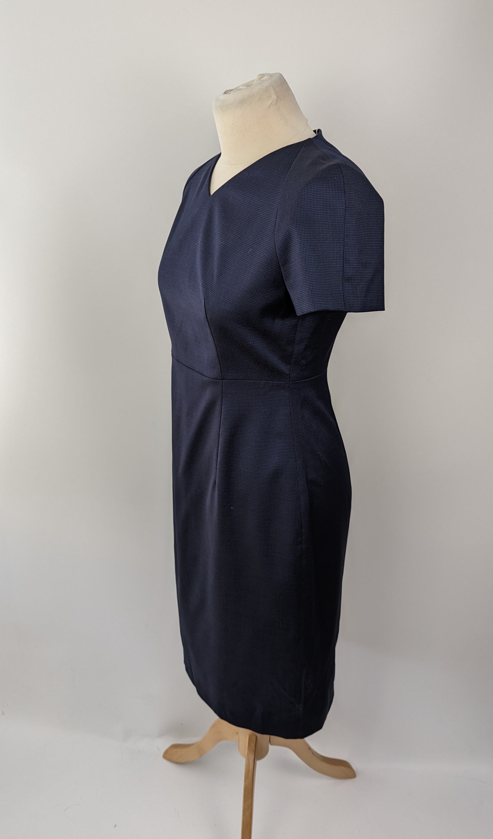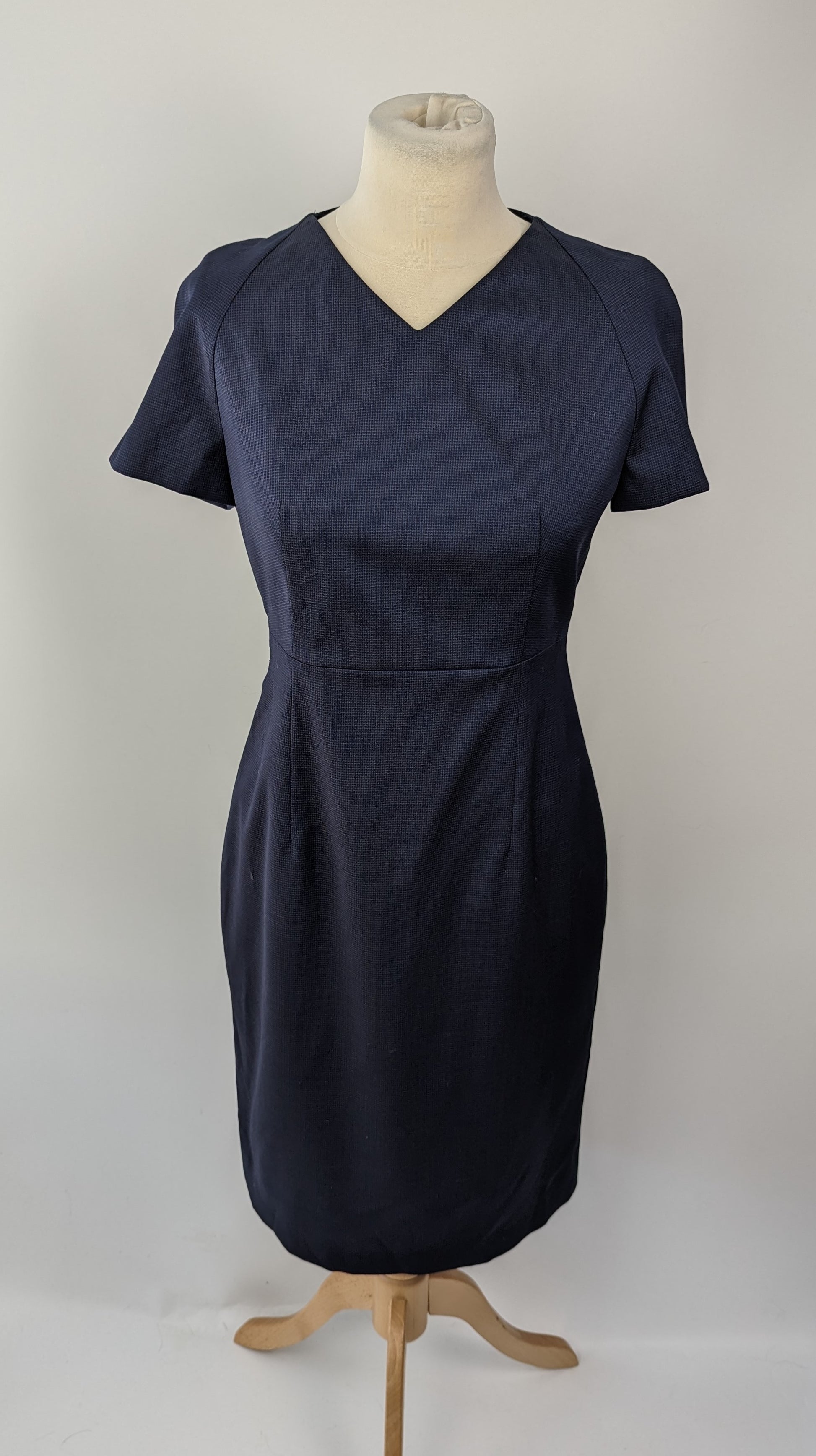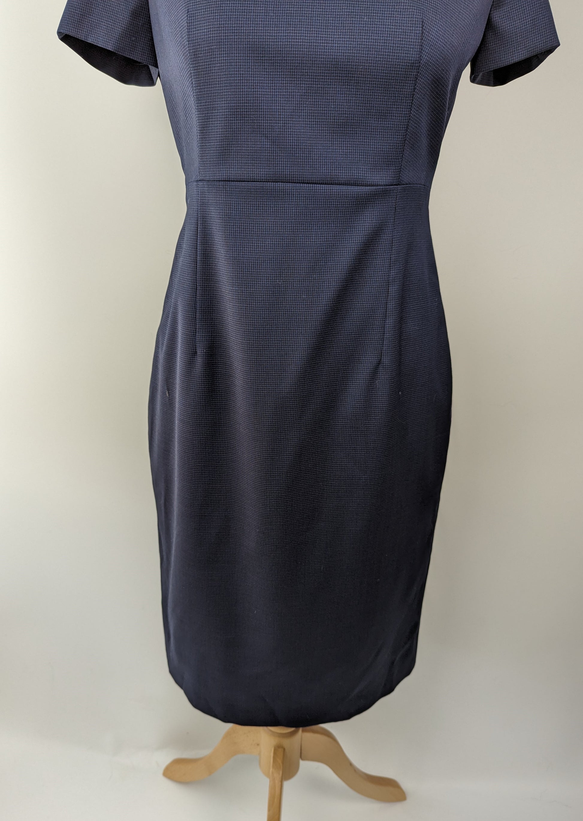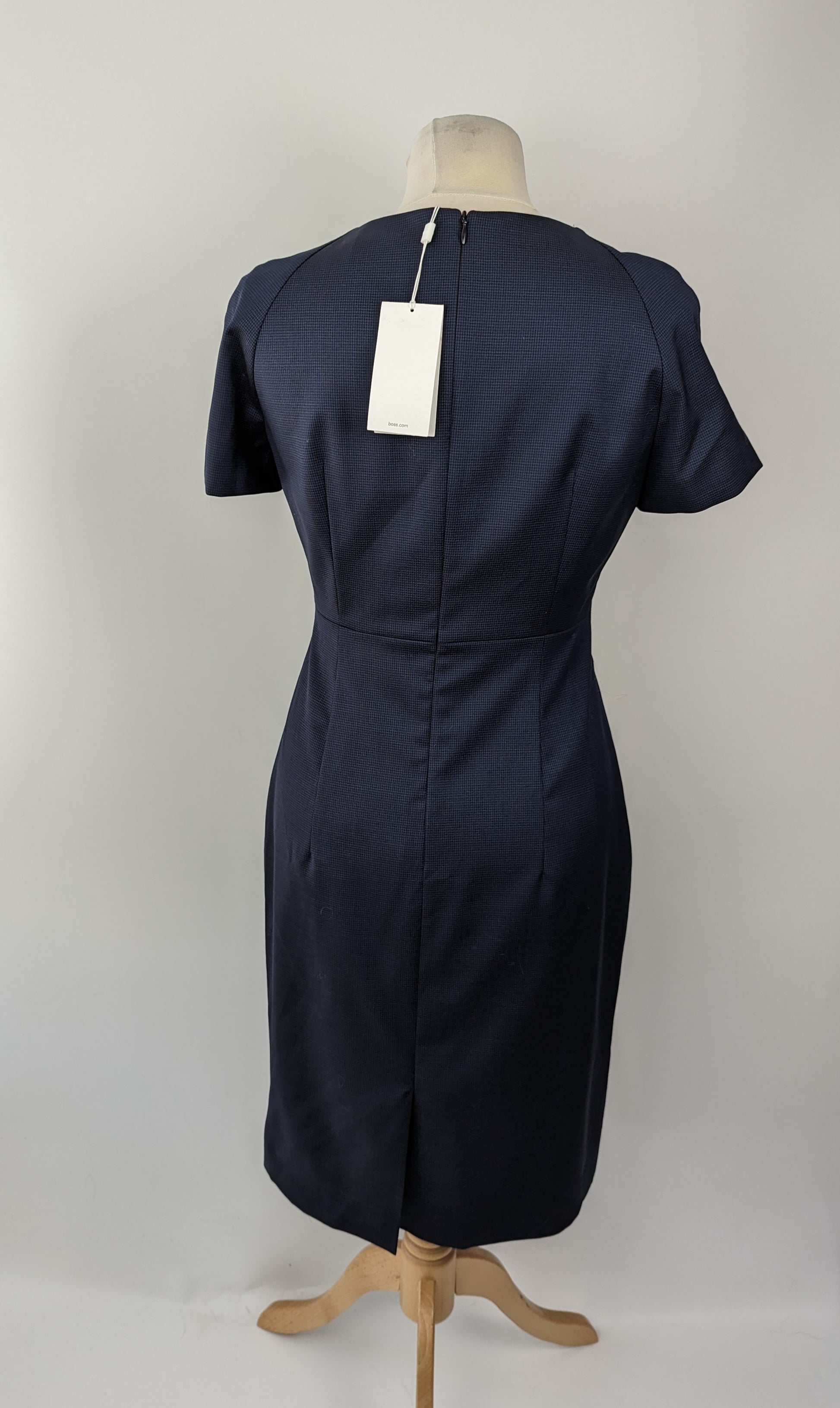 The HUGO Womens Deitua Dress is a sleek and sophisticated choice for any occasion, featuring a deep blue hue and a zip closure at the back for a secure fit. Its short sleeves and pencil shape create a stunning silhouette, while the midi length adds a touch of elegance.
