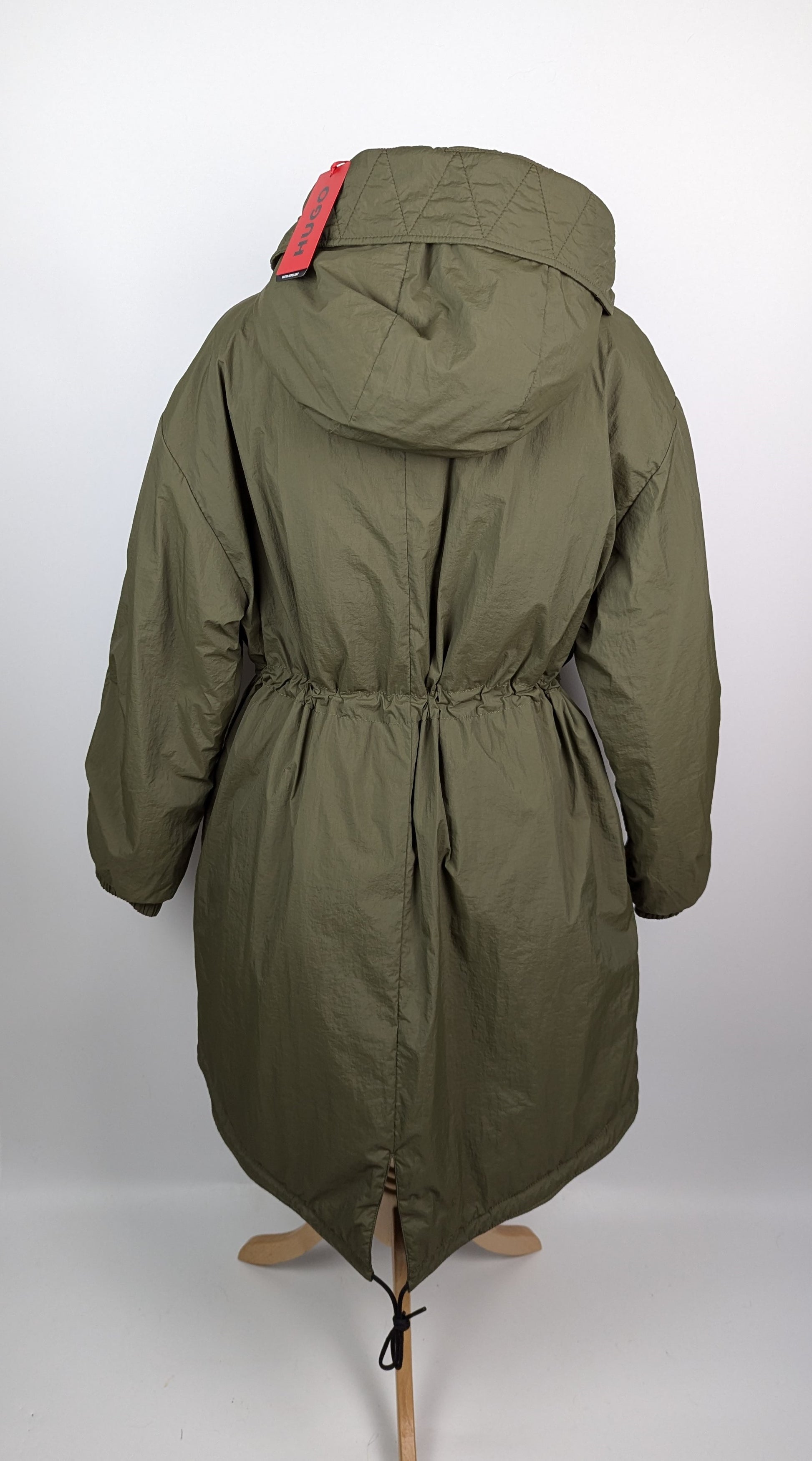 Boasting a polyester material that ensures both durability and comfort, the nylon lining adds a luxurious touch. With its warm padding, this parka becomes an indispensable companion during chilly seasons while the loose fit allows for ease of movement. Designed for the fashion-forward individual, this parka features a full two-way zip fastening for added convenience, along with a press stud fastened storm flap that delivers both style and protection from the elements. The adjustable drawstring hood enables you to find the perfect fit, while the long sleeves and elasticated cuffs provide an extra layer of warmth. With a curved hemline adorned with a back vent and drawstring fastening, this parka effortlessly combines fashion and functionality.