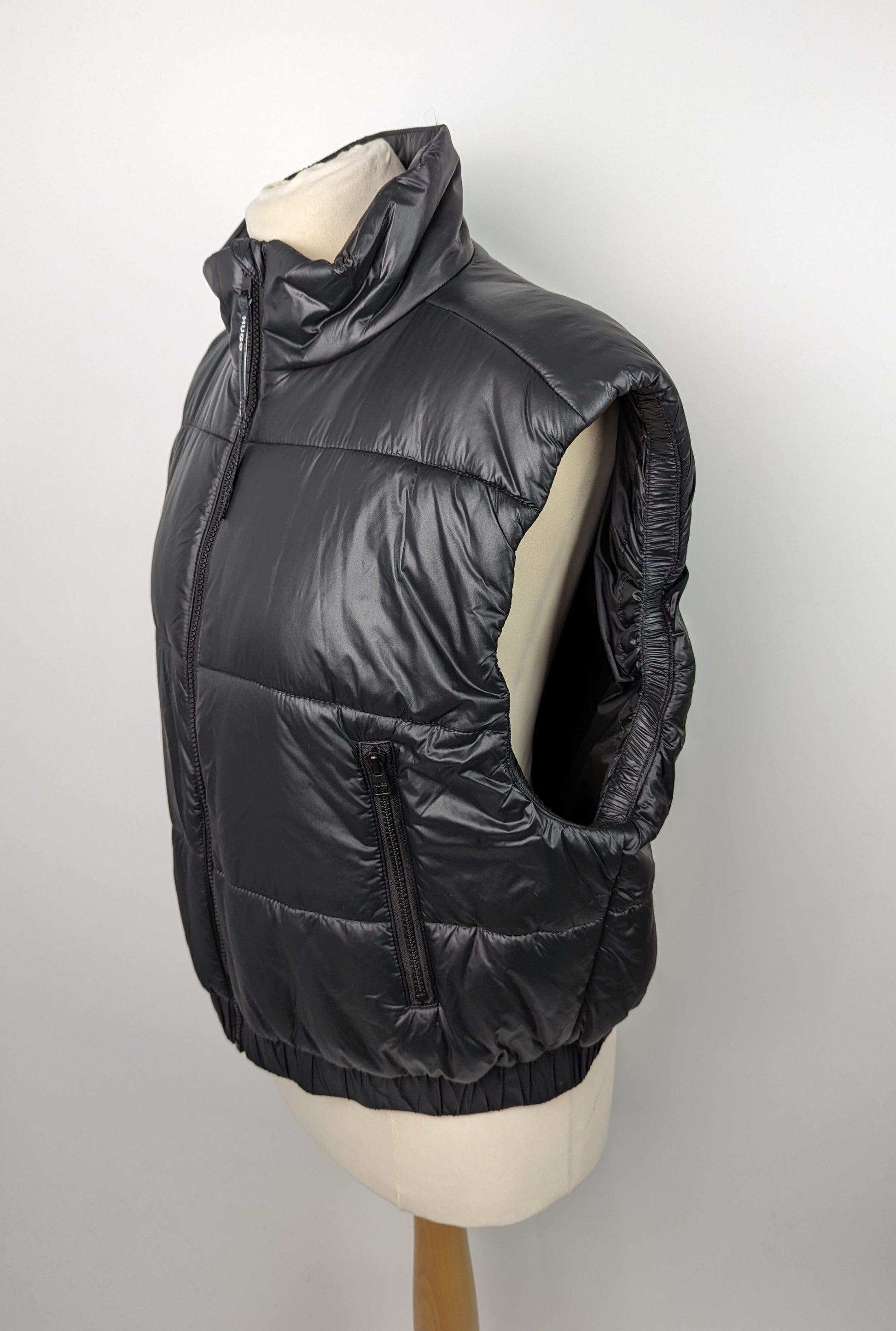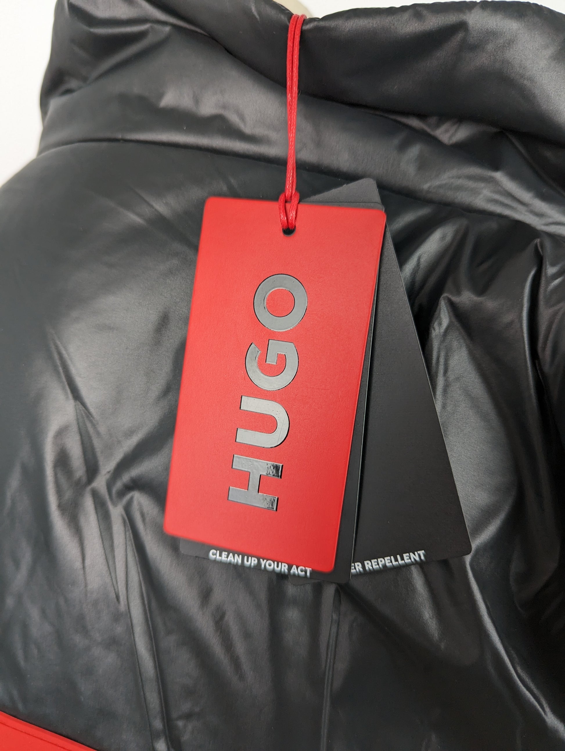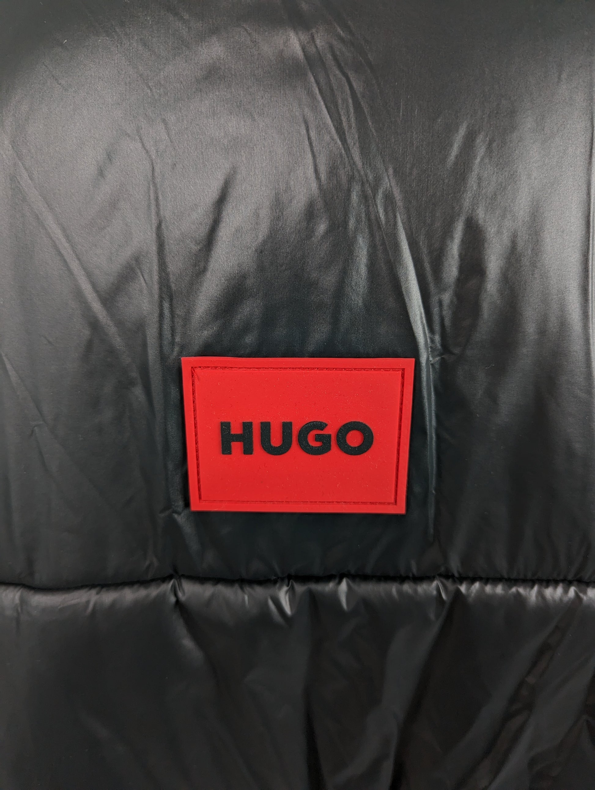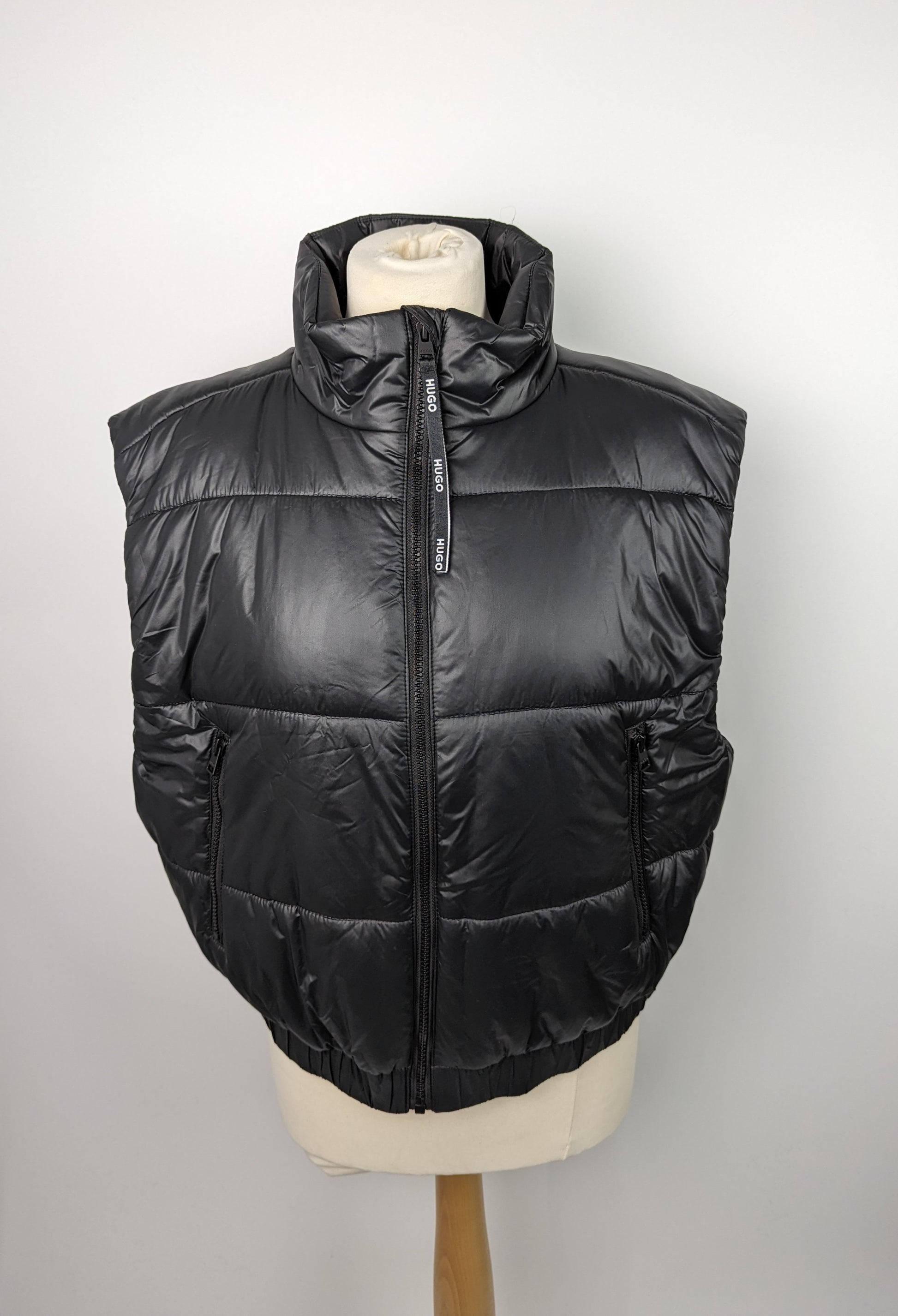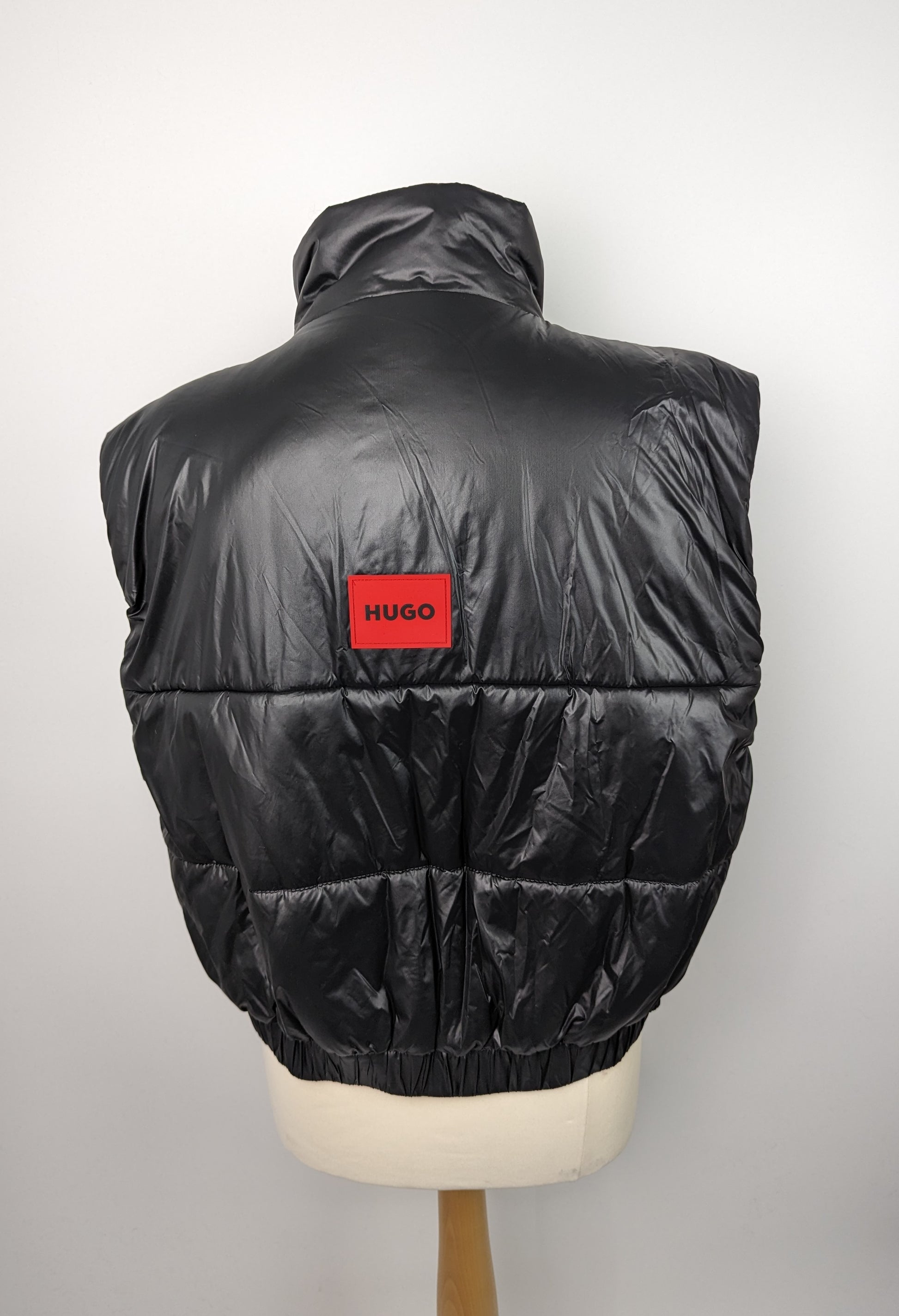 Crafted with care and conscious of the environment, this gilet is made from recycled nylon, reflecting Hugo's commitment to sustainability. The padded construction with water-repellent capabilities provides warmth and comfort, making it perfect for transitioning seasons. Designed with an on-trend relaxed fit and a slightly cropped length, the Felere-1 Gilet exudes effortless cool. The high neckline adds a touch of sophistication, while the zip fastening and elasticated hemline ensure a secure and comfortable fit. Practicality meets style with the two zipped hand pockets, providing a safe haven for your essentials. To add a pop of colour and express your fashionable individuality, notice the red logo badge adorning the back of this gilet