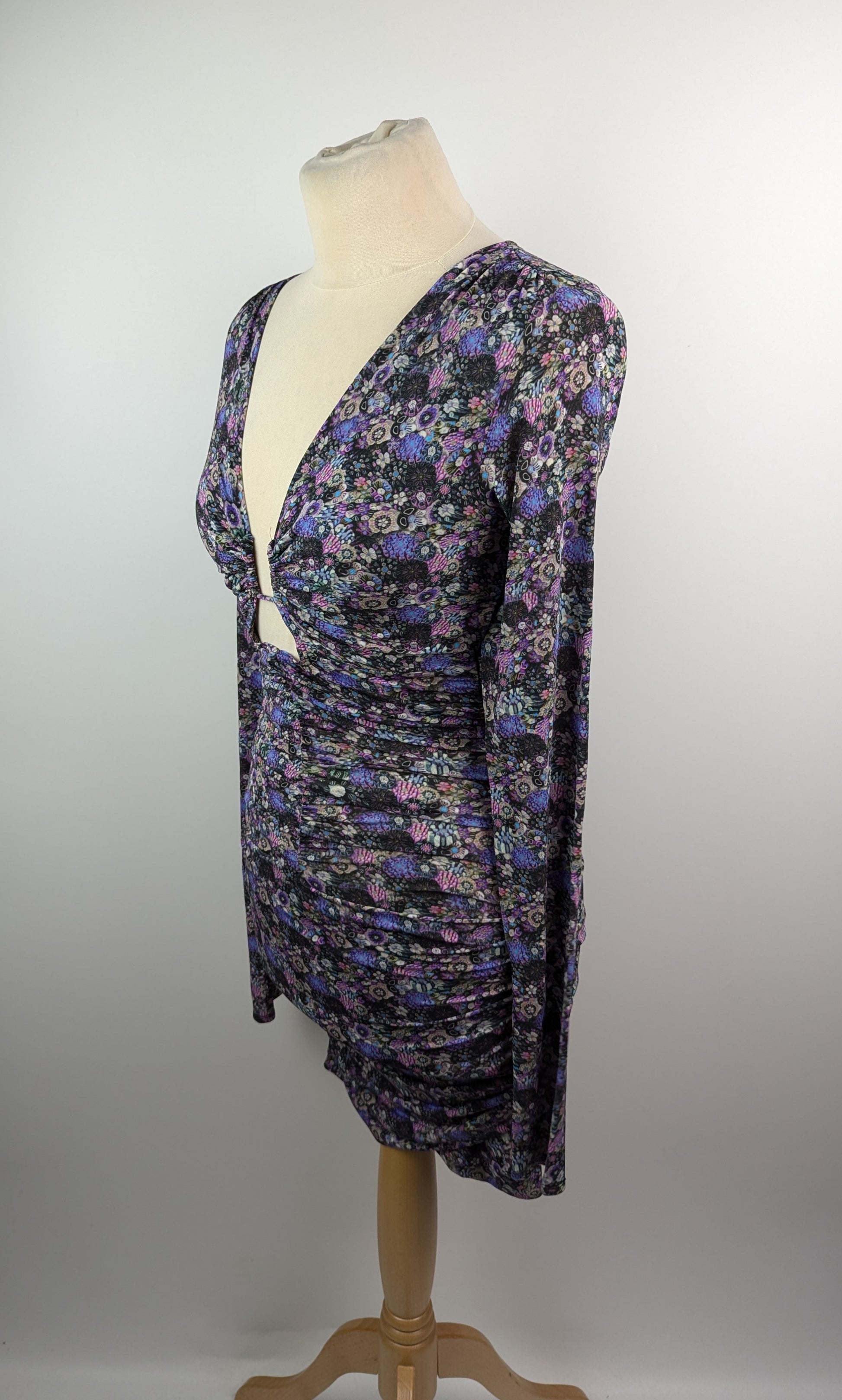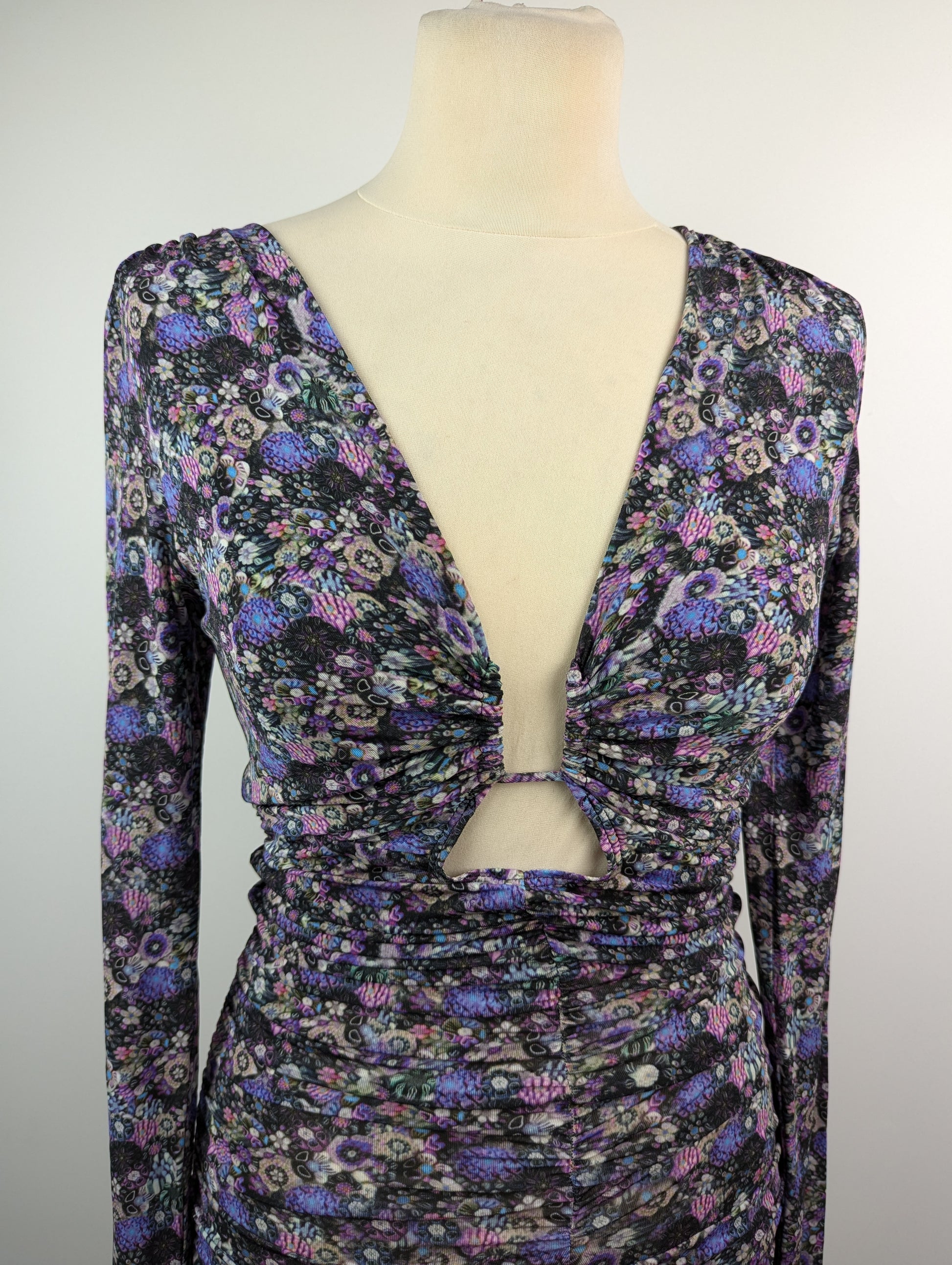 The Jordana mini dress by Isabel Marant embodies Parisian minimalism with its ruched jersey fabric that contours the body for a sleek fit. Featuring long sleeves, a deep V-neckline, and distinctive front cut-out accents, this dress offers a refined yet edgy silhouette. Its above-the-knee length and straight hem complete the sophisticated design. invisible side zip to fasten.