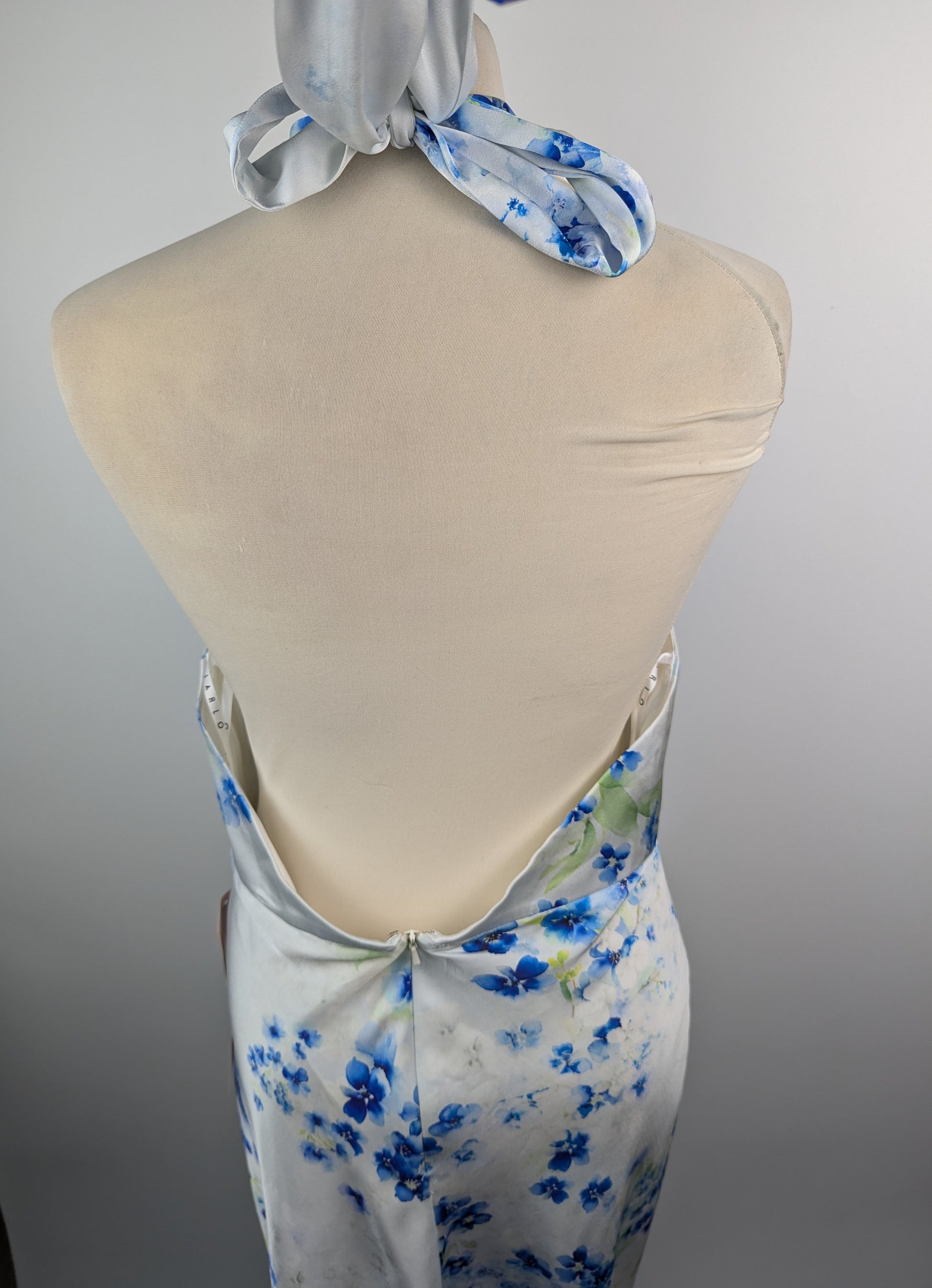 This dress features an open back with a cowl neckline and a tie-fastened halter neck. It showcases a floral print and falls to a standard length, making it an ideal choice for black-tie occasions, proms, or as a wedding guest ensemble.