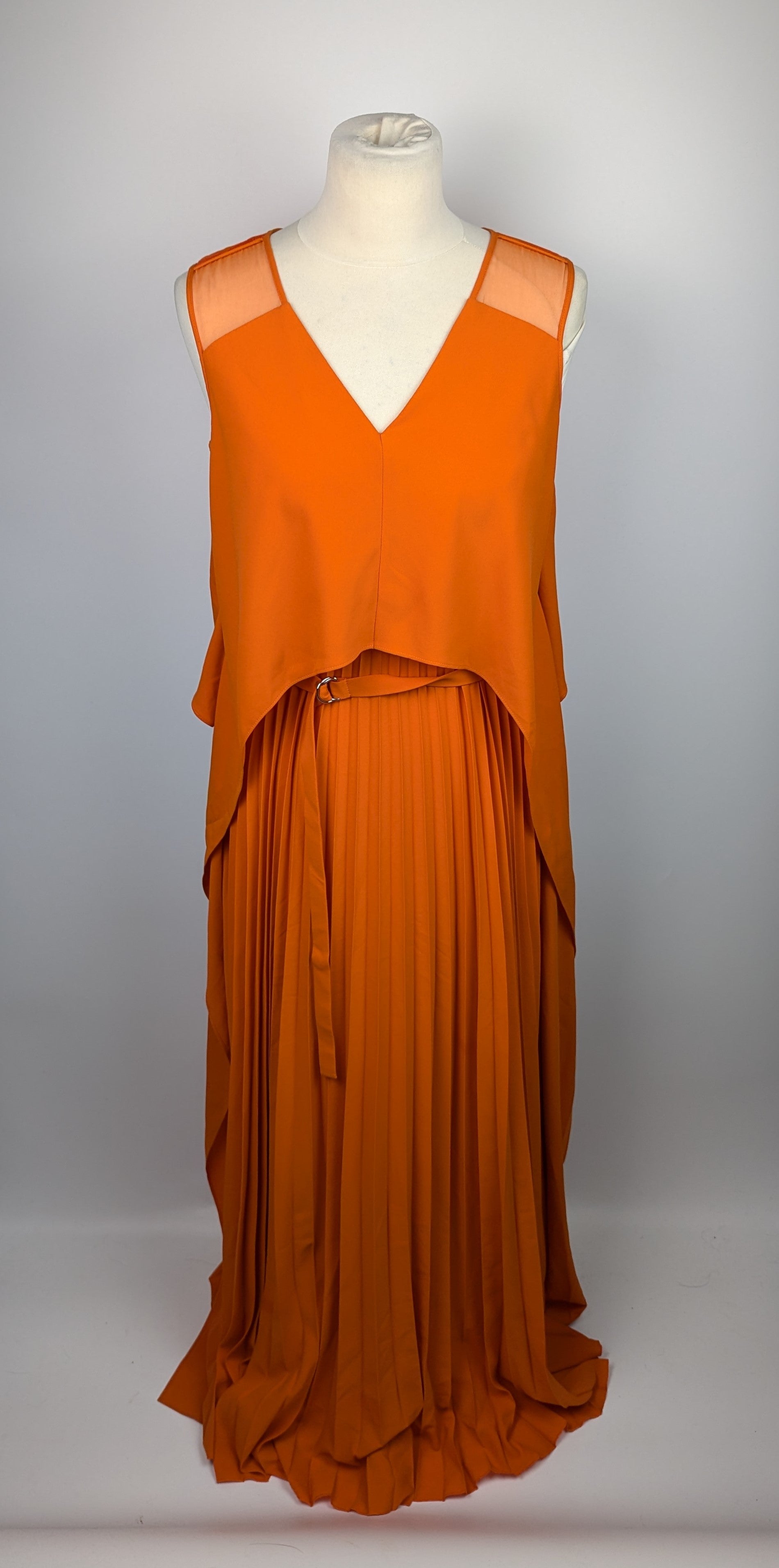 Elegantly pleated and featuring a removable belt, this party/wedding dress by Hugo Boss exudes sophistication. The skirt is layered with flowing ruffles, while the top is made of mesh fabric for a touch of elegance.
