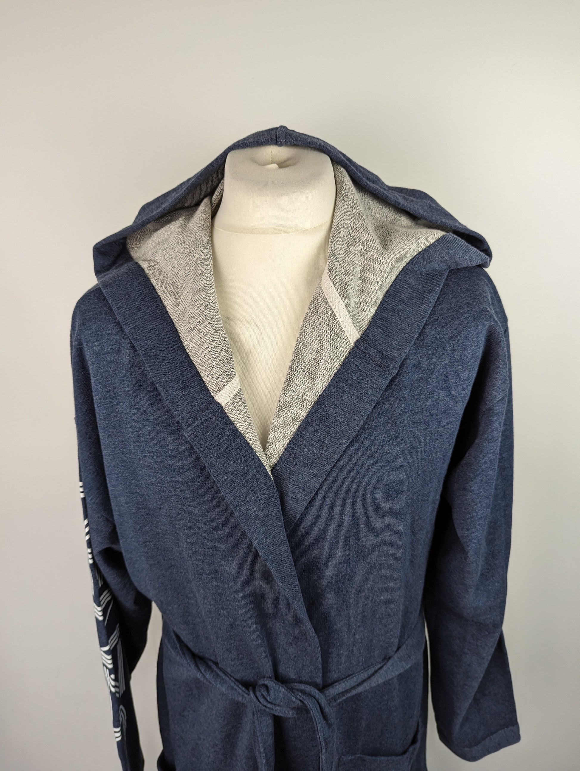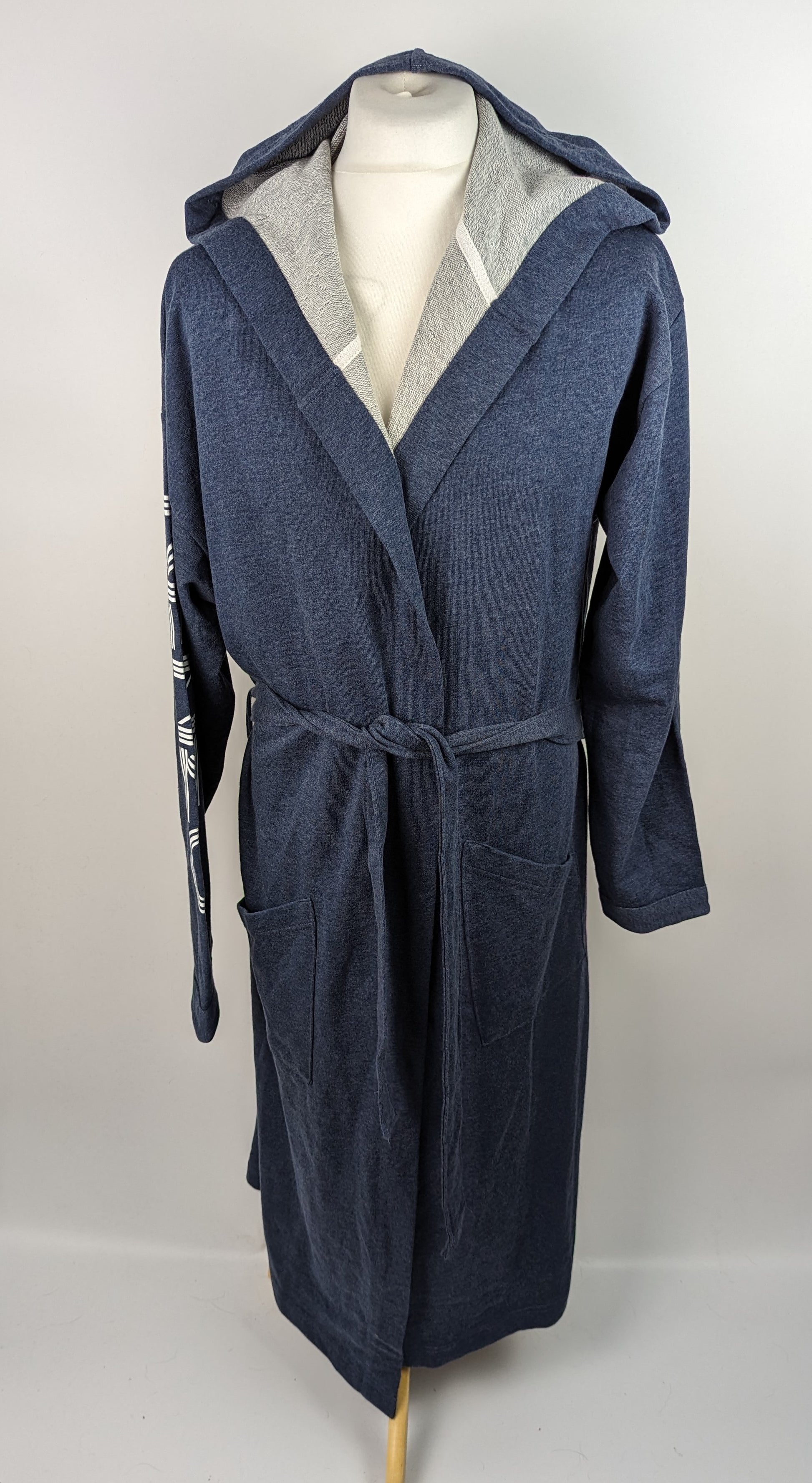 KENZO PARIS Men's Dressing Gown in Blue features the brand's logo on the sleeve and comes with a mid-length design and a belt to fasten.This dressing gown is made of a blend of 67% cotton and 33% polyester.