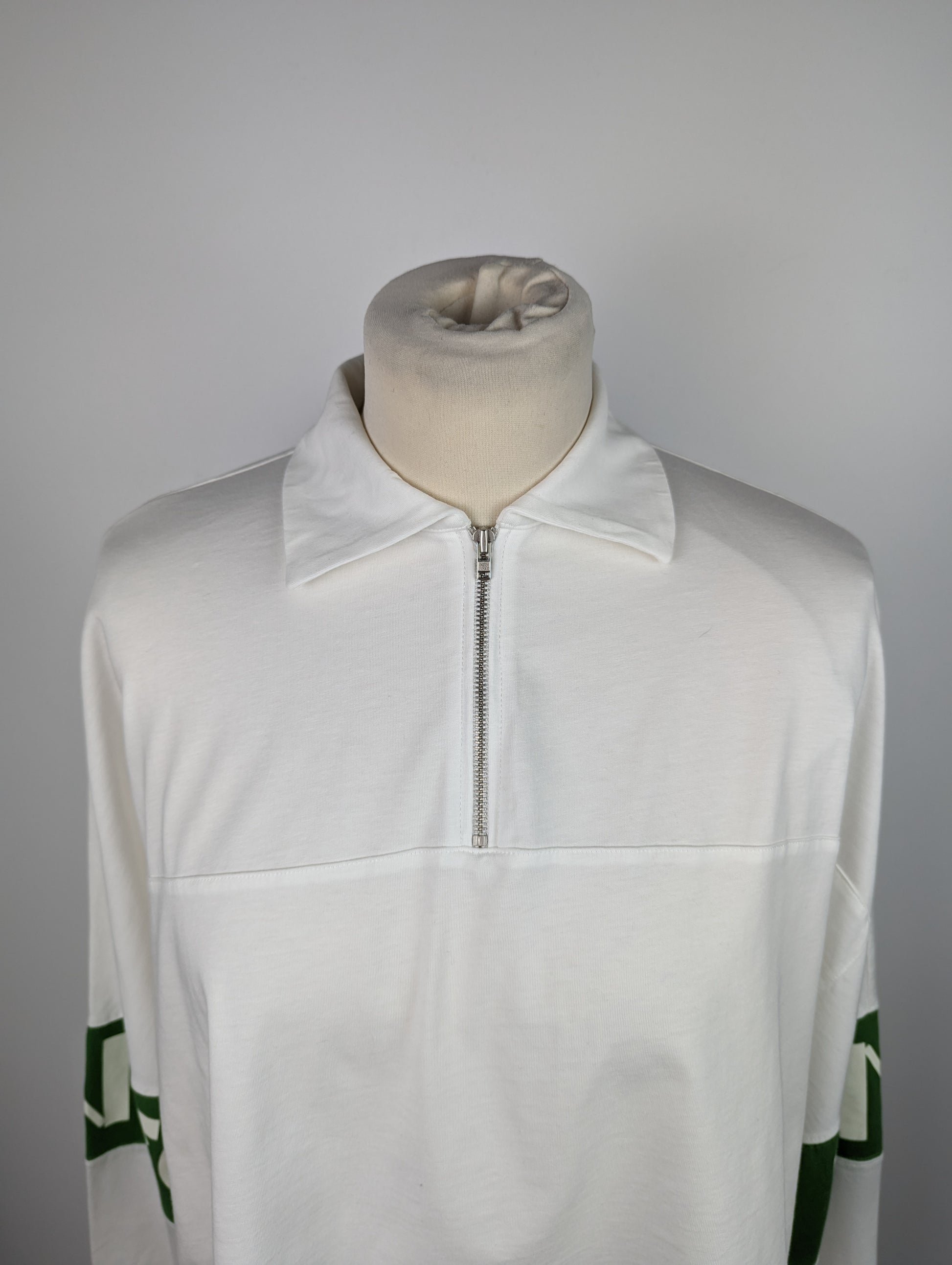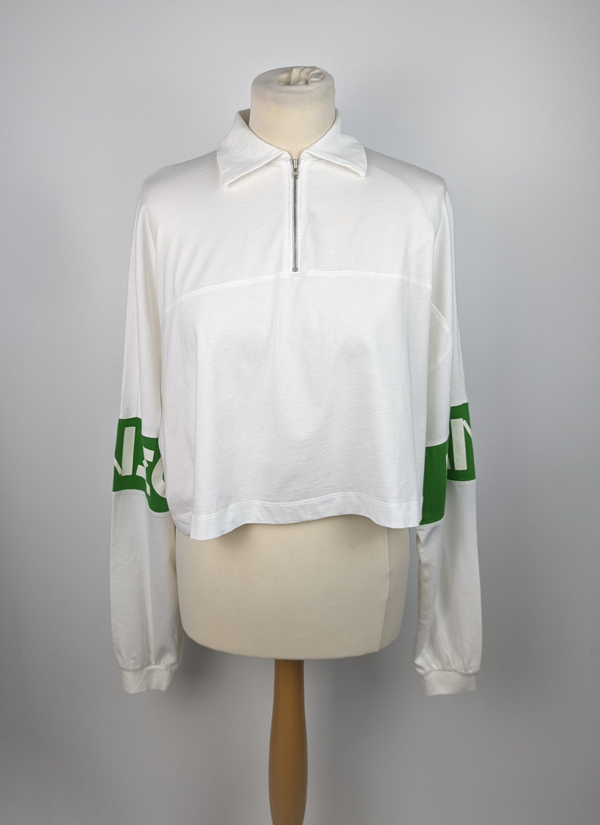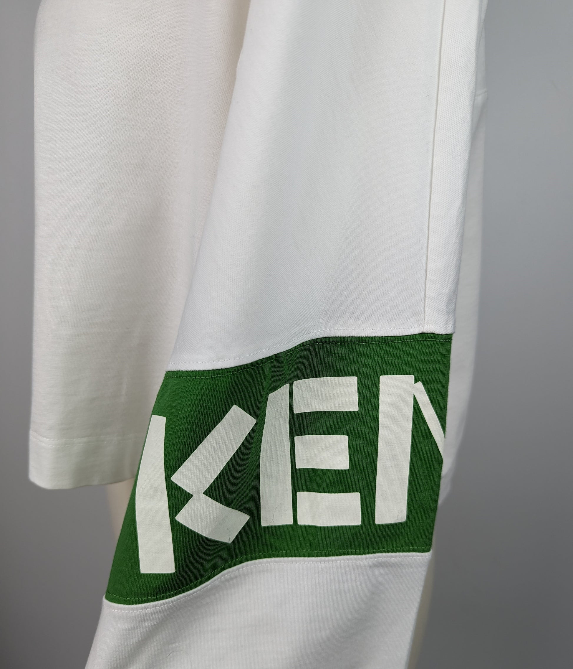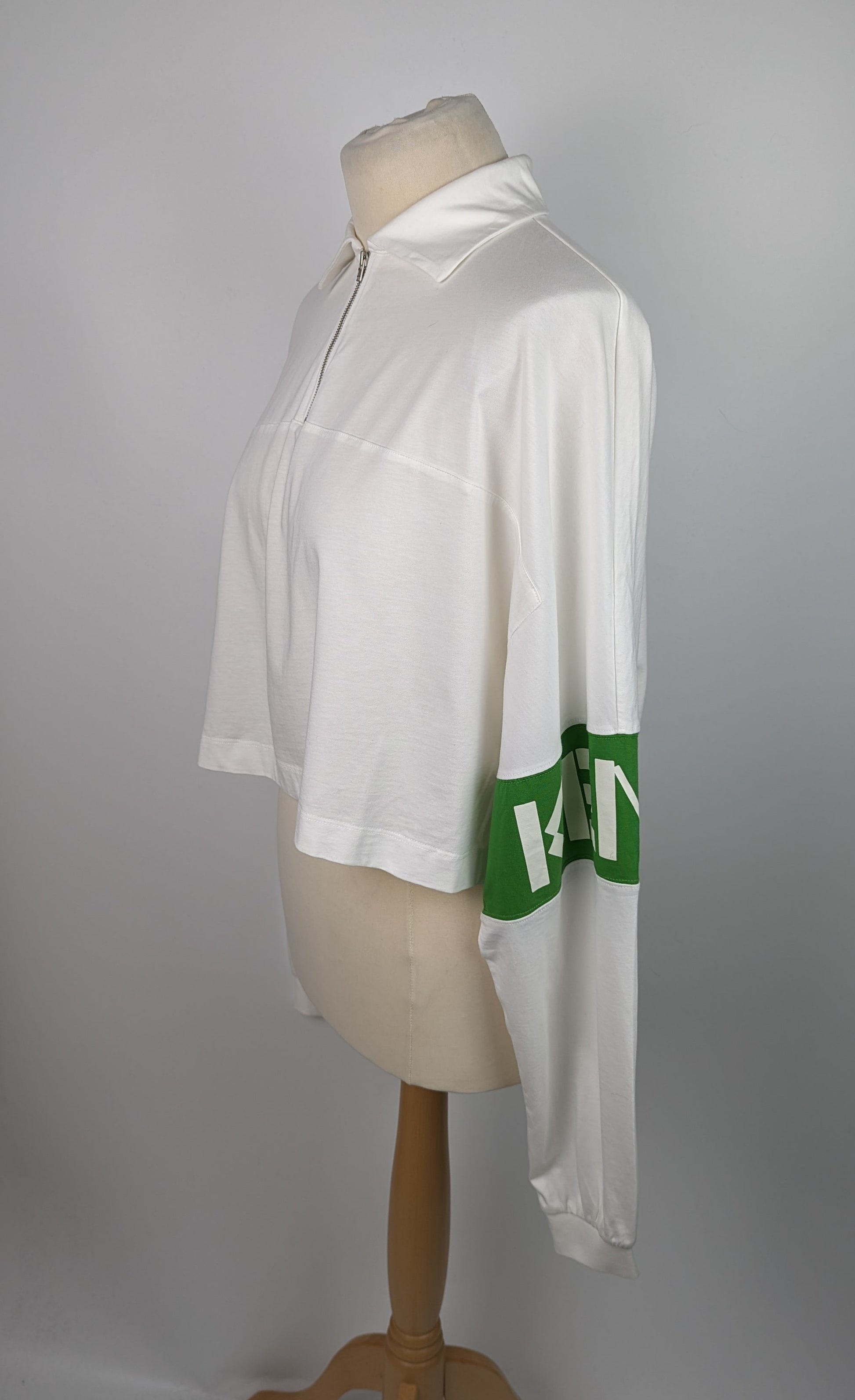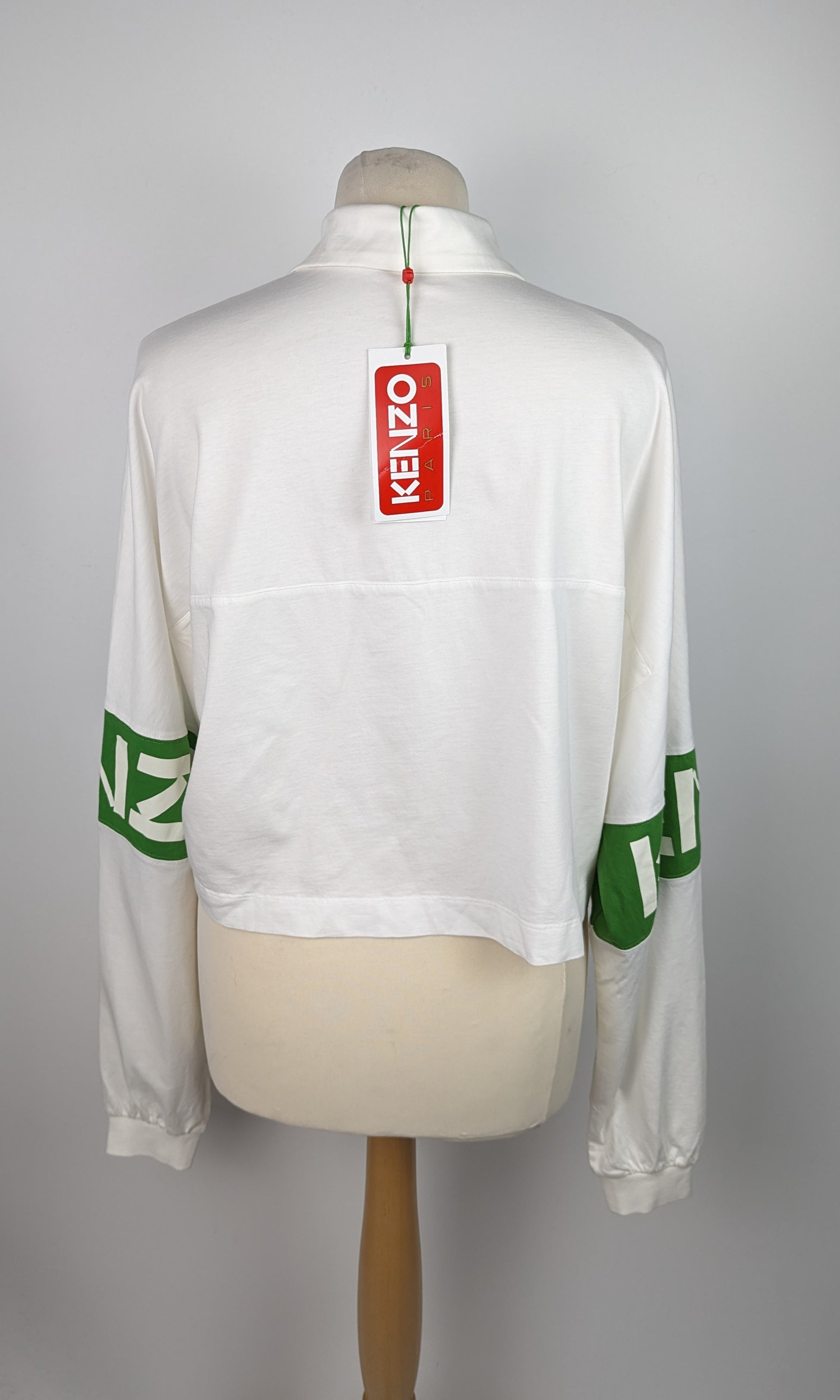 Experience the modern and sleek design of the KENZO Womens Cropped Tee. Crafted with a half zip and an oversized fit, this tee is perfect for any occasion. The white base is accented with a green section on the sleeve, showcasing the iconic KENZO logo. Made of 100% cotton, this tee offers a comfortable and stylish cropped fit.