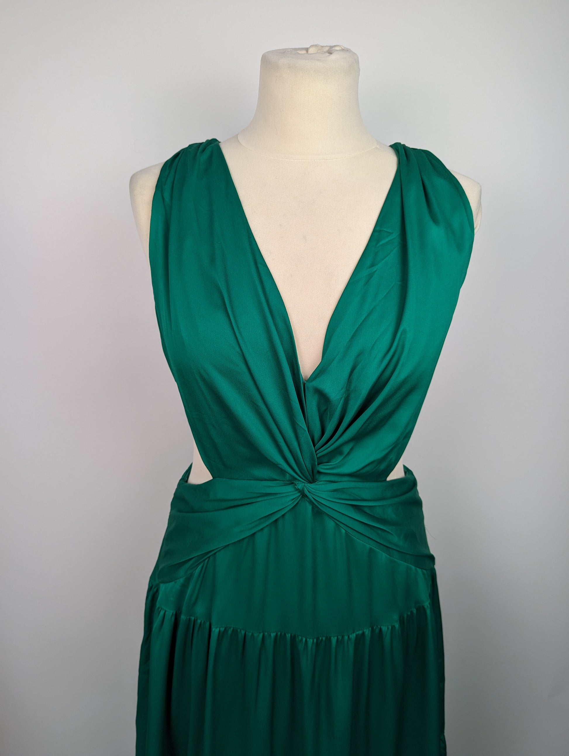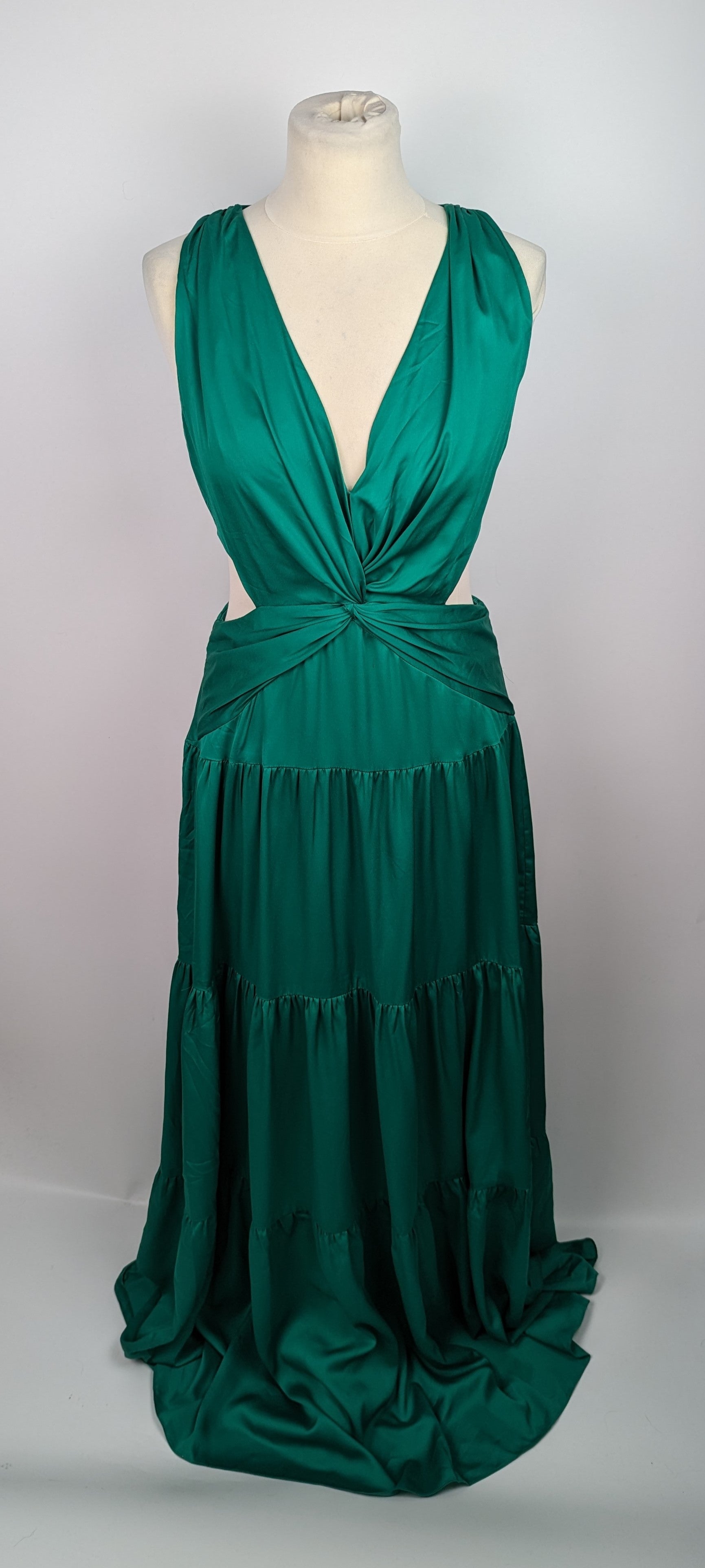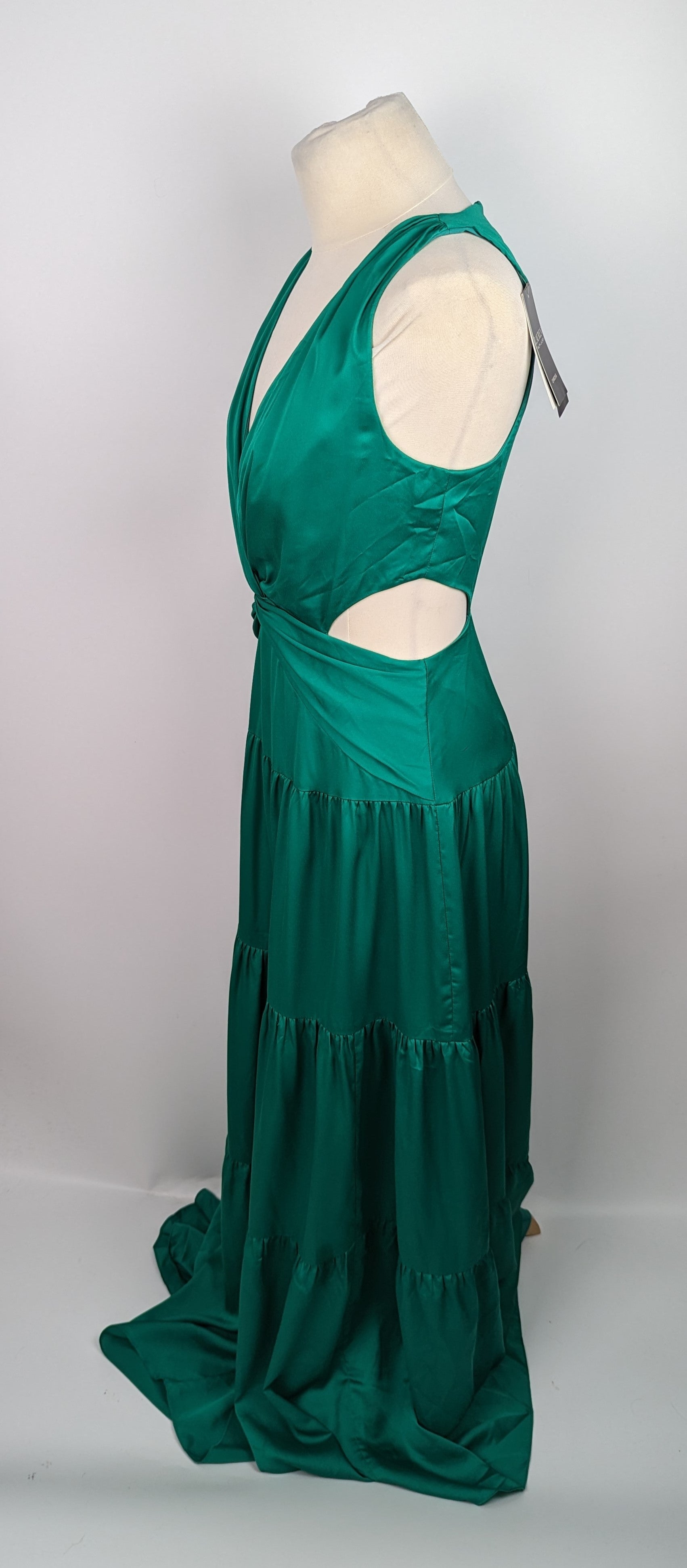 Crafted with meticulous attention to detail, this polyester gown offers a perfect blend of elegance and sophistication. Designed to flatter with its fitted shape, this gown showcases a low-cut v-neck. The maxi length adds a touch of grace, while the sleeveless design allows for unrestricted movement with a hint of modernity. With a convenient zip fastening at the back, allowing ease, ensuring effortless elegance for your special occasions. The cut-out style pattern on both sides adds a unique flair, elevating the gown's aesthetic appeal to new heights.