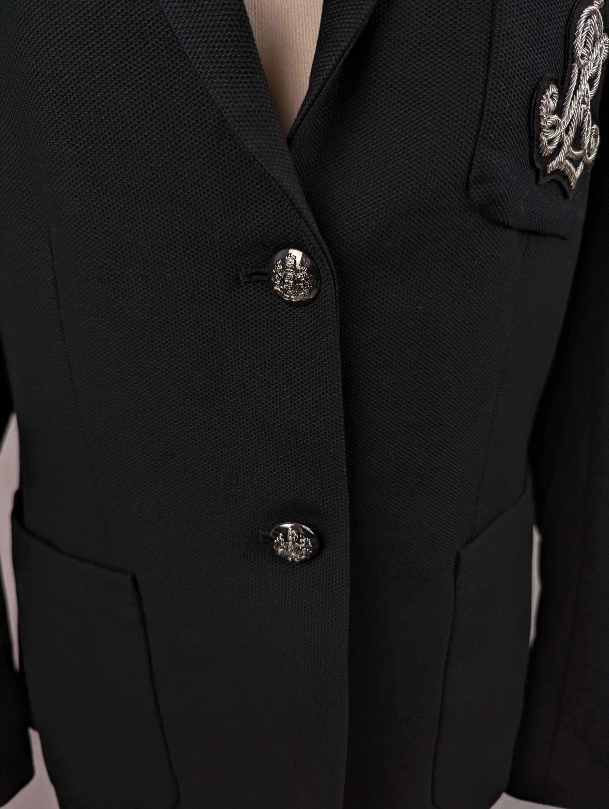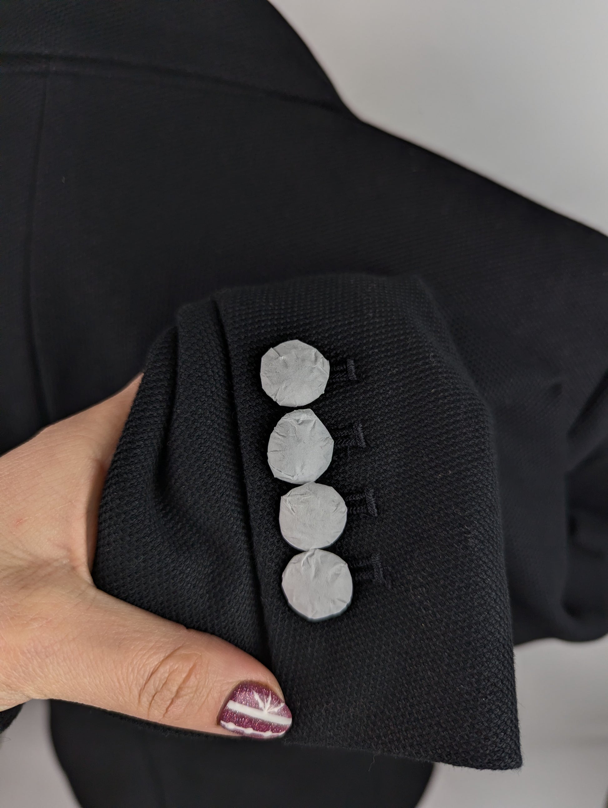 Premium silver-tone buttons along the front and cuffs provide both functionality and decorative appeal.