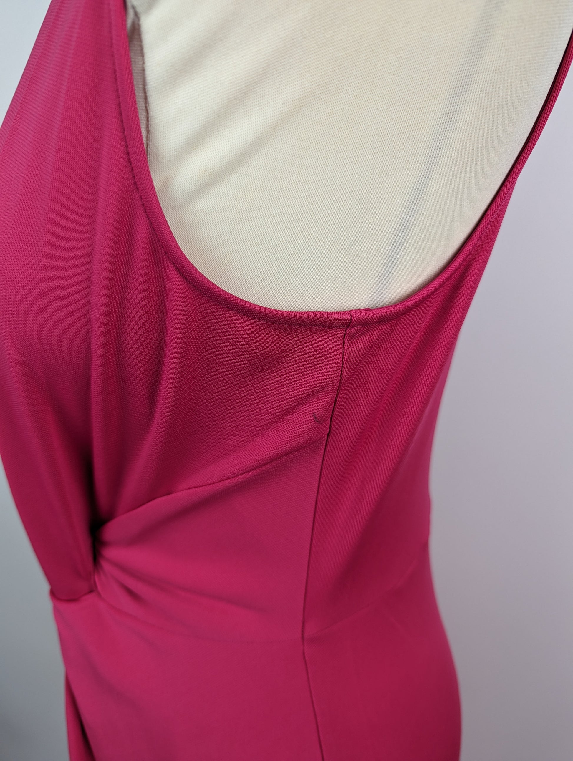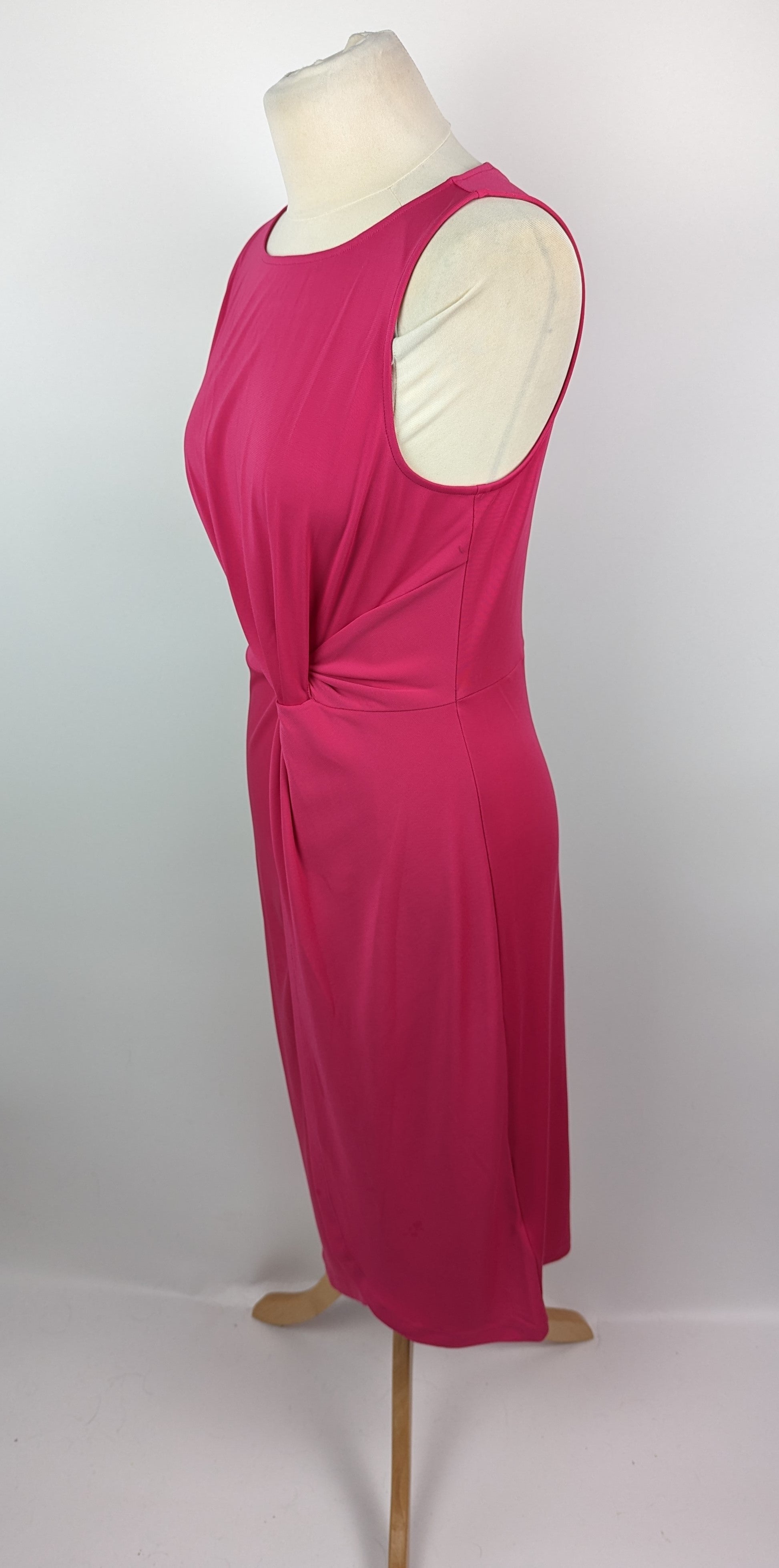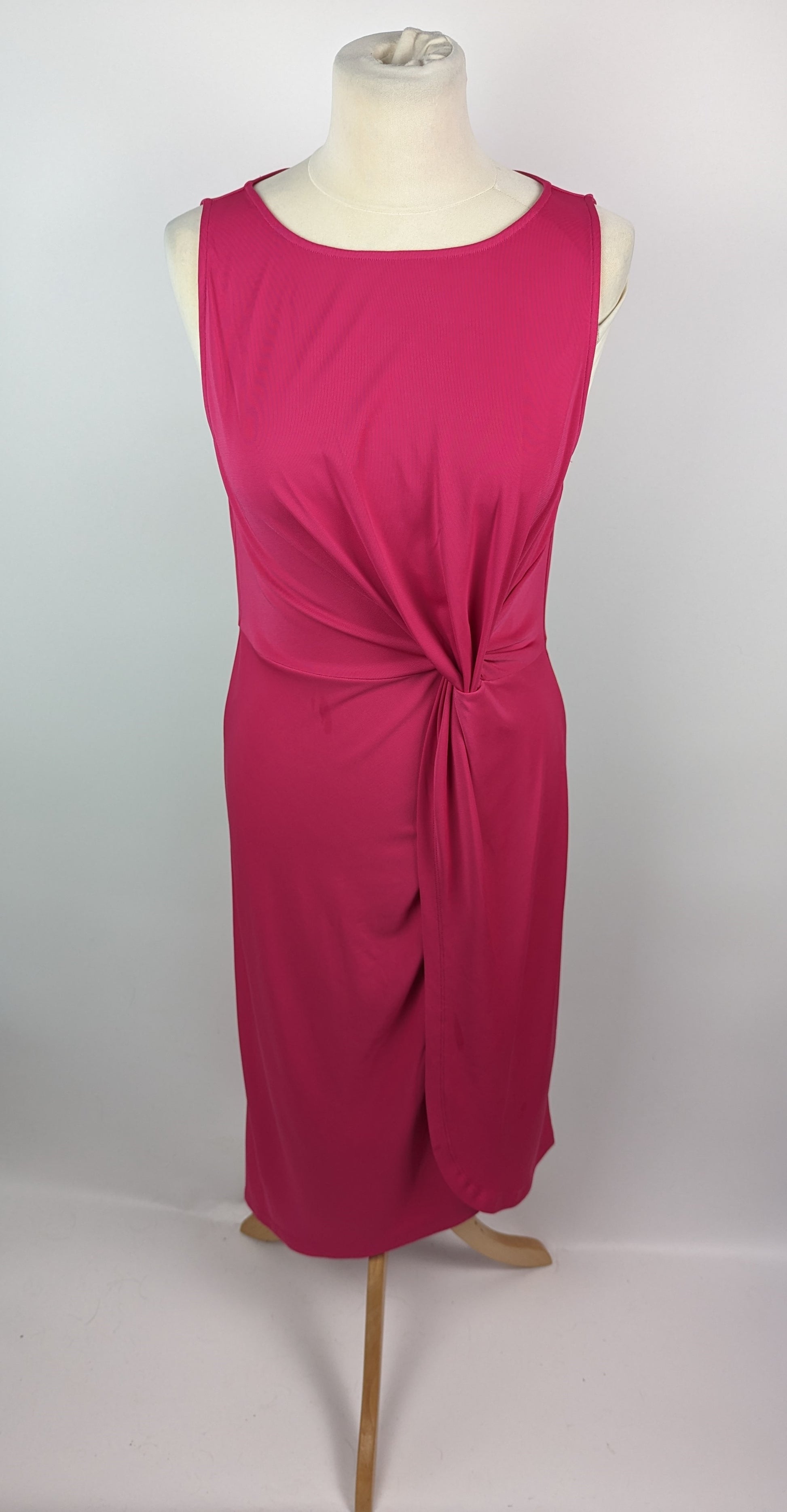 Its body-skimming fit hugs the bust, waist, and hips, while the mid-stretch fabric ensures comfort. The boatneck and sleeveless design are elevated by the offset fixed-twist detail at the front. A seamed waist and crossover skirt add to the elegant look, while the concealed back zip with hook-and-eye closure provides a seamless finish.