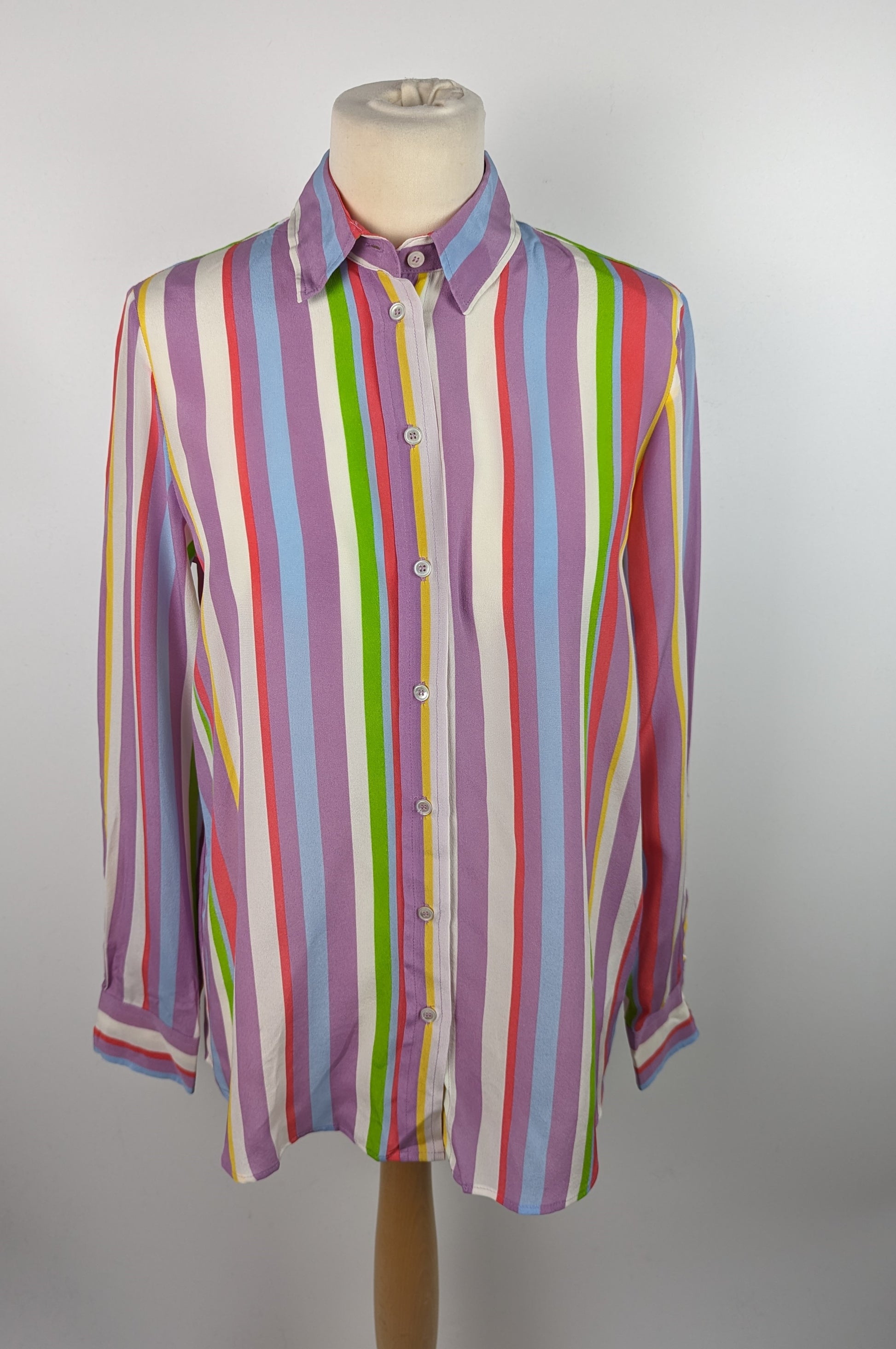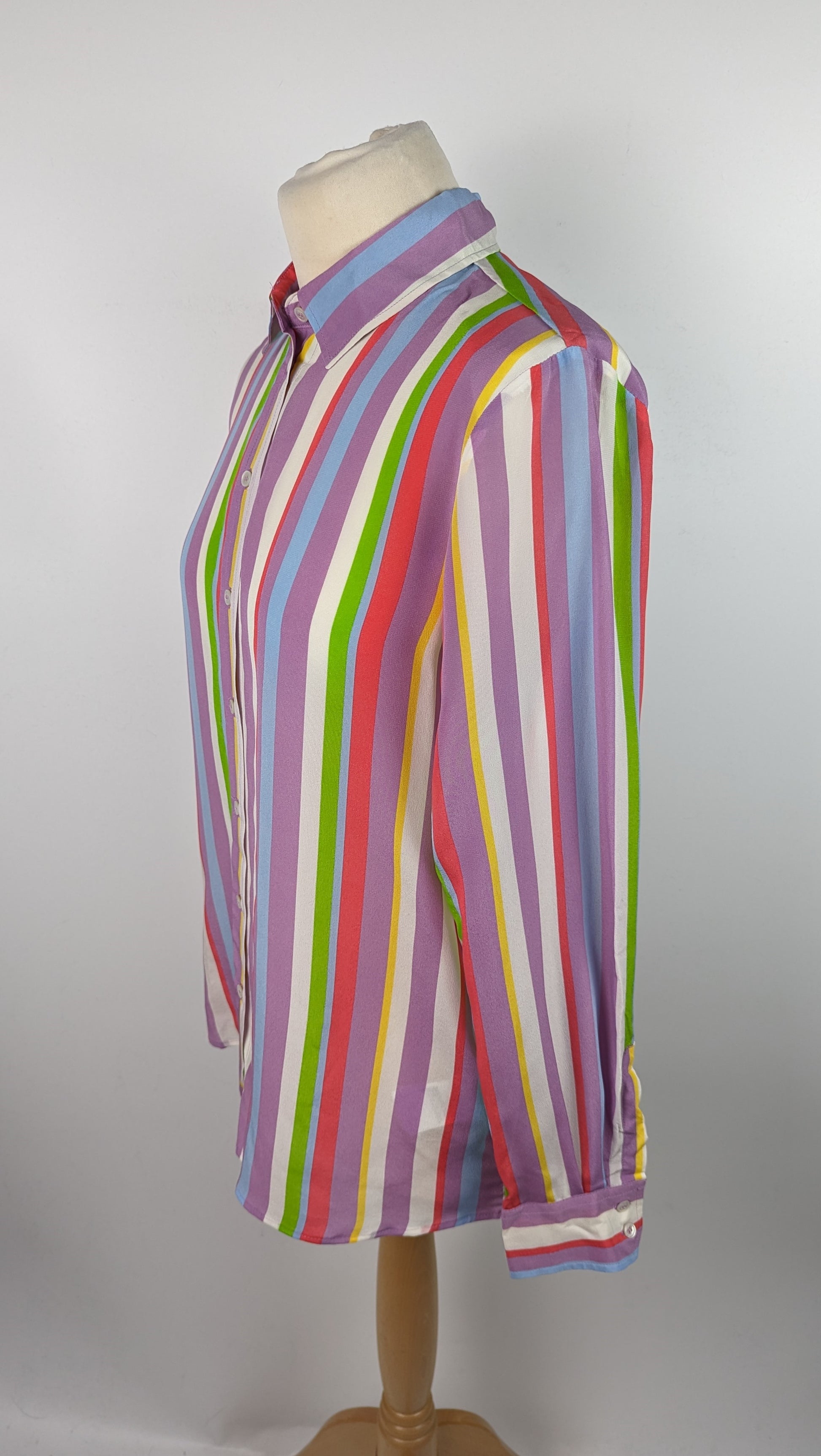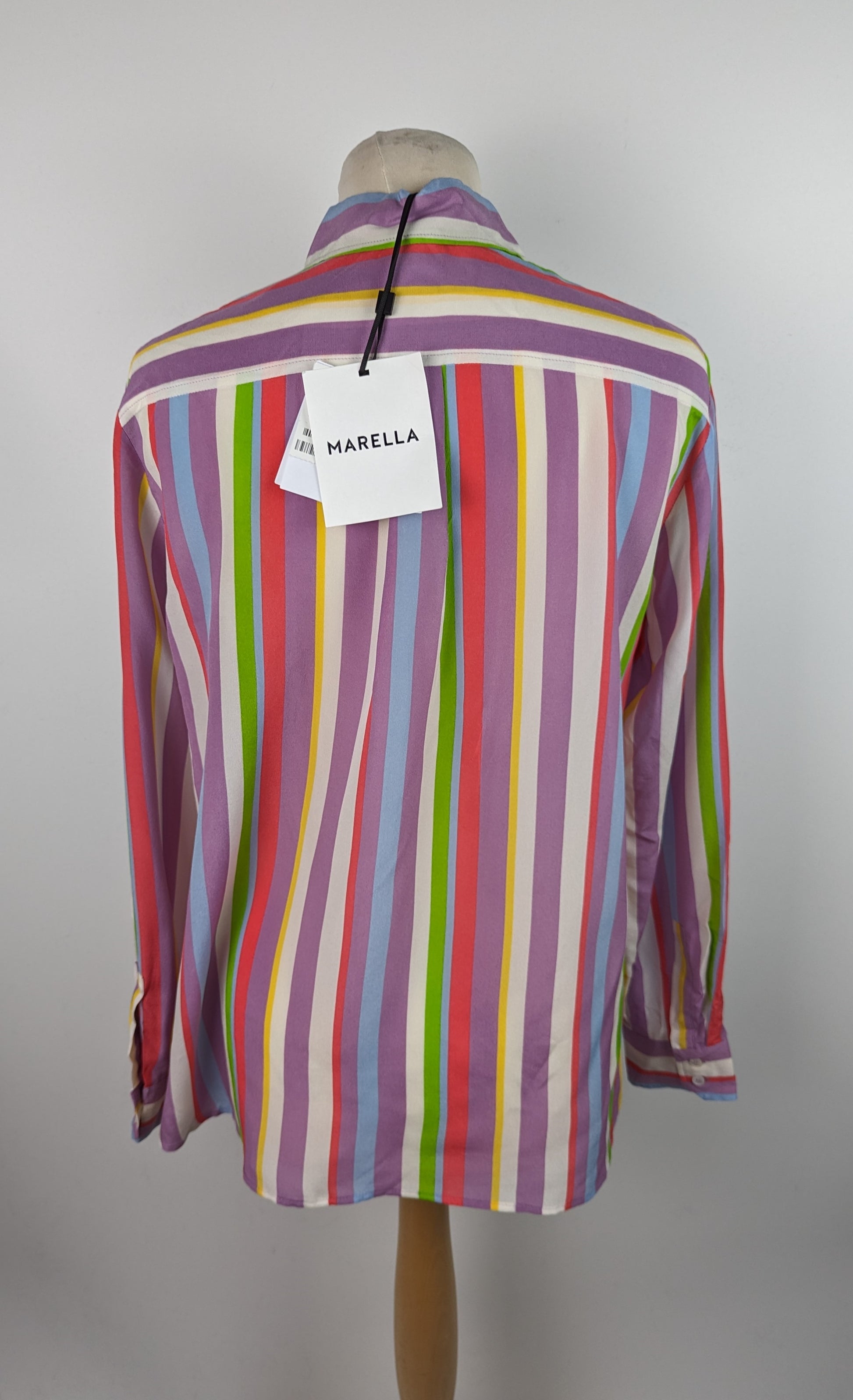 Fashion becomes wearable art in this vibrant Paul Shirt from MARELLA. The shirt has been crafted from 100% silk, creating a crepe de chine fabric for an effortlessly elegant look and a breathable, lightweight appeal that is both comfortable and stylish. Framed with long sleeves and a smart shirt collar, button down fastenings complete the blouse. The striking lilac and multi bold stripe pattern makes the piece a walking statement.