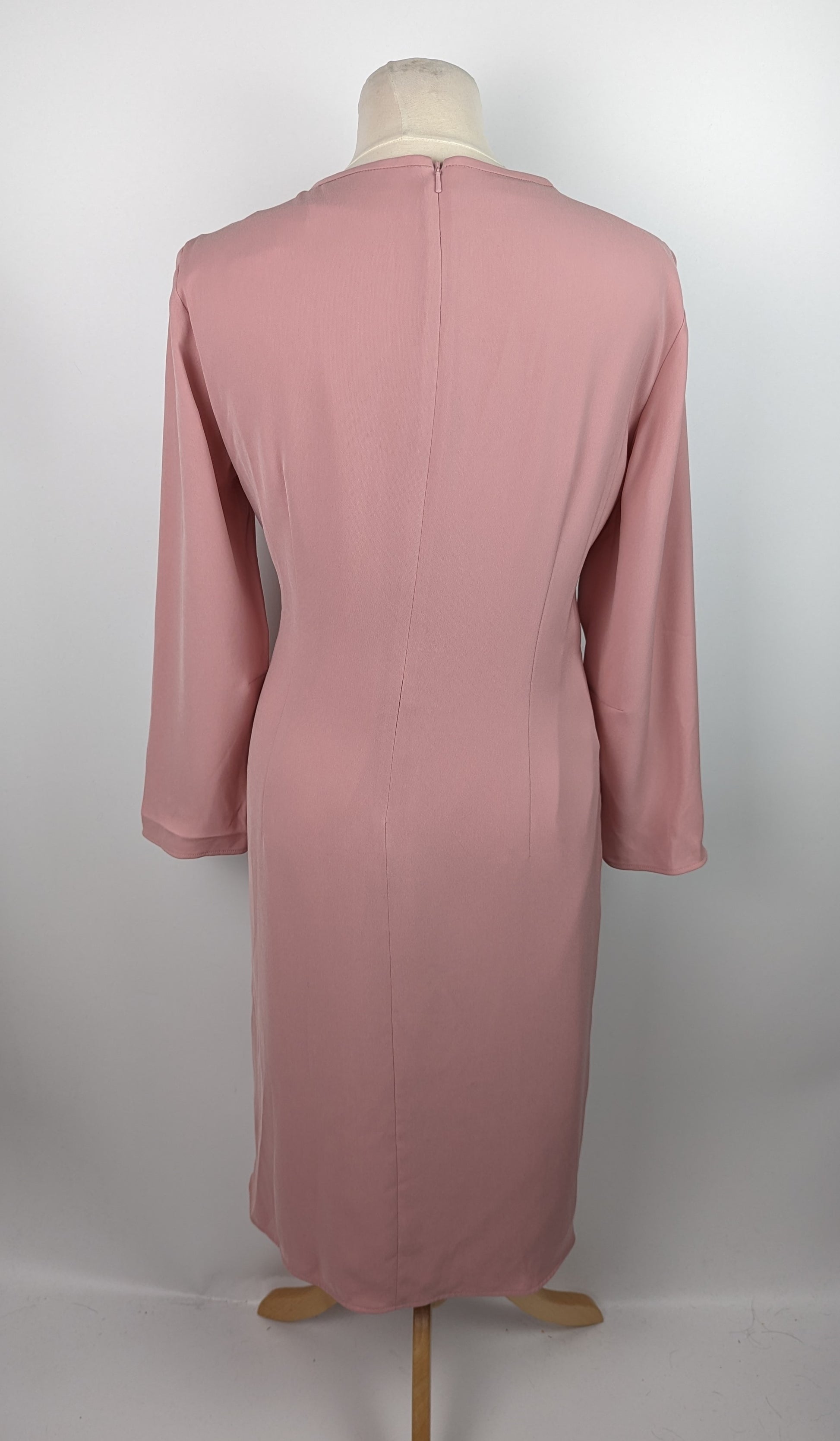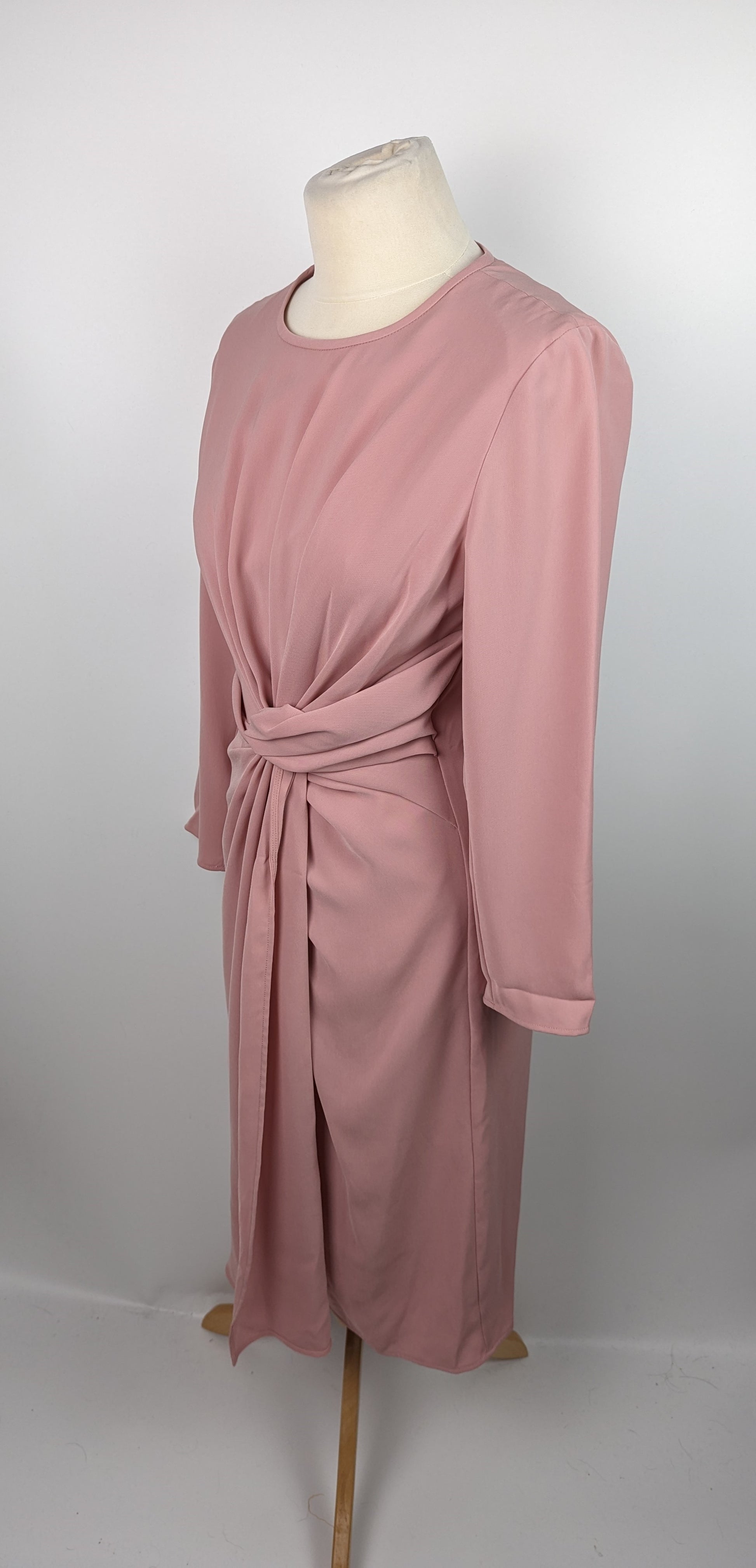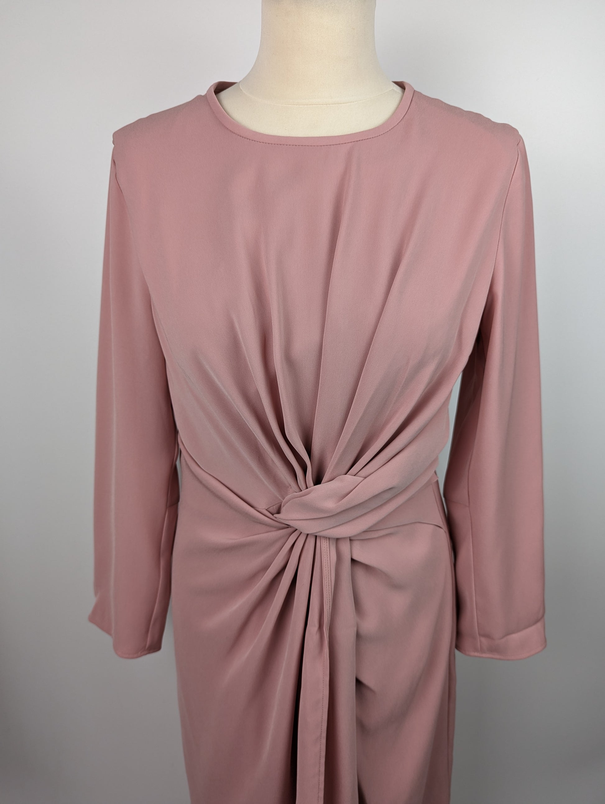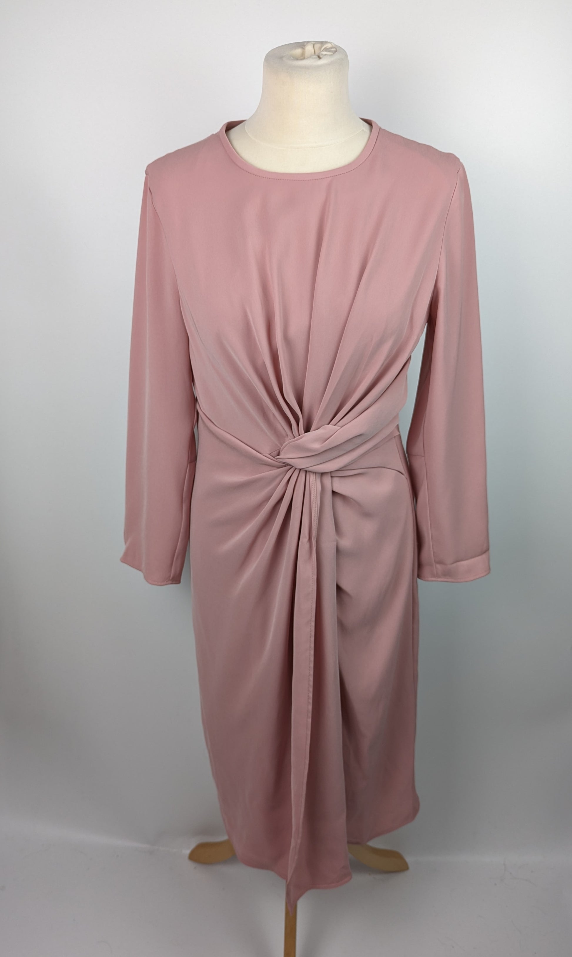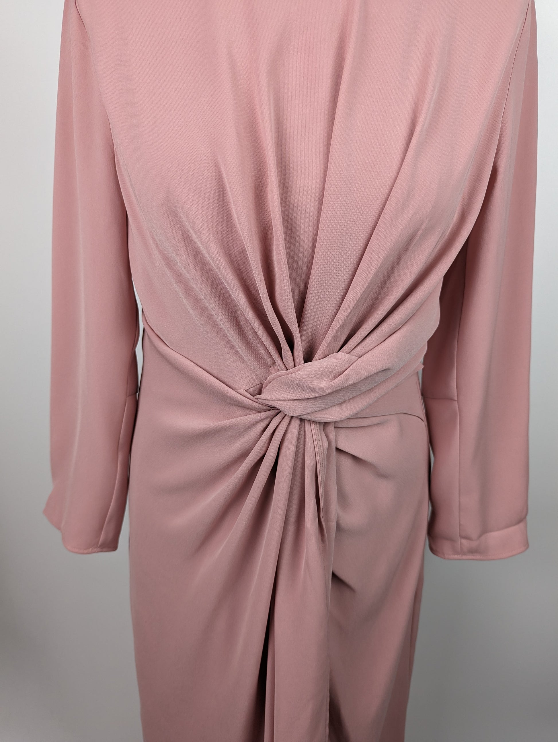 This pink MAX MARA dress features a twisted tie detail at the front, a zip closure in the back, and is lined with a mid-length finish. It's suitable for both formal and casual occasions. 73% Triacetate and 27% polyester.
