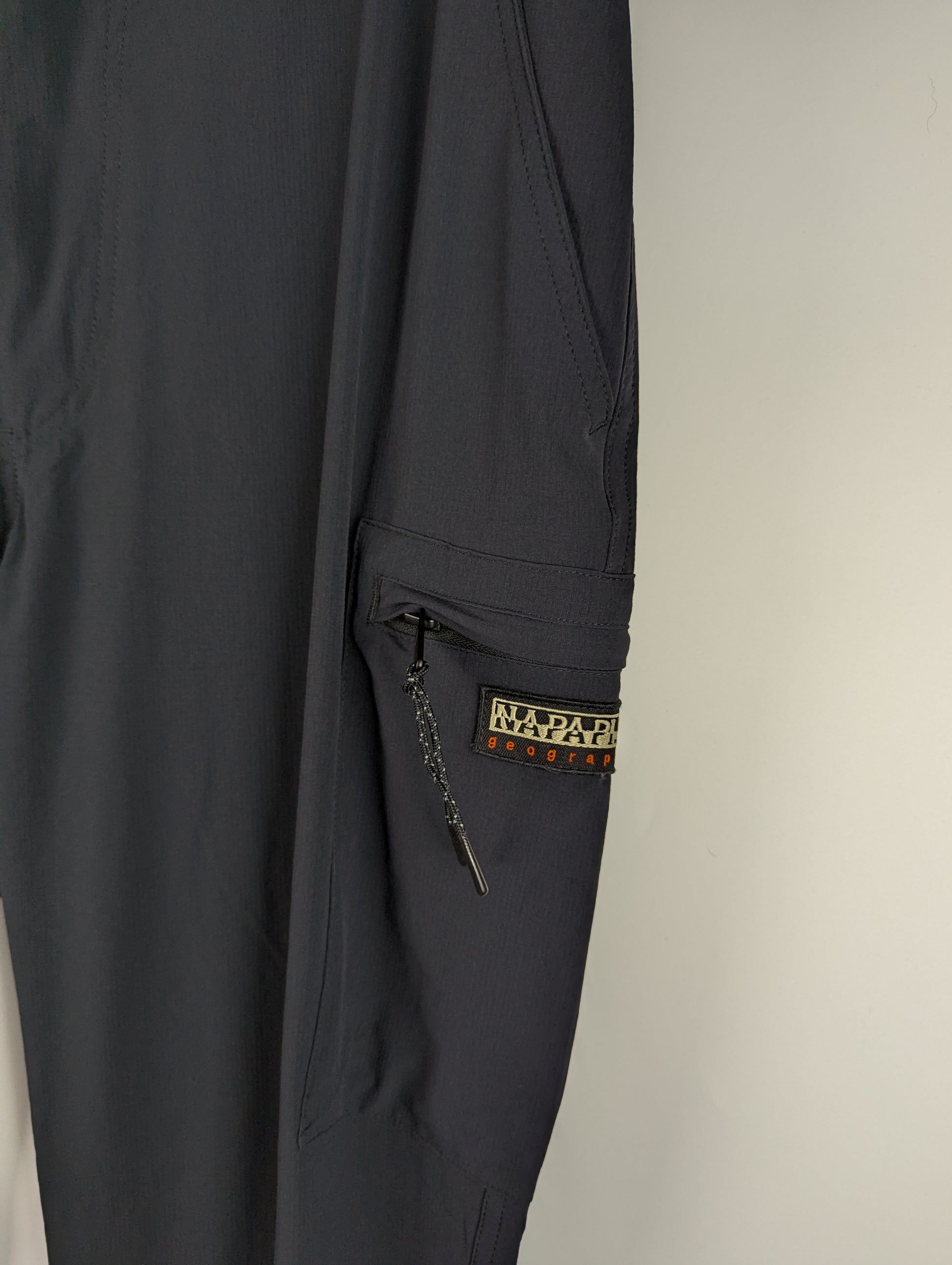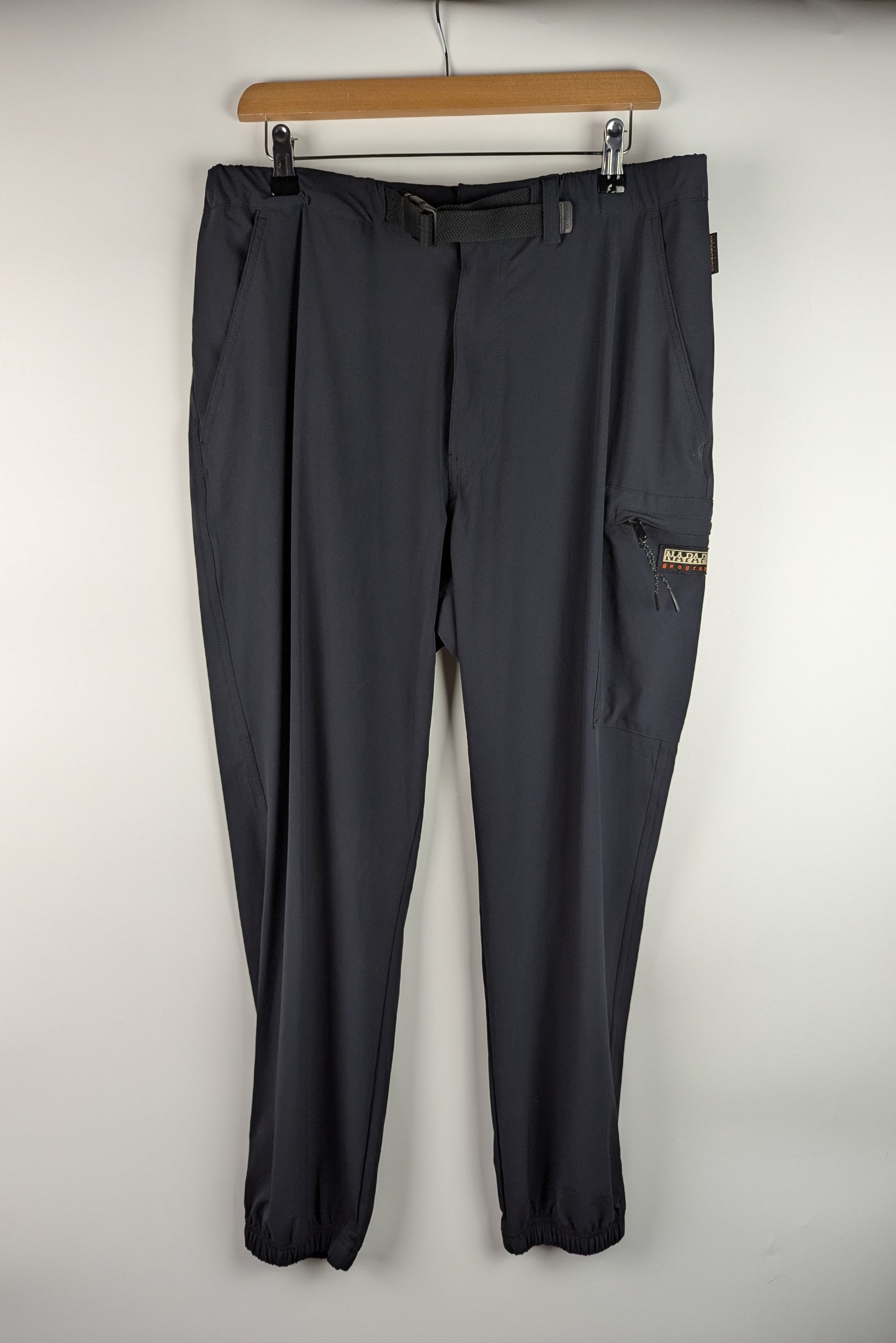 These trousers feature an elastic waistband with a clip closure and adjustable strap for a secure fit. They include a zip and snap button fastening, two open side pockets, an open back pocket, and a zippered cargo pocket. The elasticated cuffs provide added comfort and a tailored look.