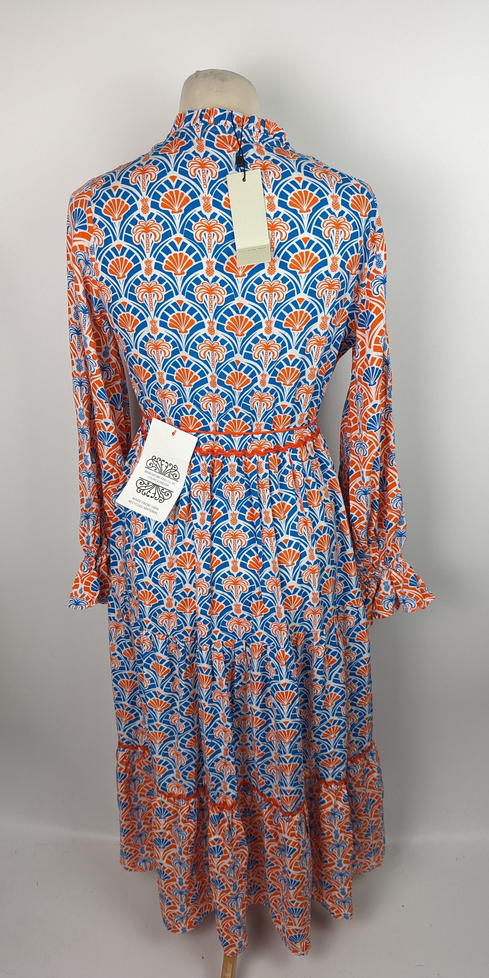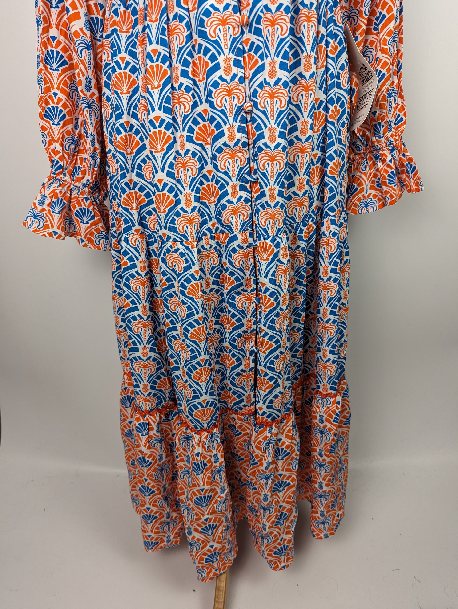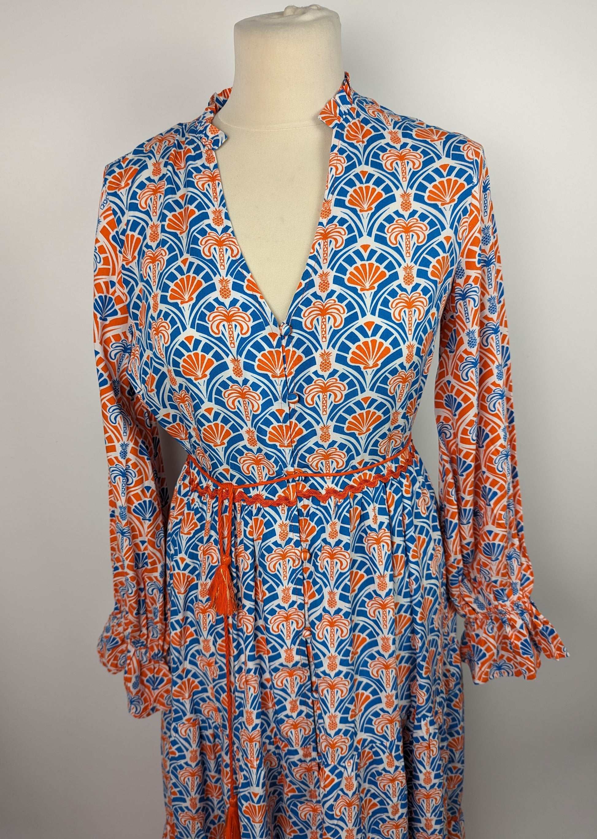 Beautiful midi dress from Never Fully Dressed. The Deco Palm Leonie Dress is a colourful, lightweight mid length style, perfect for late Spring to early Autumn days. Crafted in a soft 100% viscose, the dress features a tiered design patterned with Art Deco inspired fan print, overlaid with palm trees, pineapples and shells for a fun tropical beach feel. Twisted rope tassels and burnt orange ribbon finish off the dress with a flourish.