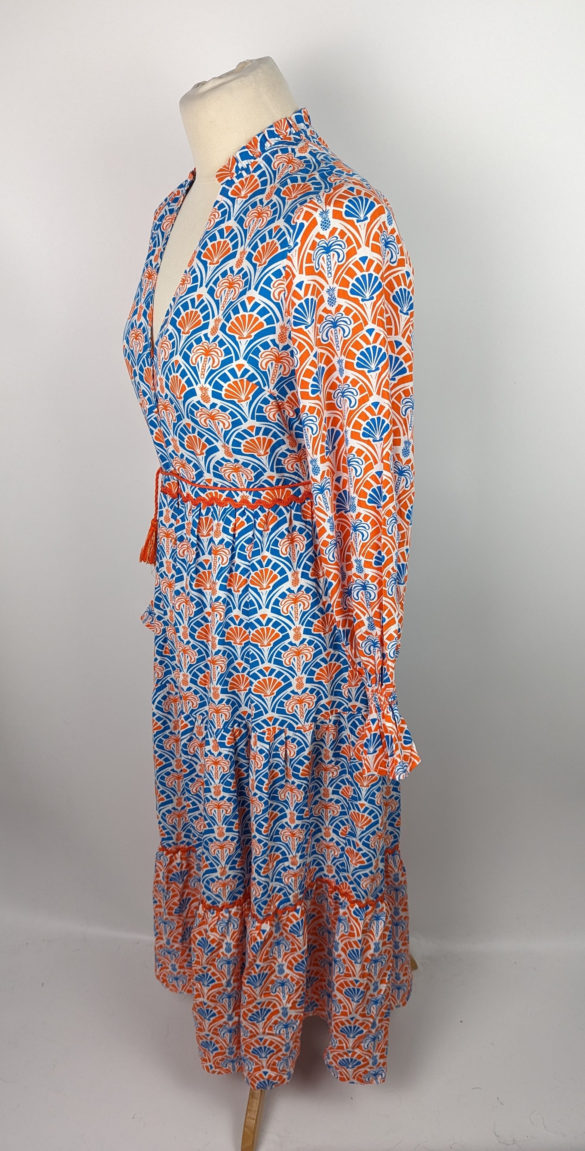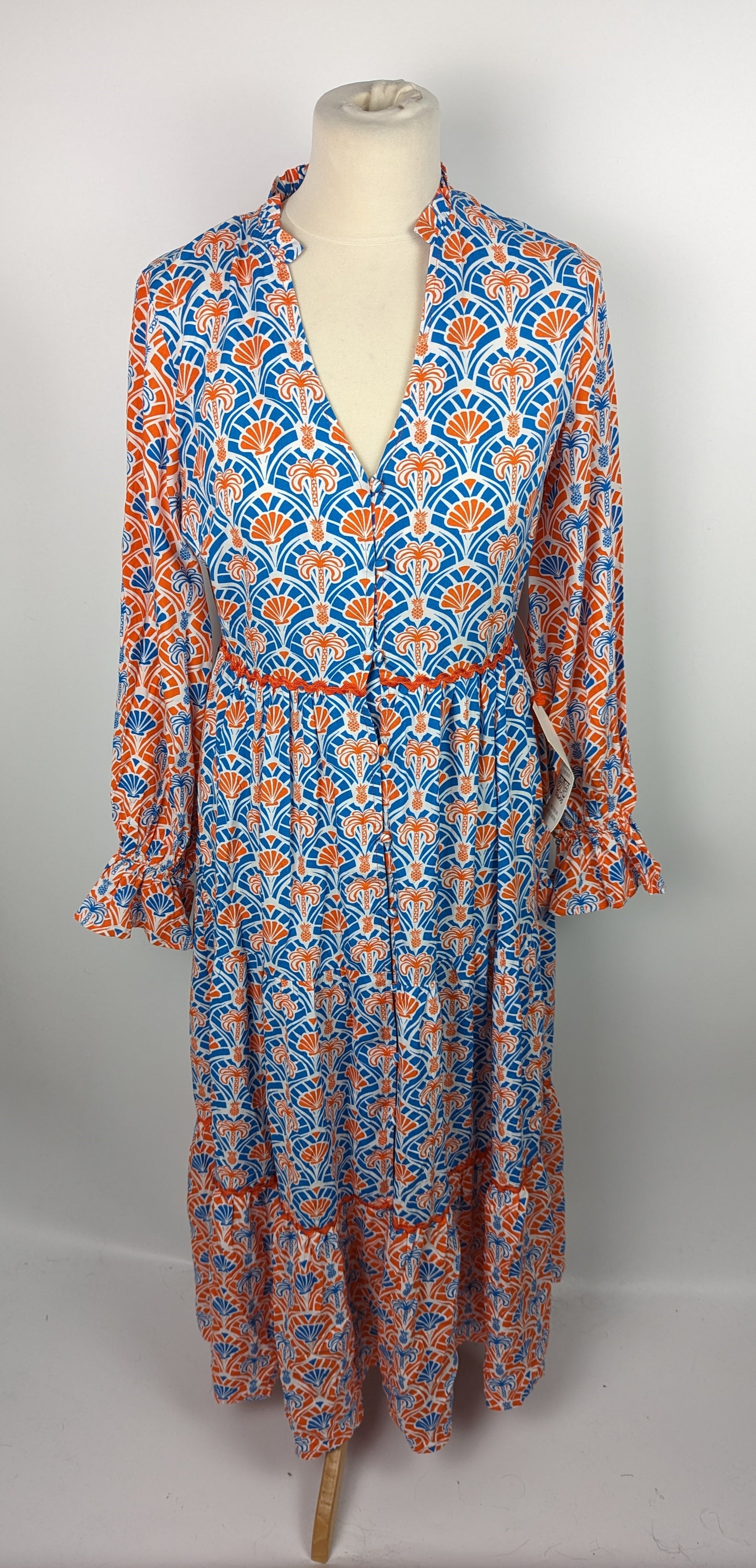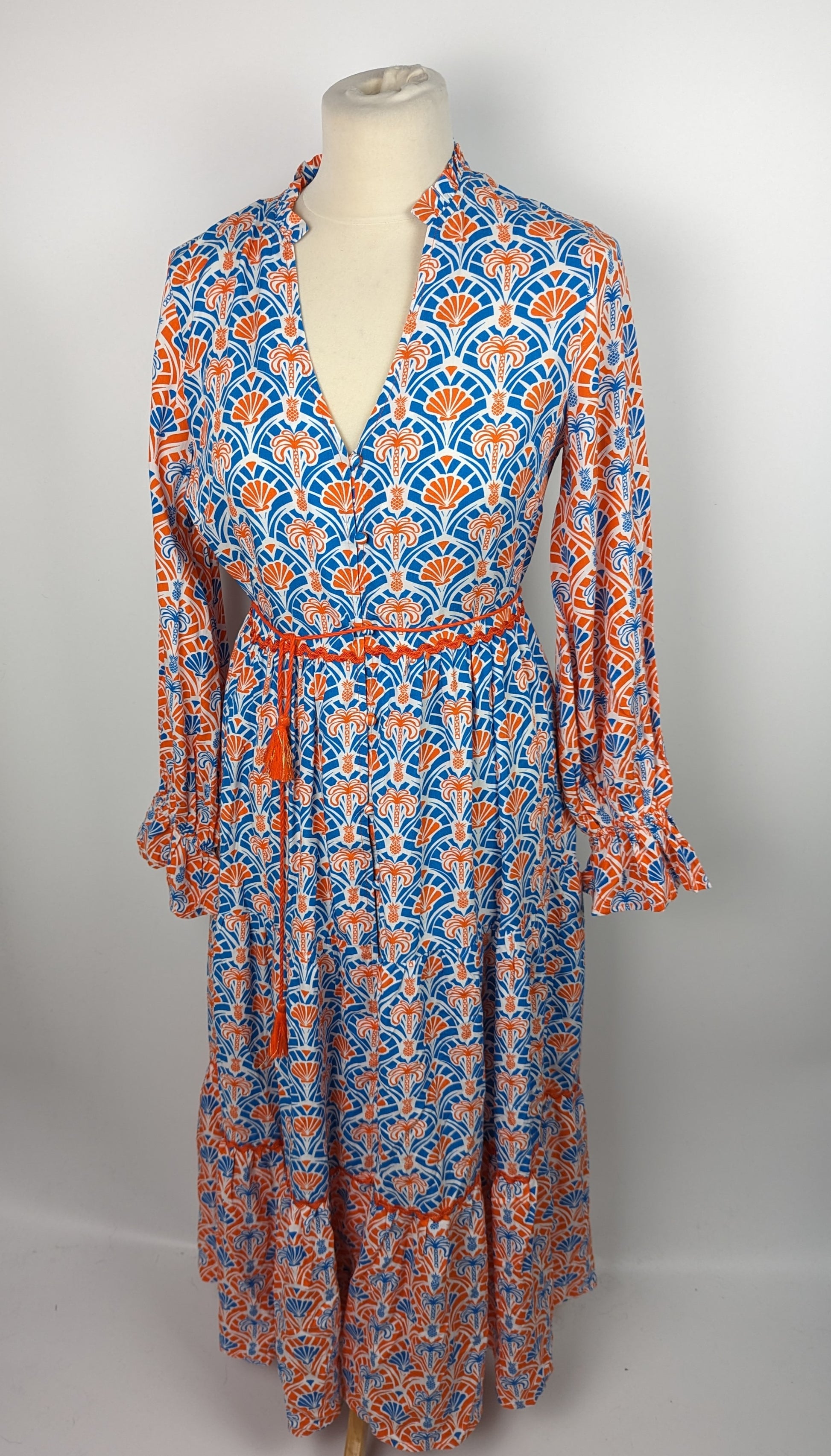 Beautiful midi dress from Never Fully Dressed. The Deco Palm Leonie Dress is a colourful, lightweight mid length style, perfect for late Spring to early Autumn days. Crafted in a soft 100% viscose, the dress features a tiered design patterned with Art Deco inspired fan print, overlaid with palm trees, pineapples and shells for a fun tropical beach feel. Twisted rope tassels and burnt orange ribbon finish off the dress with a flourish.