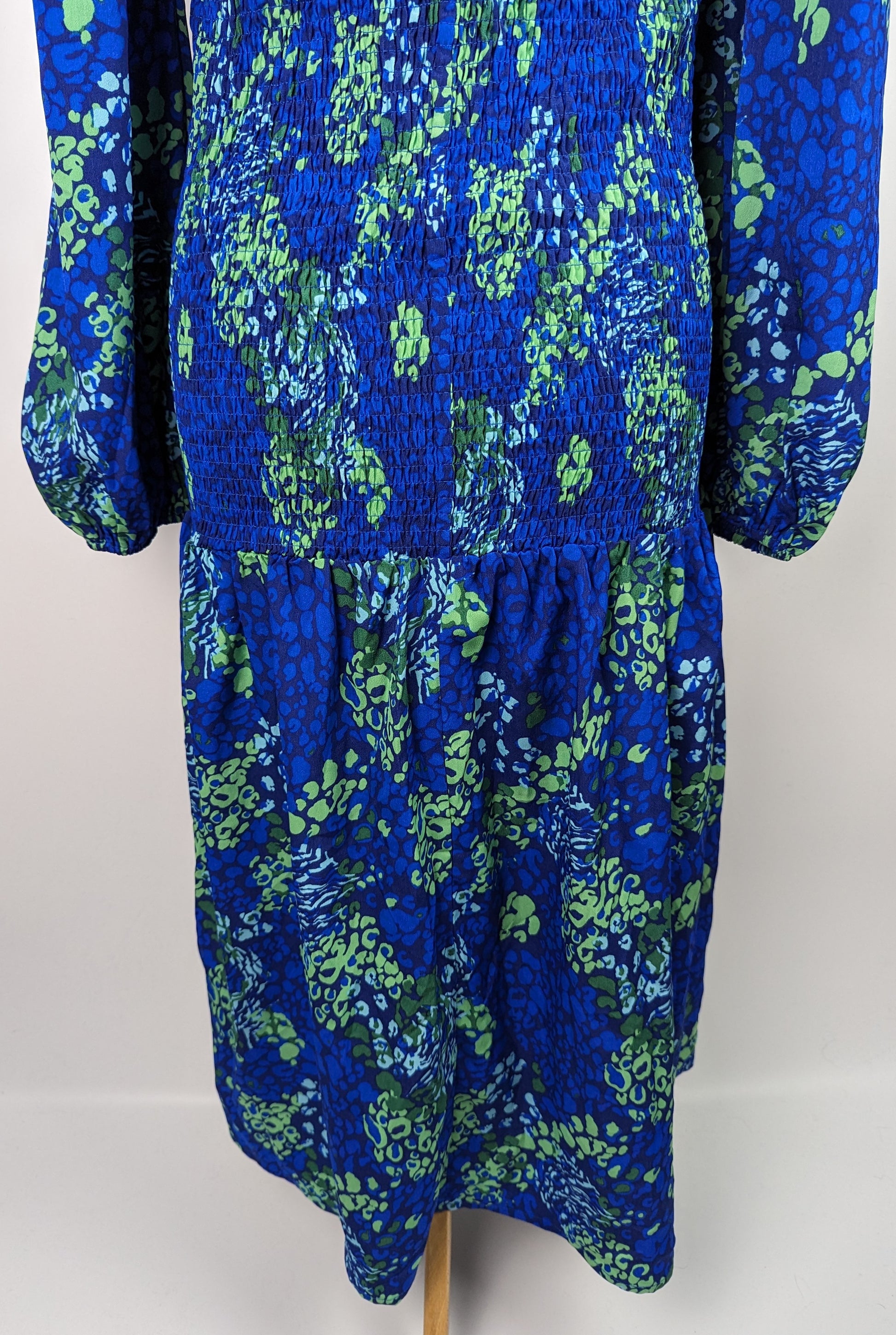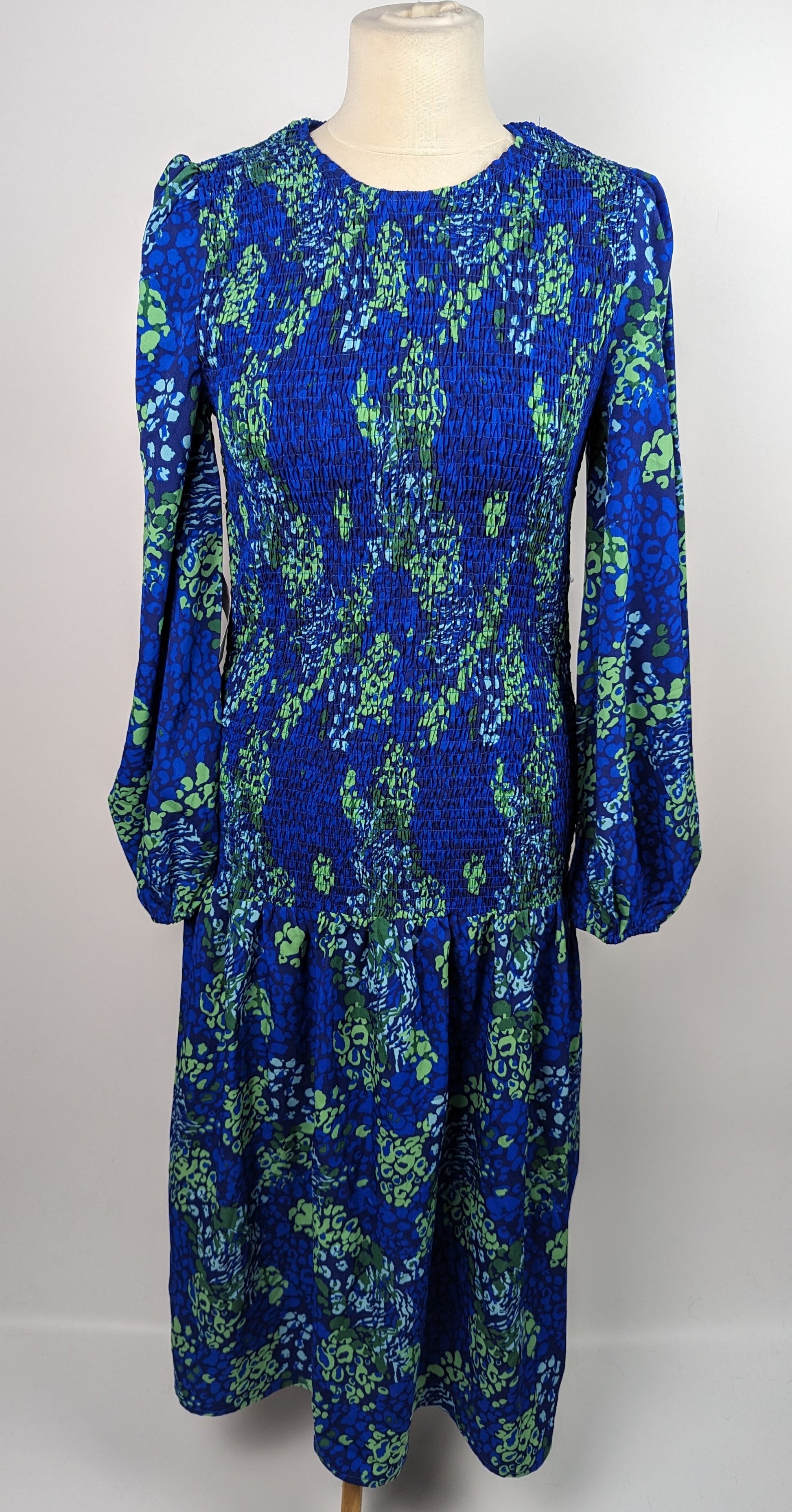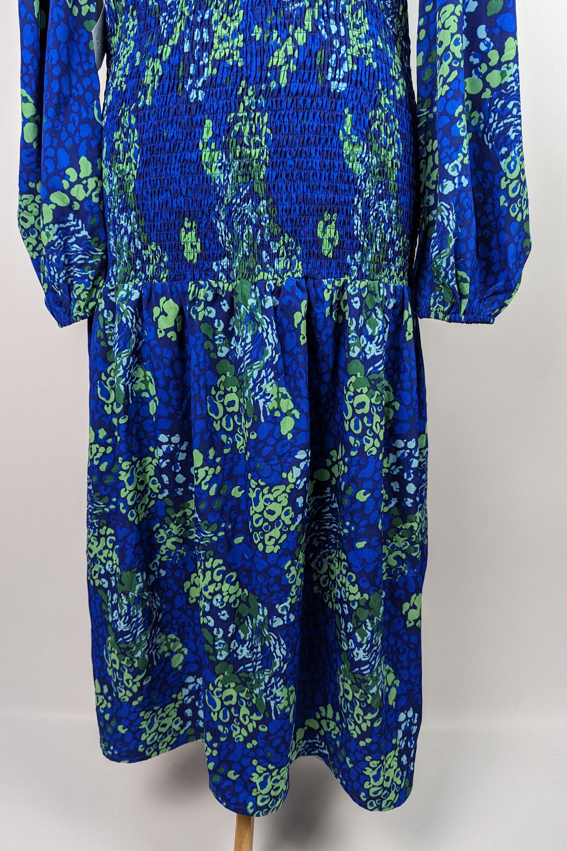 Stunning statement dress by NEVER FULLY DRESSED. The Scarlett is a midi length piece that deserves attention. Perfect for a night out with heels and a leather jacket, the bold blue and green print is reminiscent of leopard spots. Stretchy and shirred from the top to the waist, with lightly flared skirt, round neckline and puff sleeves. A gorgeous dress to add to your collection.
