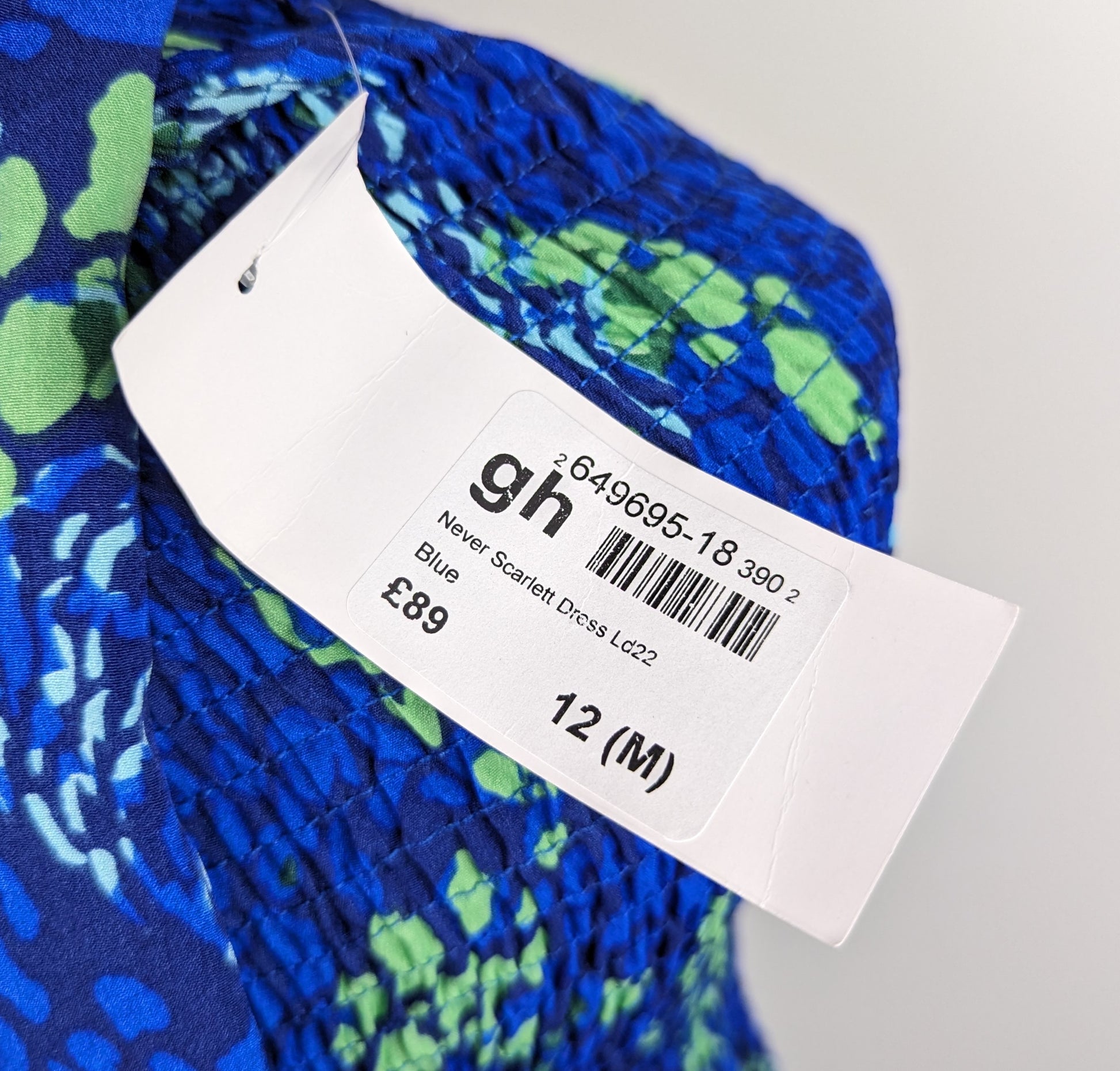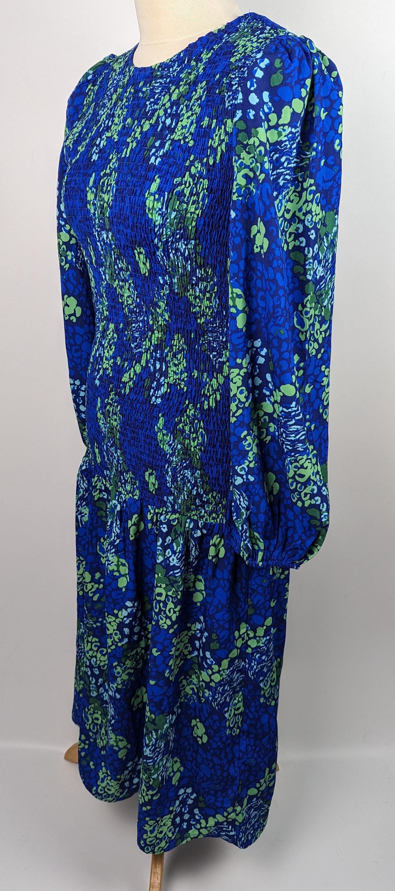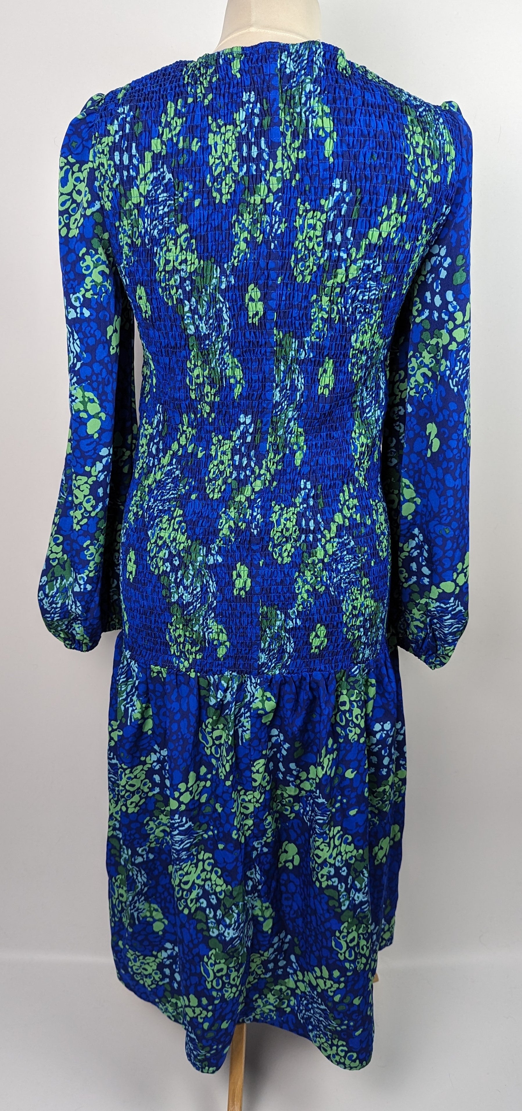 Stunning statement dress by NEVER FULLY DRESSED. The Scarlett is a midi length piece that deserves attention. Perfect for a night out with heels and a leather jacket, the bold blue and green print is reminiscent of leopard spots. Stretchy and shirred from the top to the waist, with lightly flared skirt, round neckline and puff sleeves. A gorgeous dress to add to your collection.