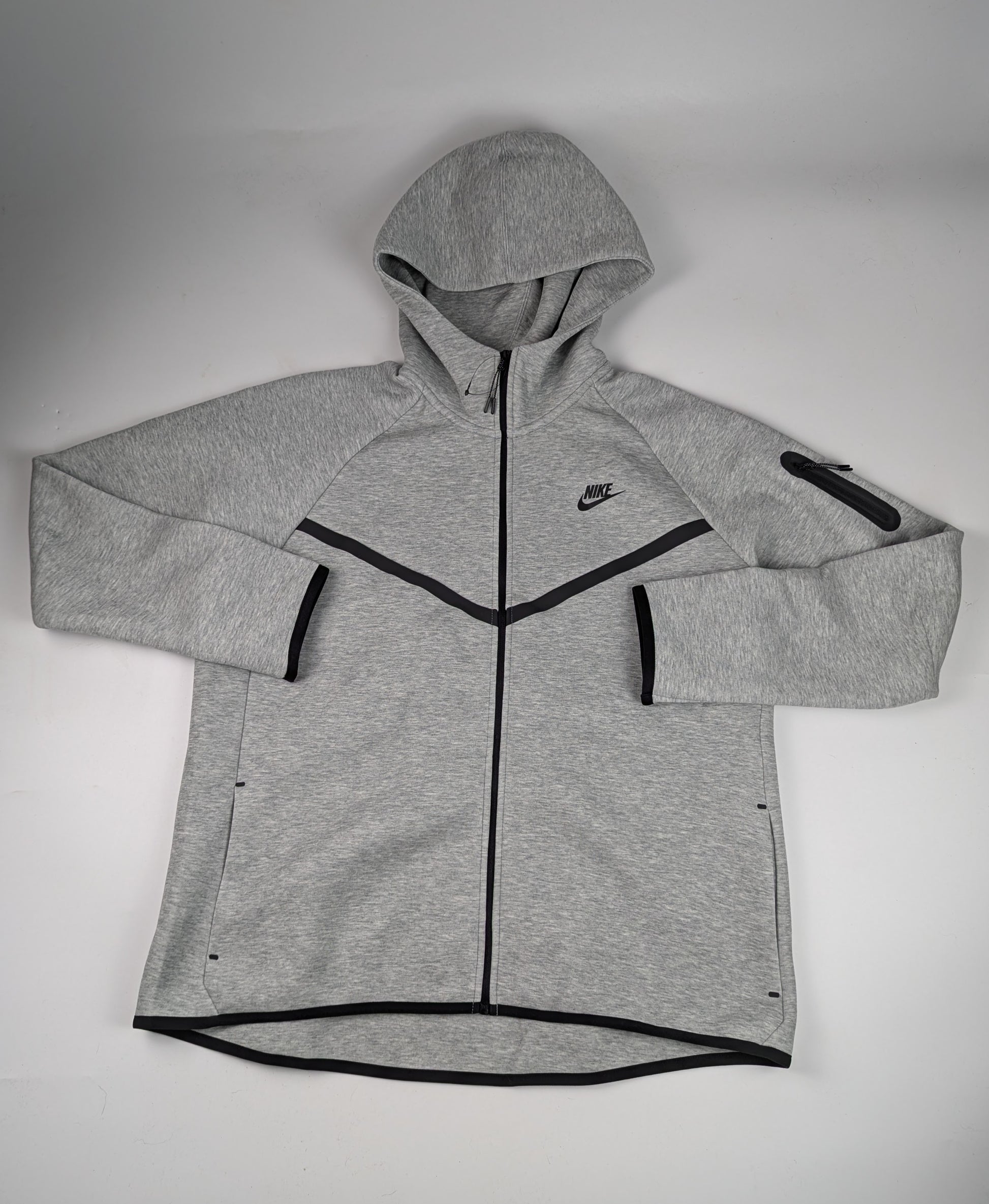 Comfort, levelled up. Grab this women's Tech Fleece Full Zip Hoodie from Nike for off-duty days. In Dark Grey Heather, this layer is cut from Nike's famous Tech Fleece. Lightweight, warm, premium. Elastic binding and a chevron tape shape the fit. Finished with the Nike Futura badge and tech zip pocket.