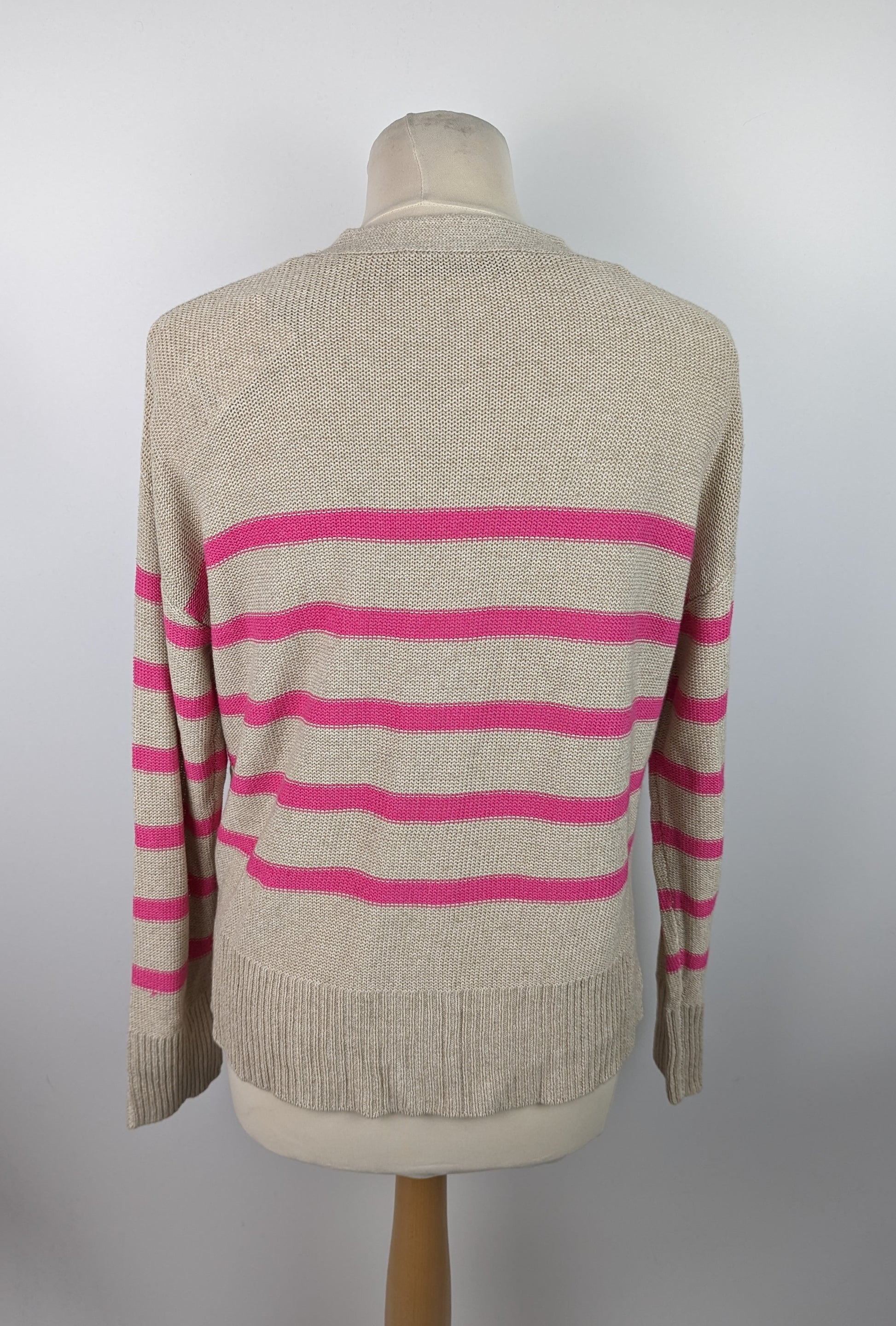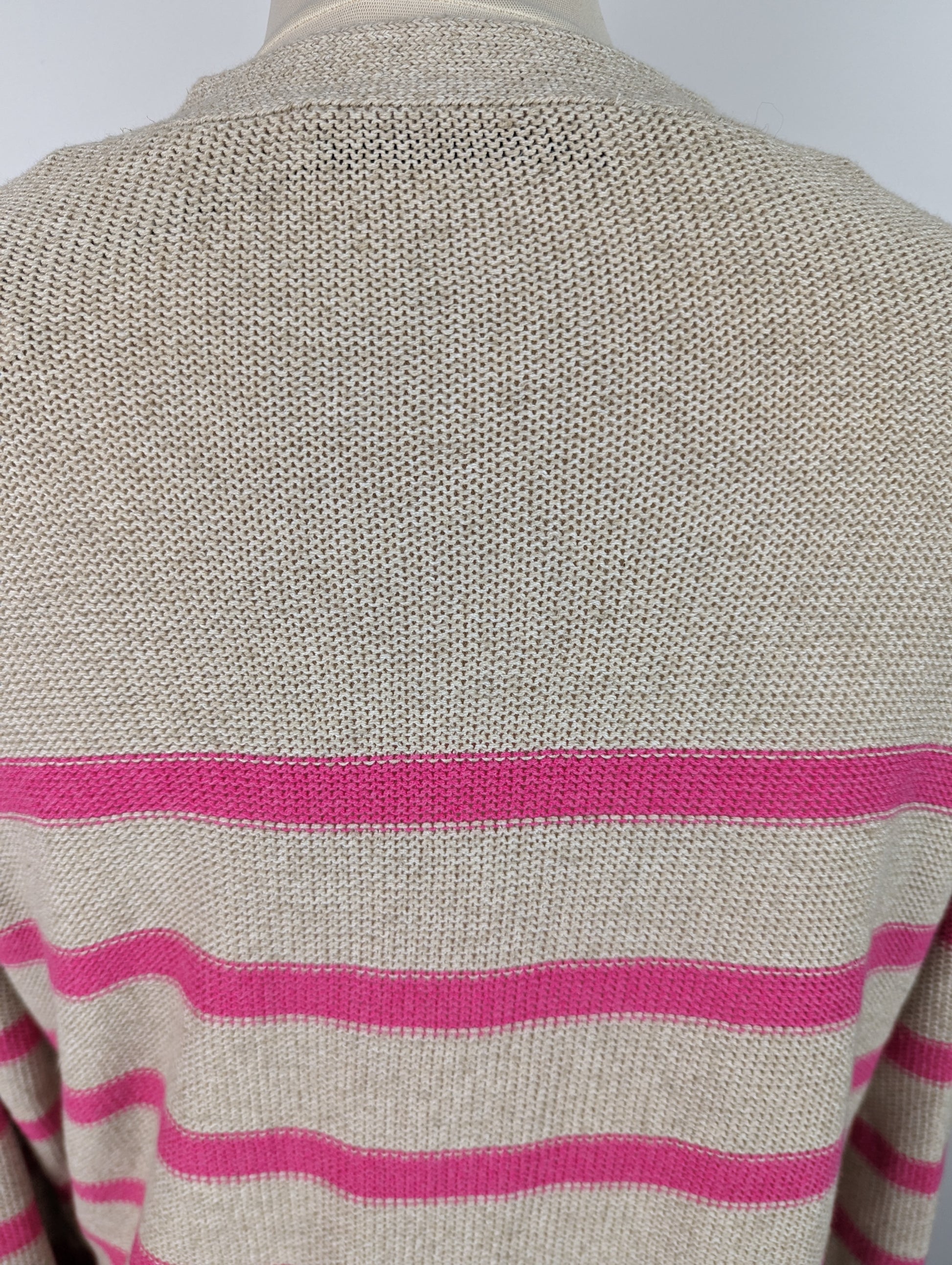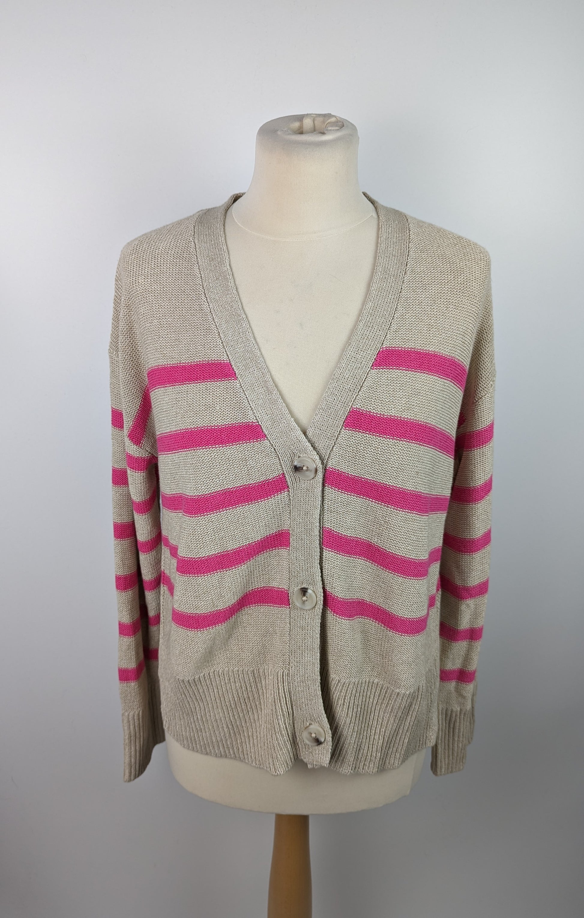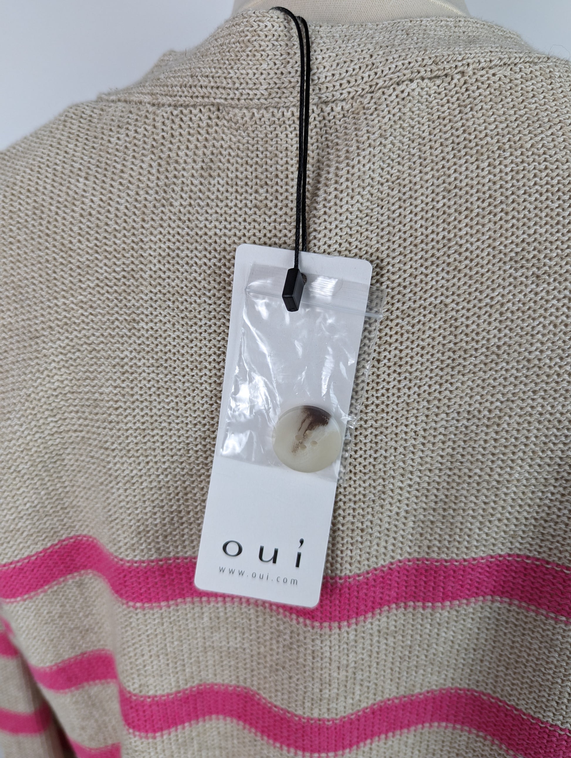 Add this casual staple to your knitwear wardrobe. The Oui Stripe Cardigan is constructed with button fastening and long sleeves for a classic look, and features ribbed trims for a comfortable fit. The cardigan showcases a stripe design, in a muted beige with contrasting pink.
