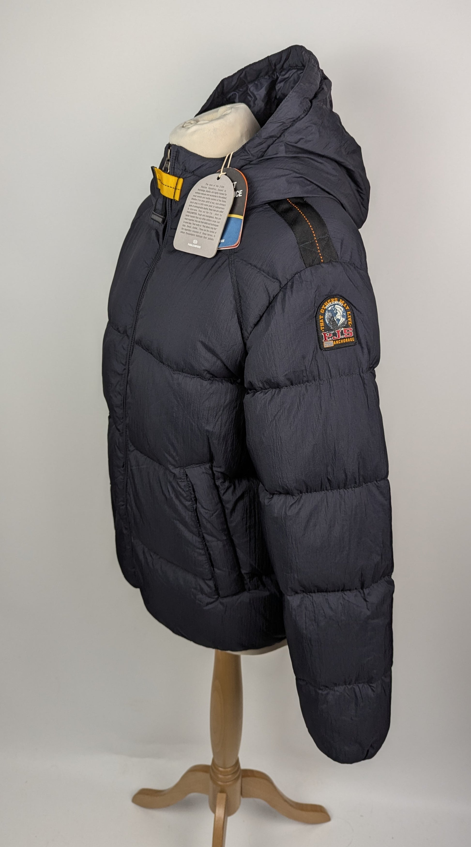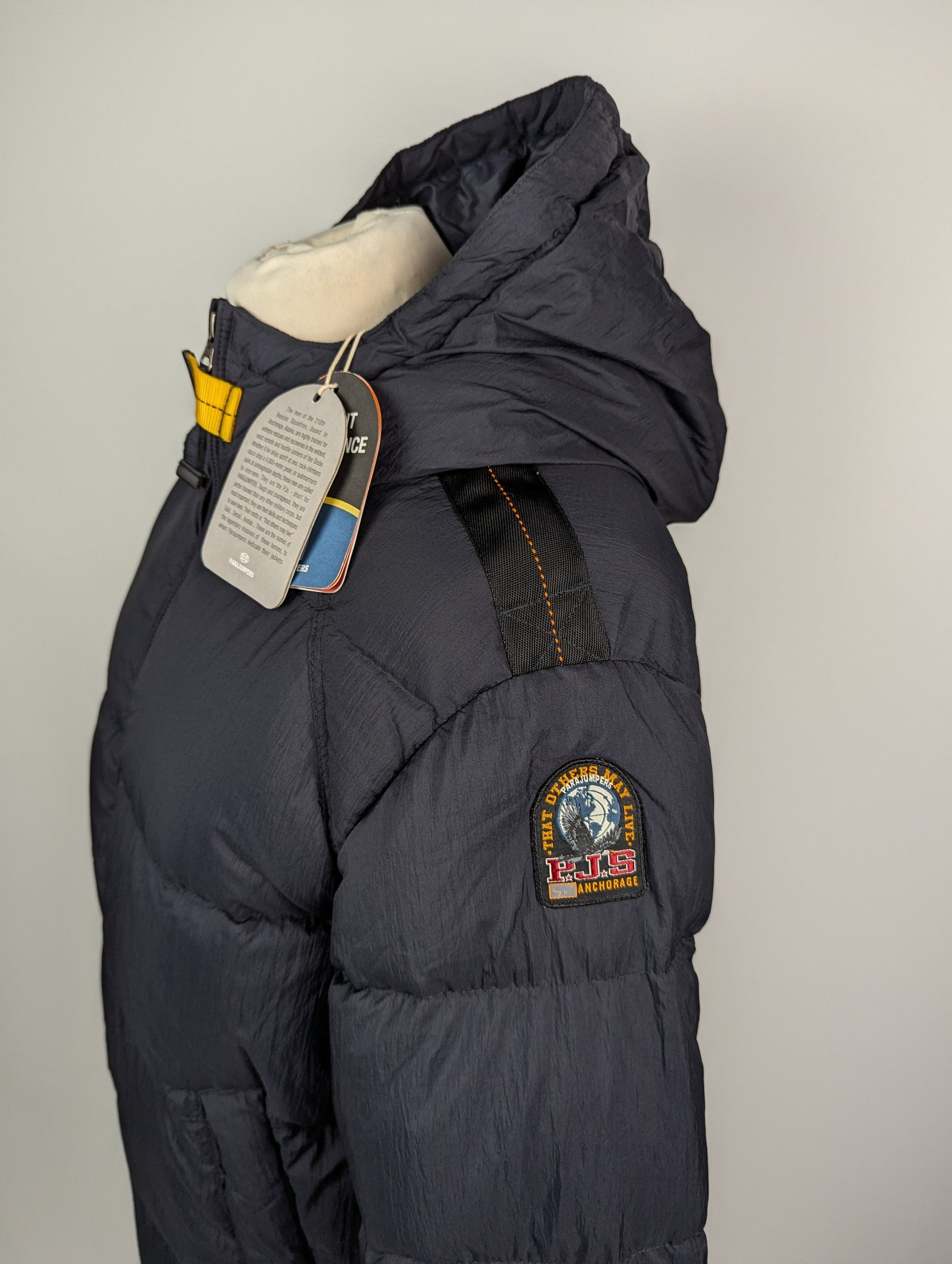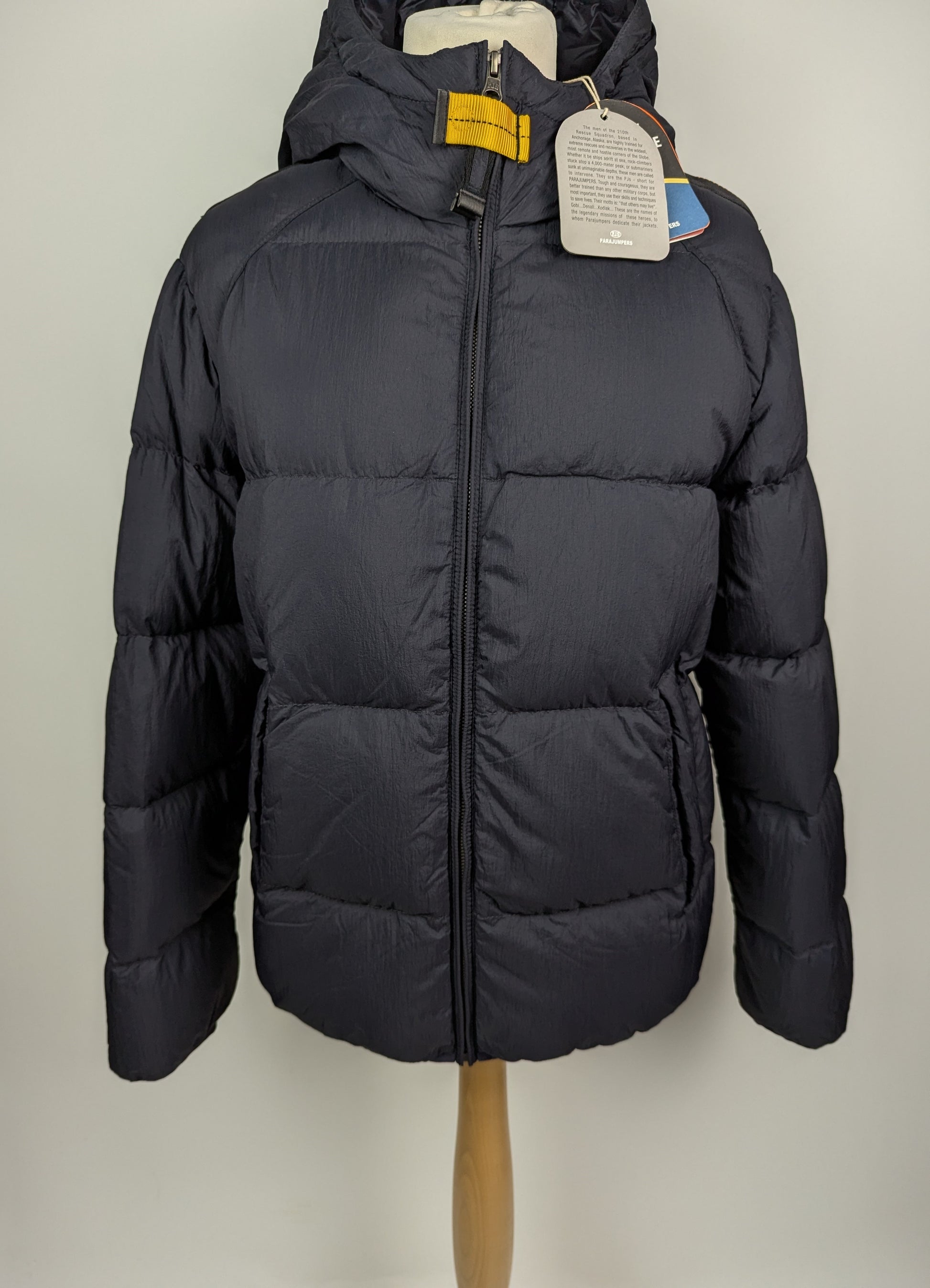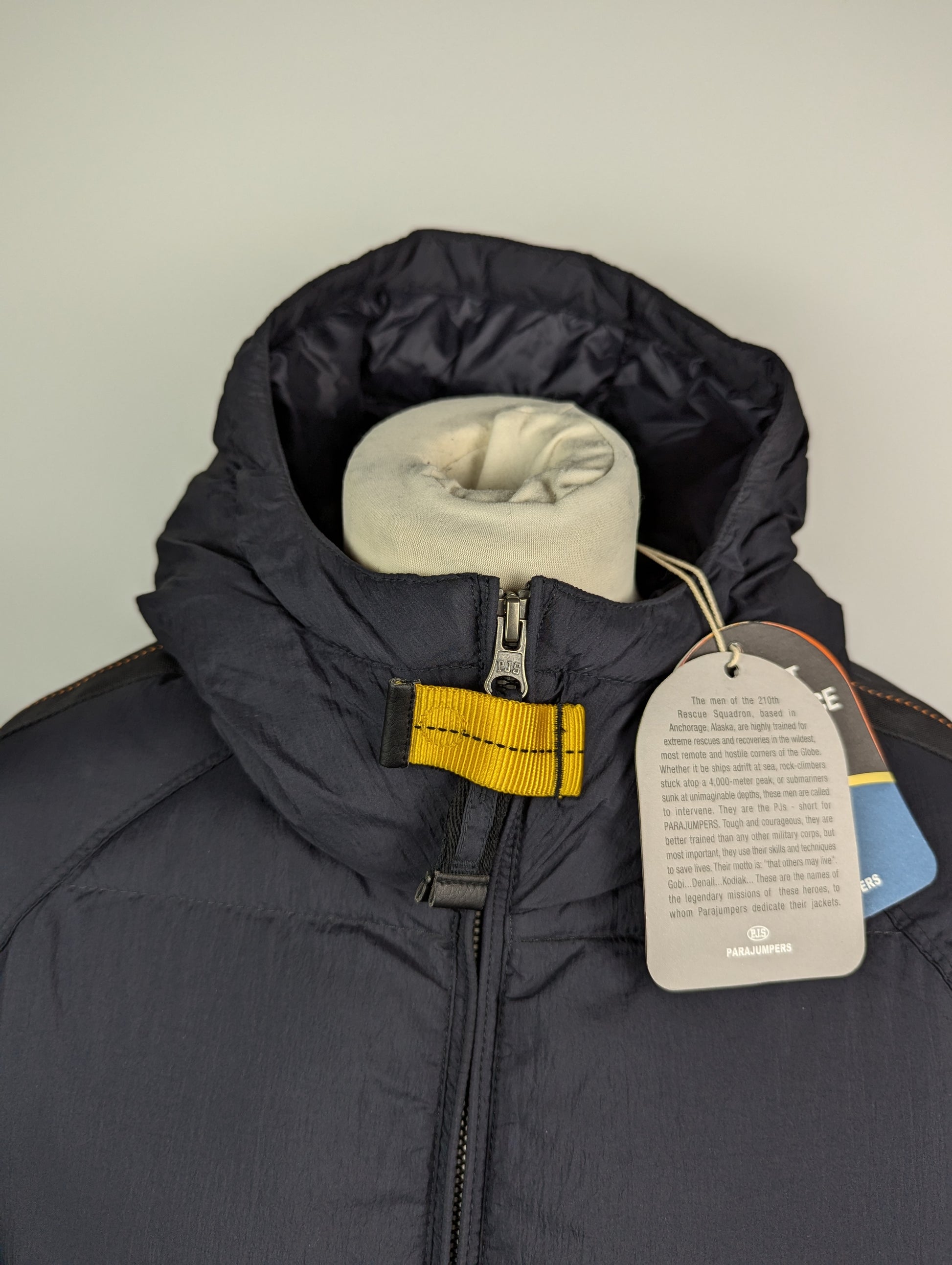 Dark navy blue jacket for boys by Italian outerwear brand Parajumpers, made in soft crinkled fabric with a water repellent treatment. This windproof layer is designed to keep them cosy in colder weather with a spacious hood and a lightweight, breathable down filling. It has two zip pockets on the front and an inner mesh velcro pocket to keep essentials safe. Zipping up at the front, it features the brand's signature yellow velcro tape below the chin and a distinctive logo patch on the arm.