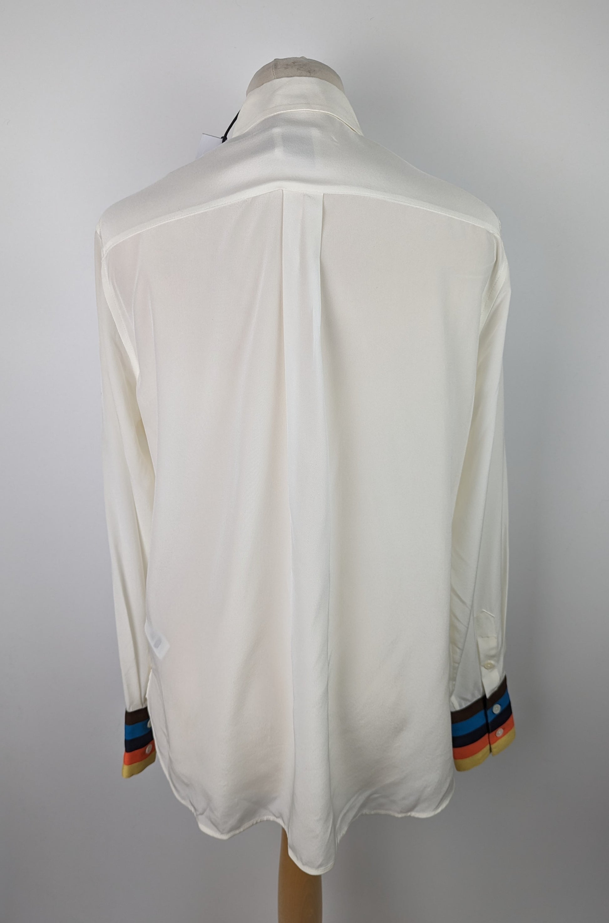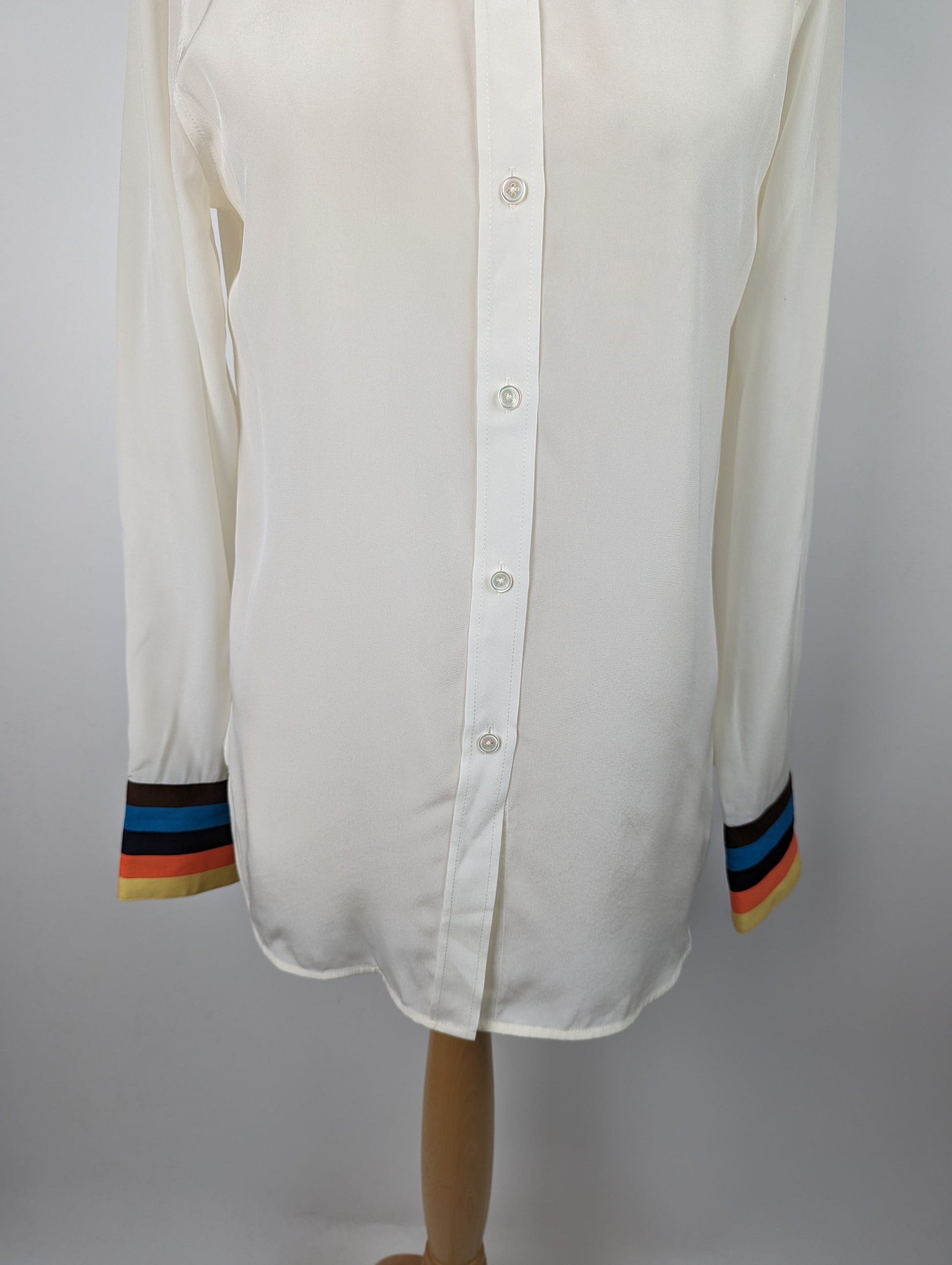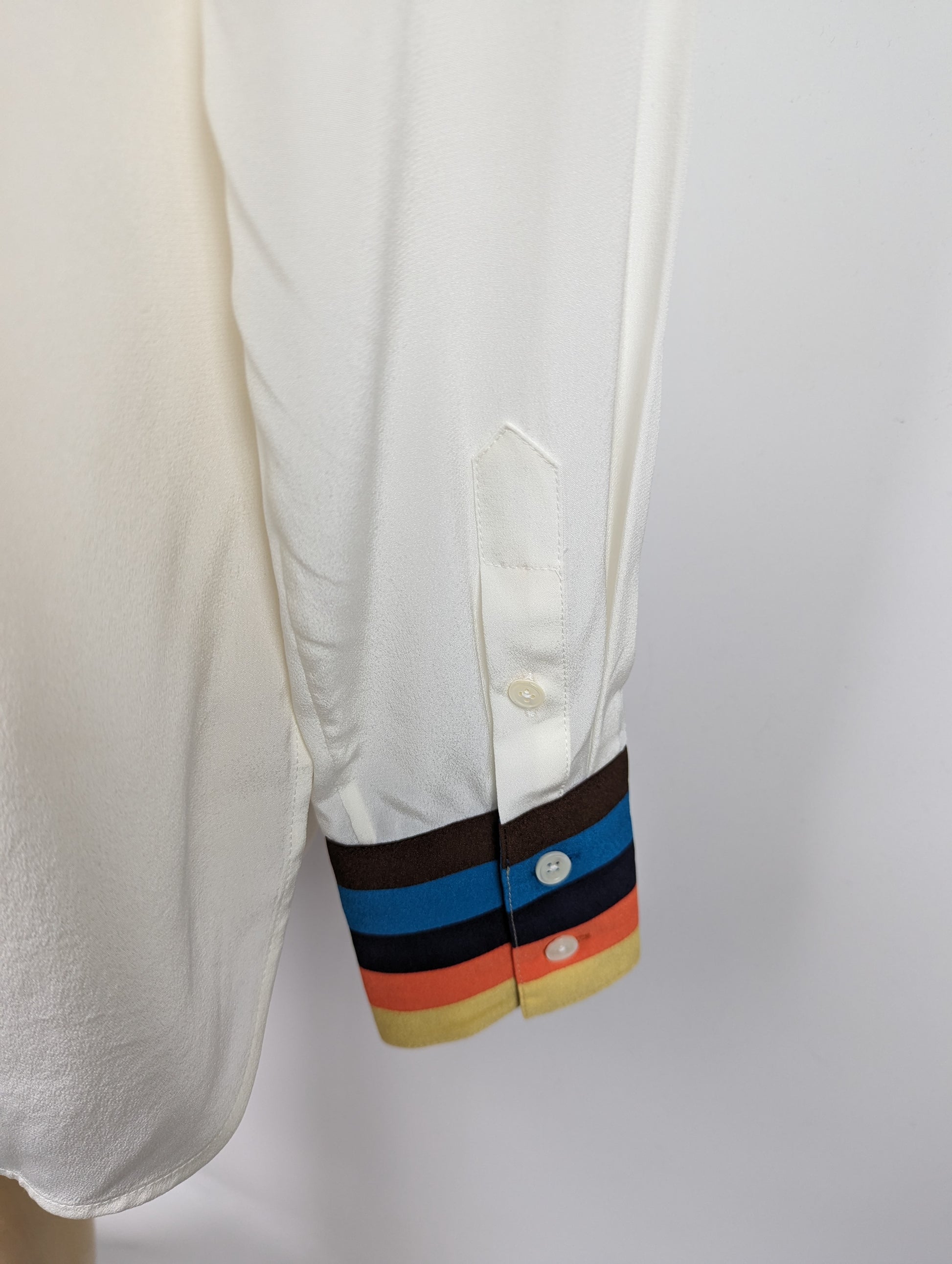 The Paul Smith Womens Stripe Cuff Shirt in White features a see-through fabric that is longer at the back, than the front. It has buttons to fasten, with a collar. The shirt also includes a striped cuff for a stylish touch. This shirt is made of 100% silk for a luxurious and high-quality feel.