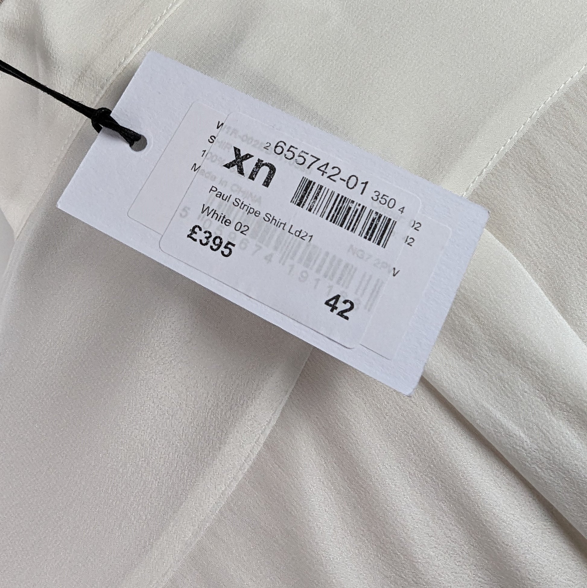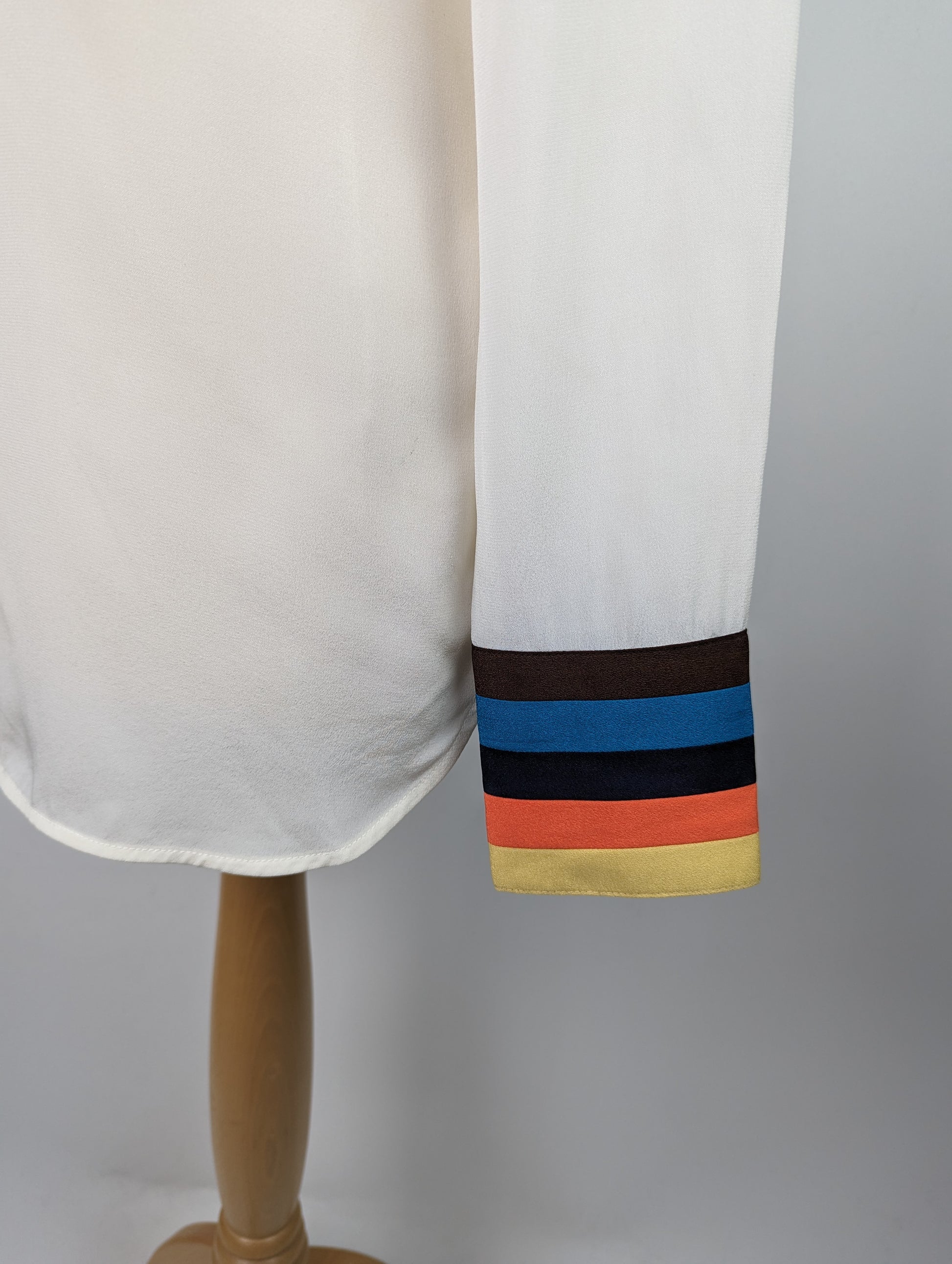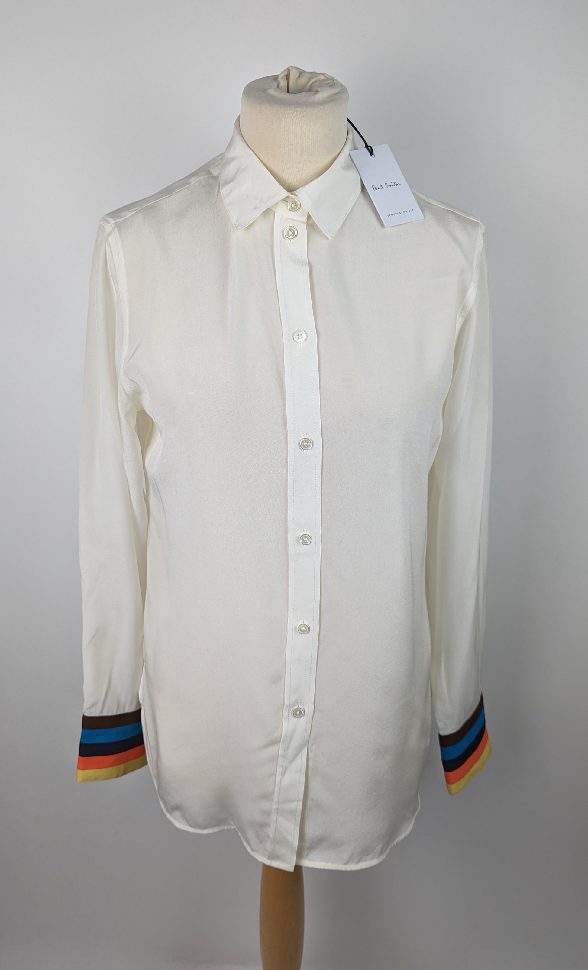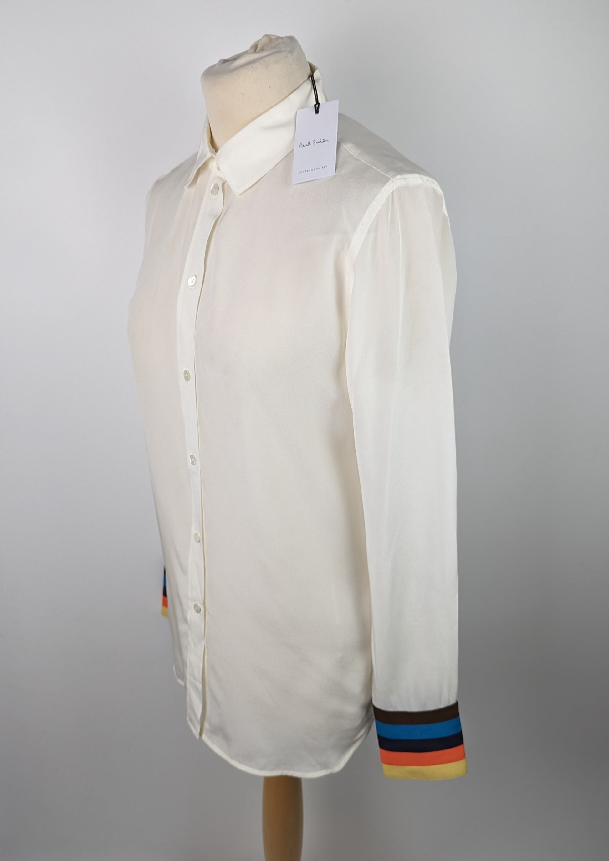 The Paul Smith Womens Stripe Cuff Shirt in White features a see-through fabric that is longer at the back, than the front. It has buttons to fasten, with a collar. The shirt also includes a striped cuff for a stylish touch. This shirt is made of 100% silk for a luxurious and high-quality feel.