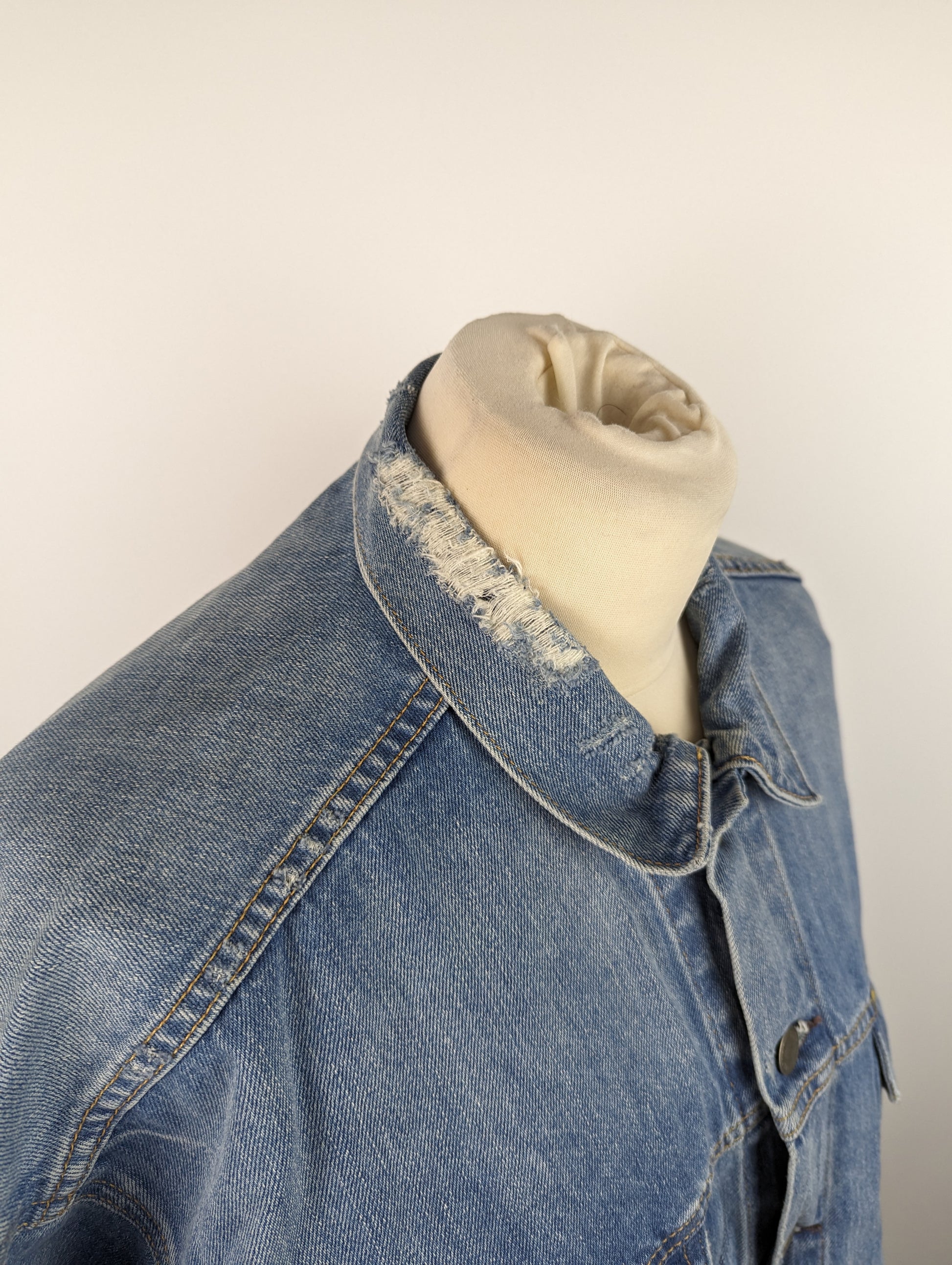 This faded denim trucker jacket boasts a relaxed fit and a washed-out blue colour. It features strategically distressed areas and is secured with buttons. Additionally, it has two buttoned chest pockets and two open side pockets for added convenience.
