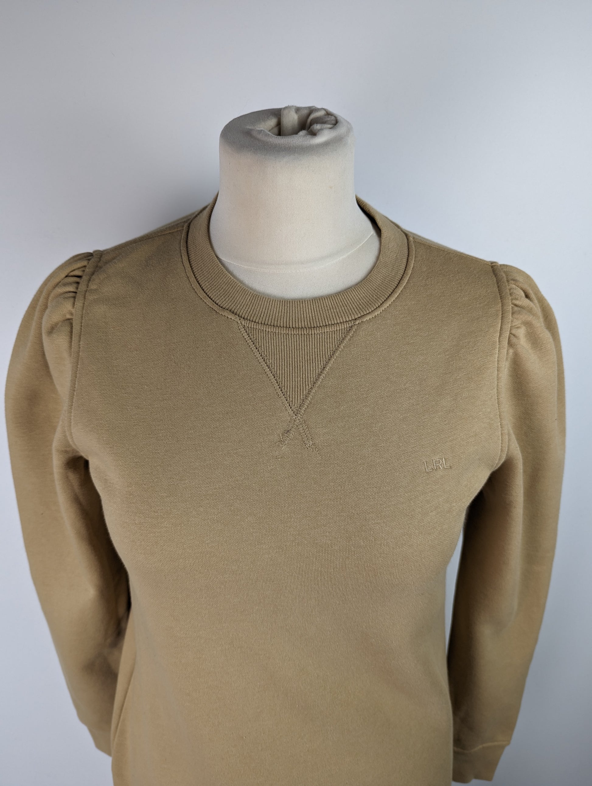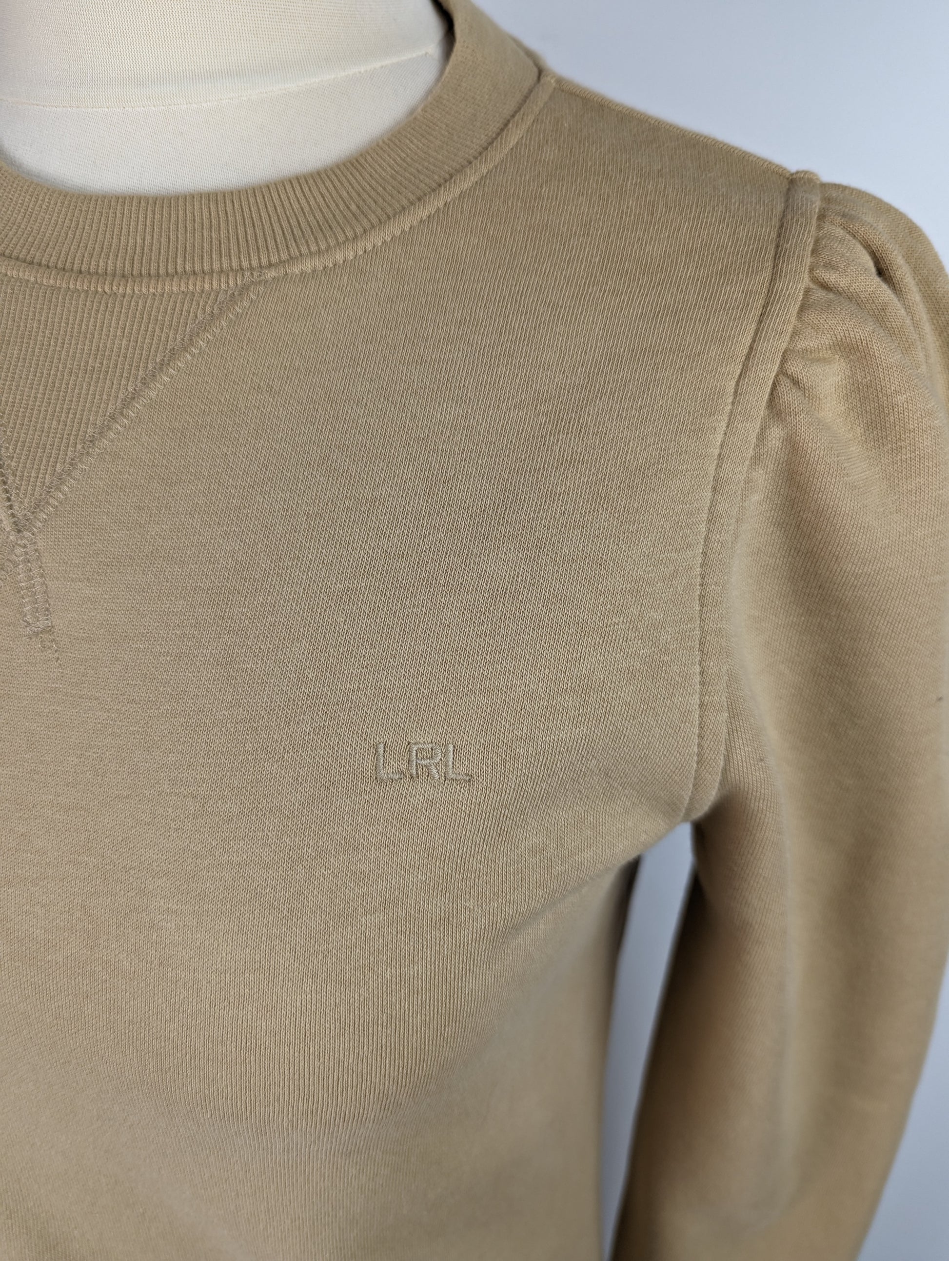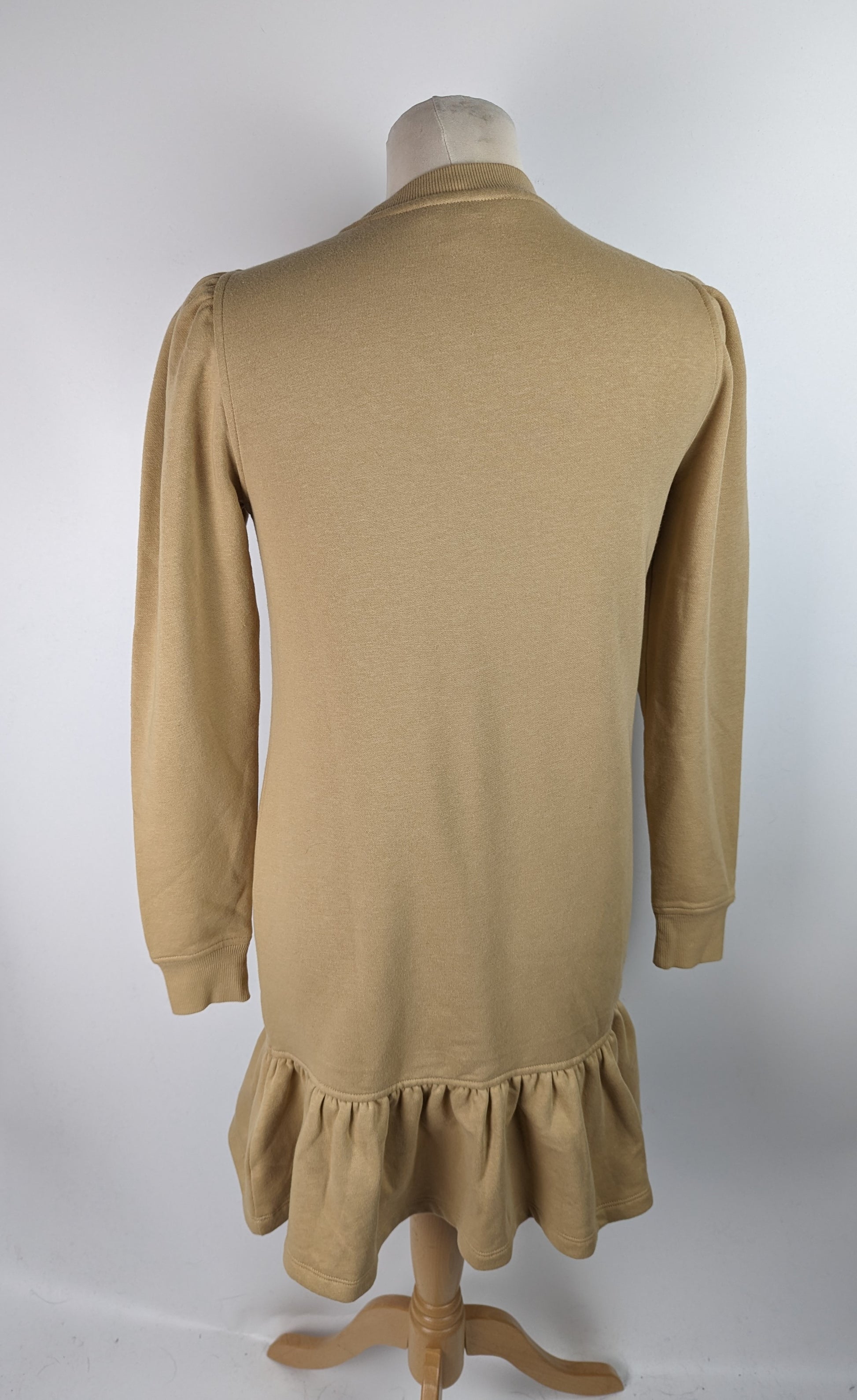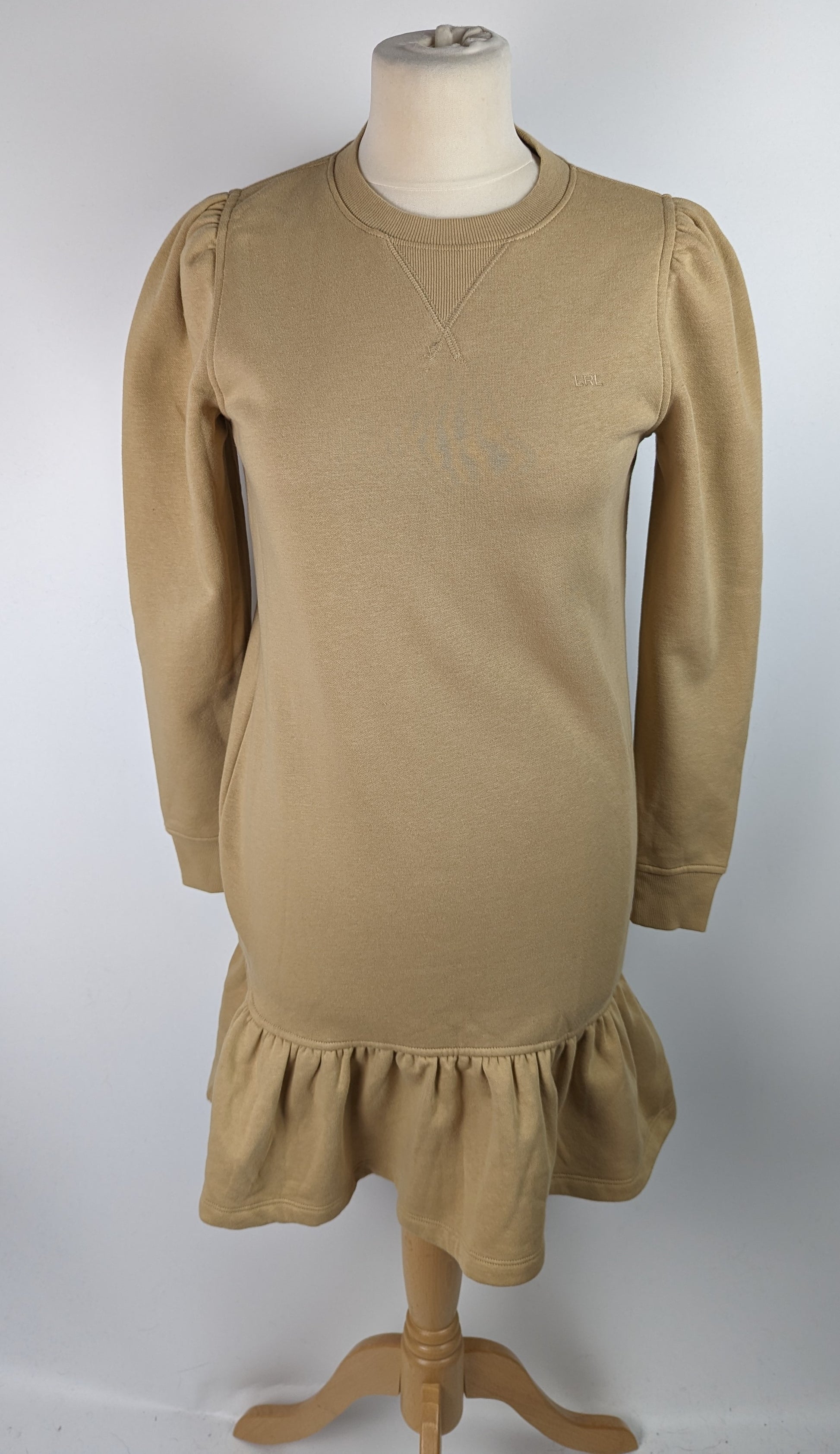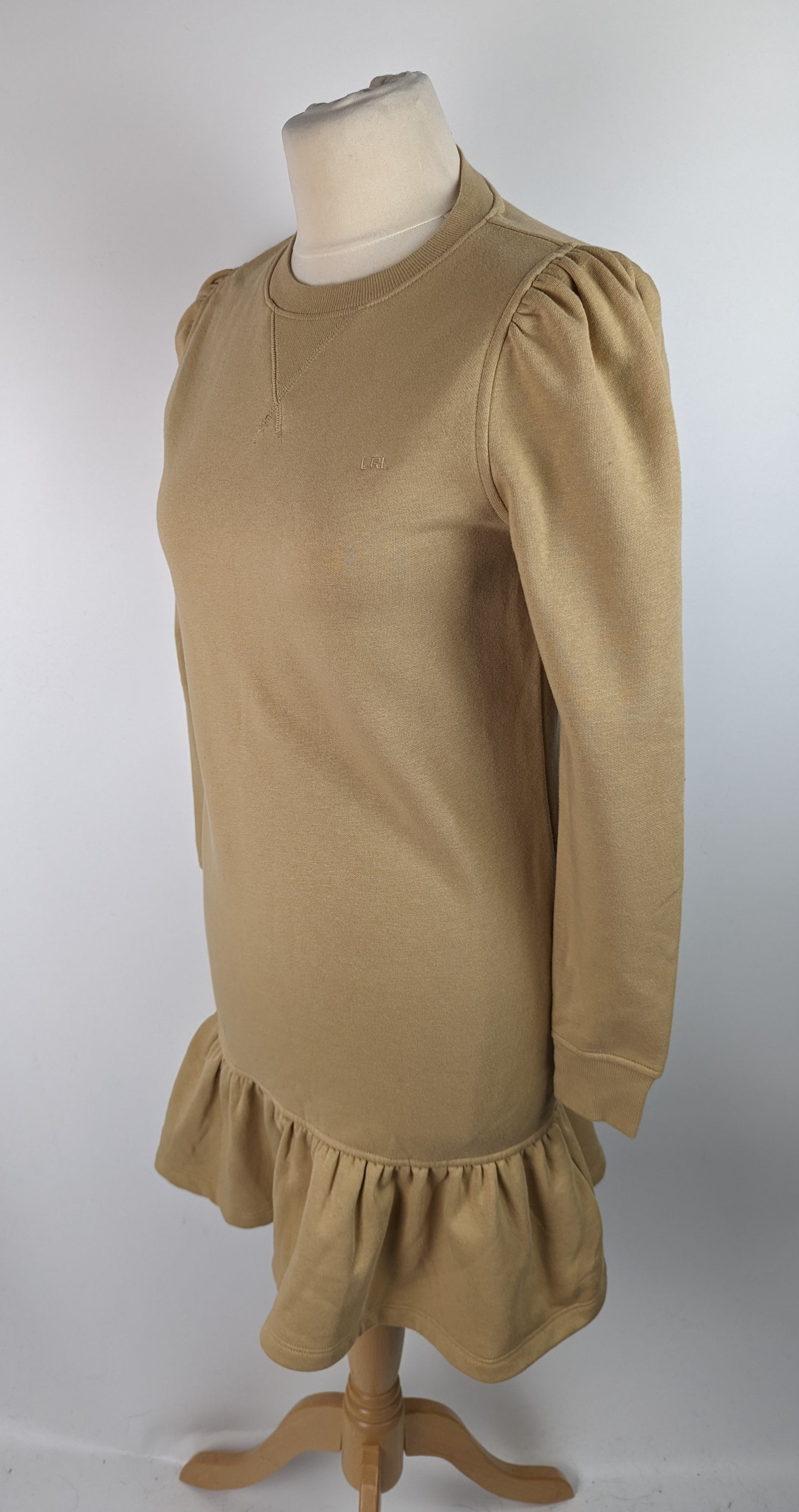 Casual day dress from LAUREN by Ralph Lauren. The design showcases a mini length jumper dress, with ribbed crew neckline and long sleeves. The classic sweater feel has added character in the peplum ruffle skirt detail, and pleated shoulders. The block beige / nude colouring allows a versatility to style the dress with a range of different outfits and accessories.
