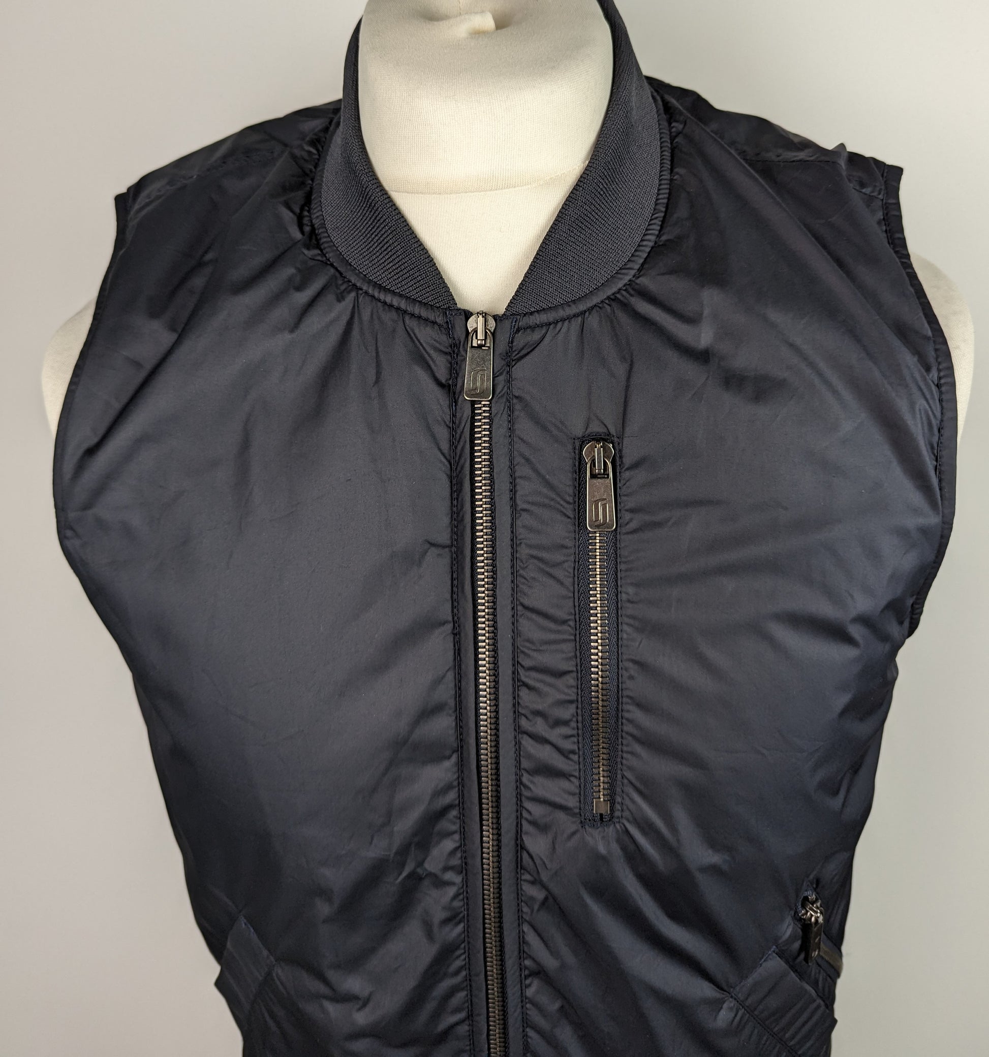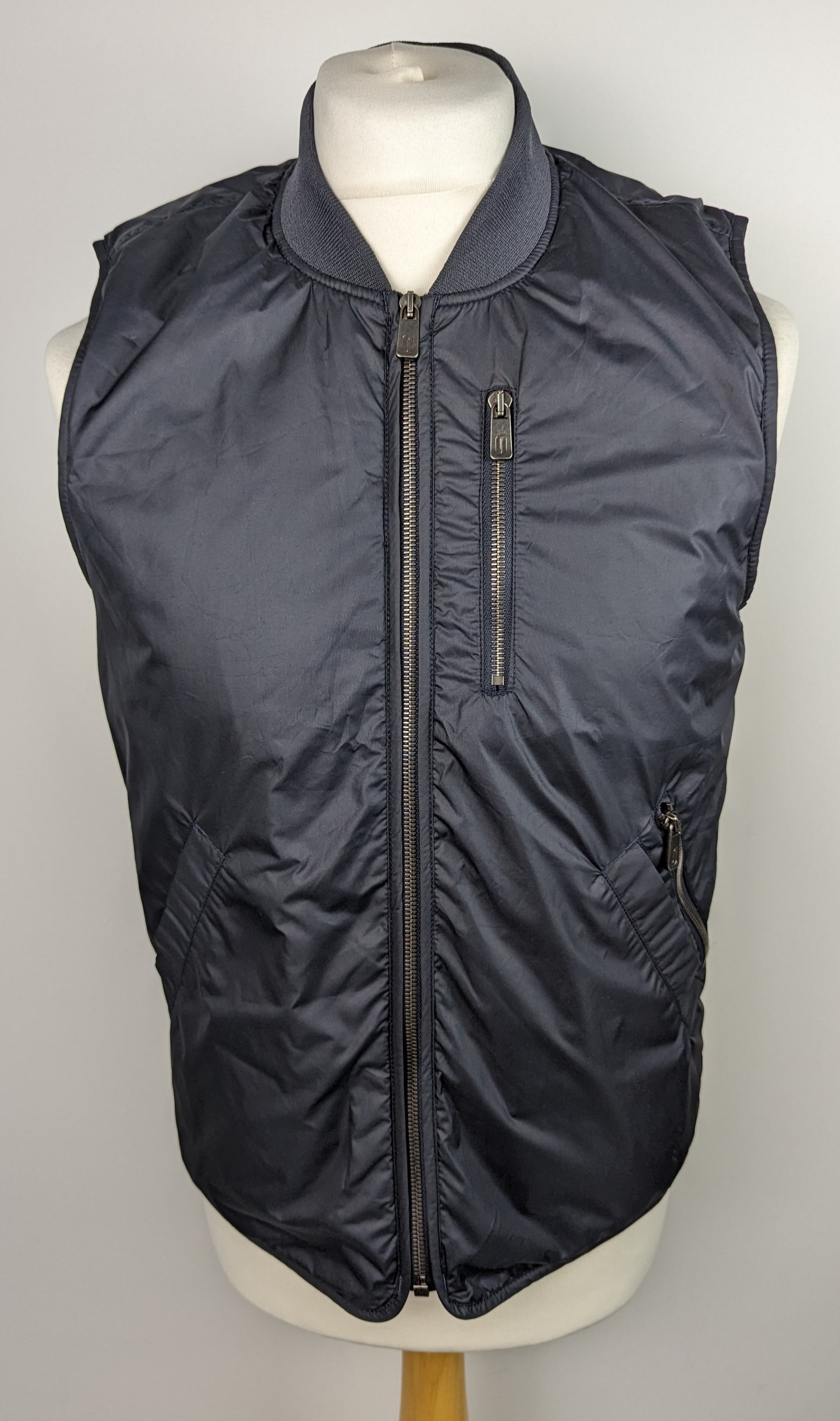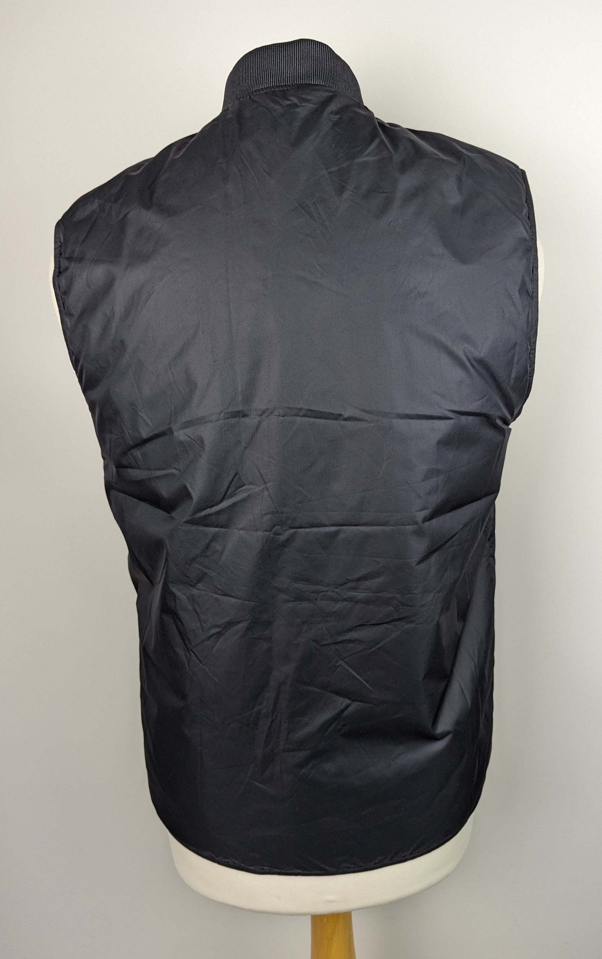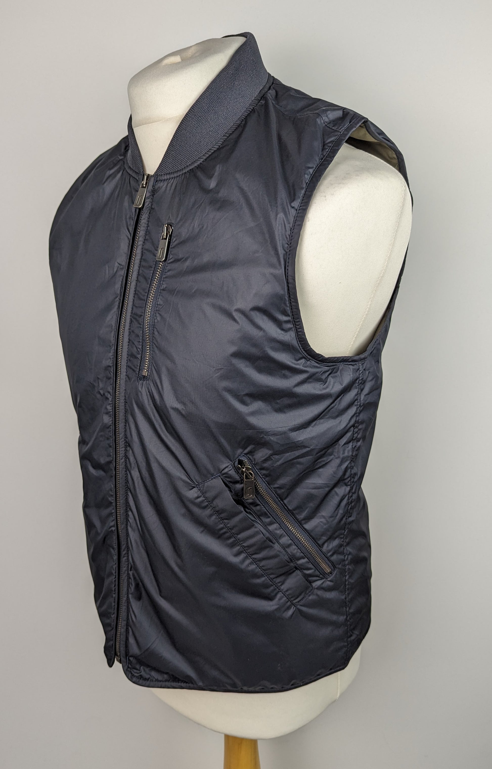 Lightweight gilet by Richard James Savile Row. Perfect layered over knitwear and jeans or chinos for a smart casual Winter to Spring outfit. Crafted in navy blue polyester, with olive green contrast lining. Featuring a full length front zip, and pockets to the outer and interior lining. A simple, versatile and stylish piece.