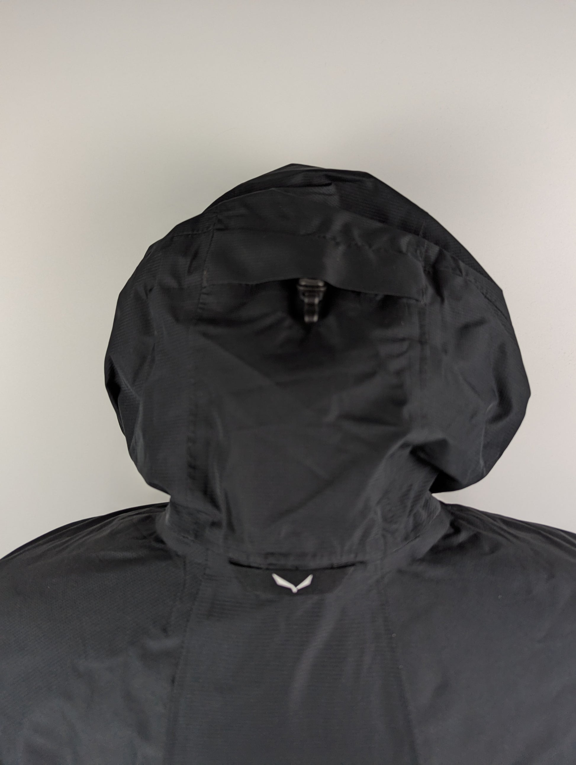 This women's Salewa PTX 2L Convertible Jacket in black offers waterproof protection and features a hood for added coverage. It includes zipped pockets for secure storage and an adjustable waistband for a tailored fit. The jacket also provides extra warmth with a removable inner padding, making it versatile for varying weather conditions.