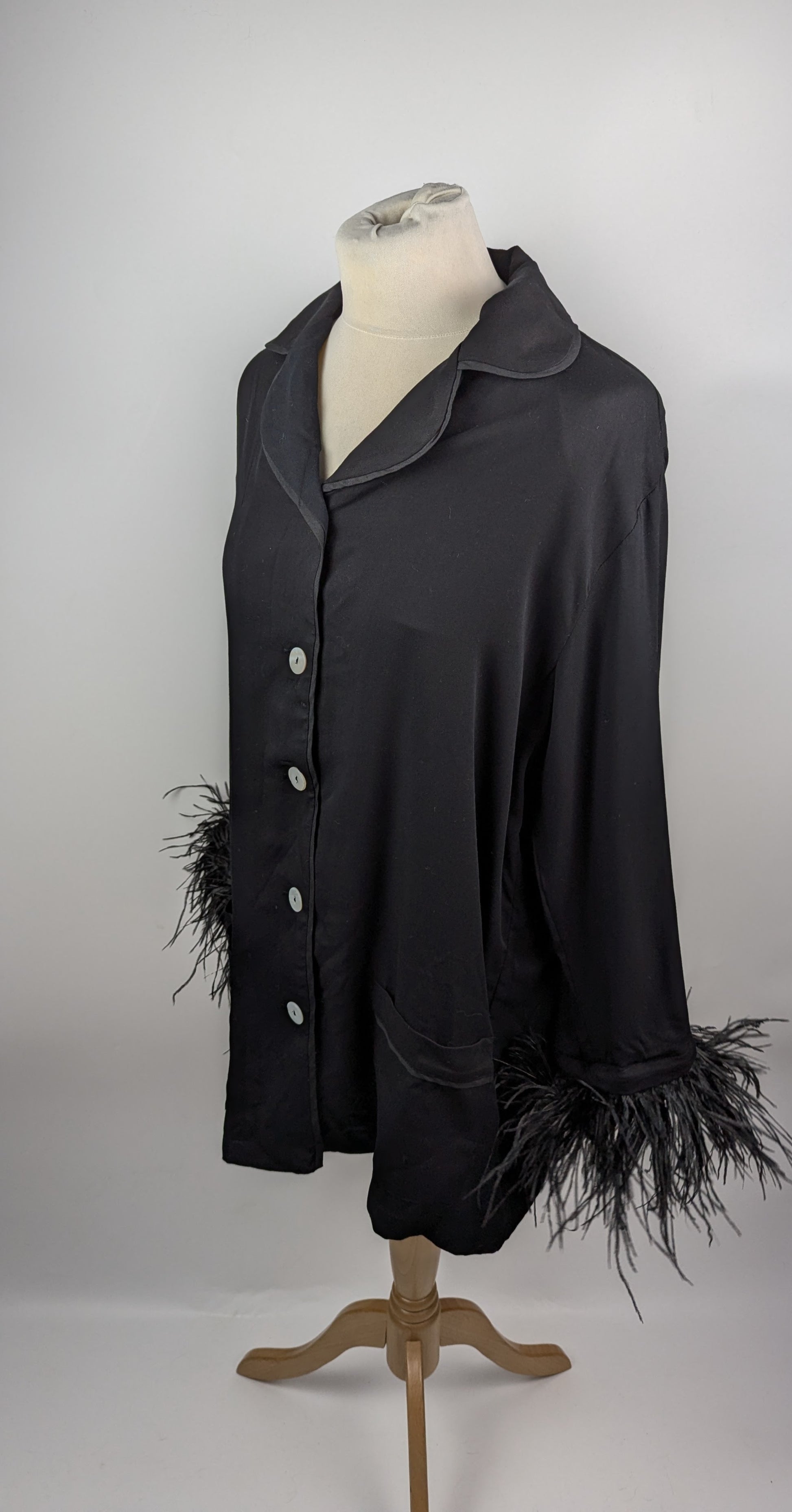 Women's Sleeper Party Pyjama Set With Double Feathers. This vintage-inspired pajama top is made from lightweight crepe de chine and features a button-down shirt with tonal piping.