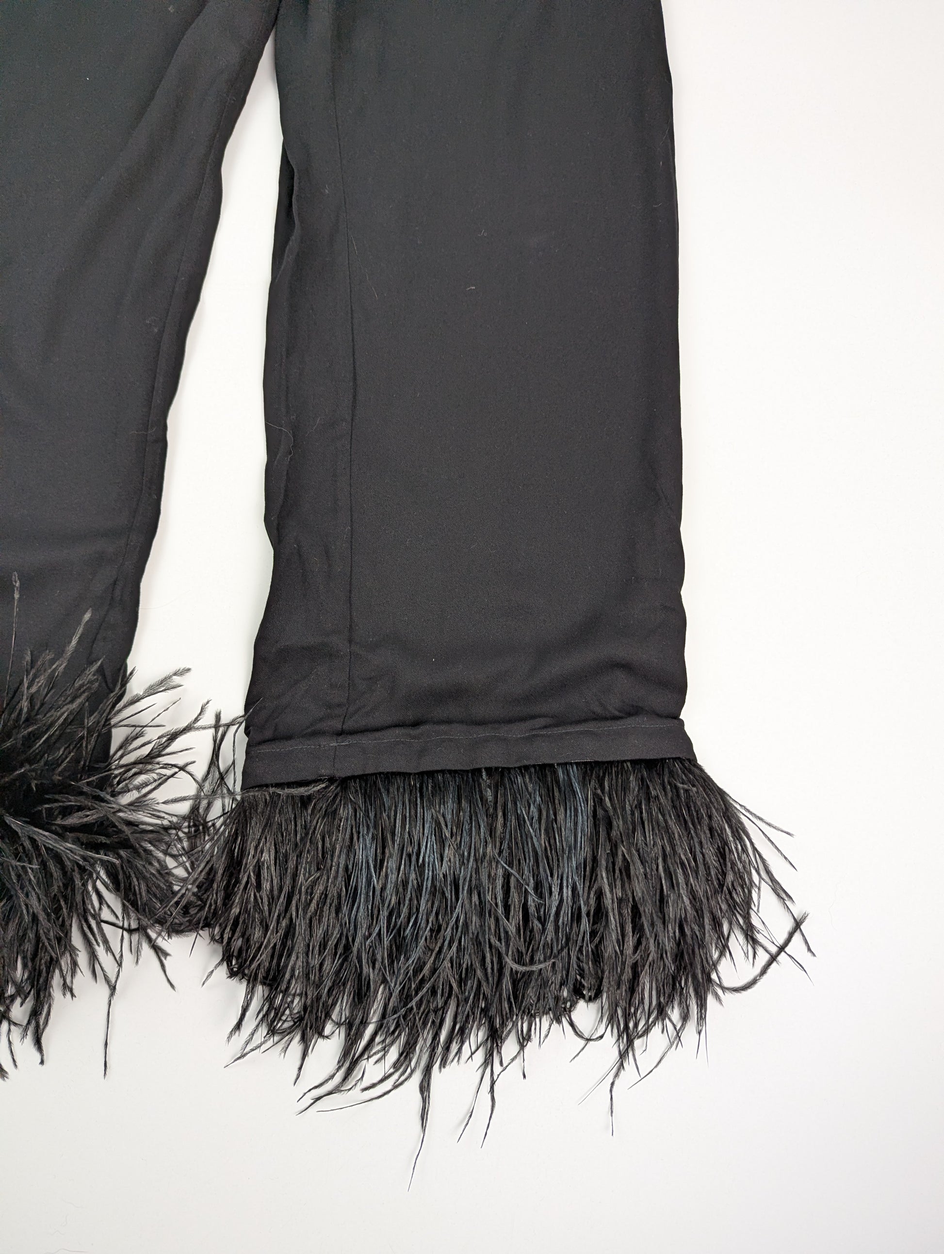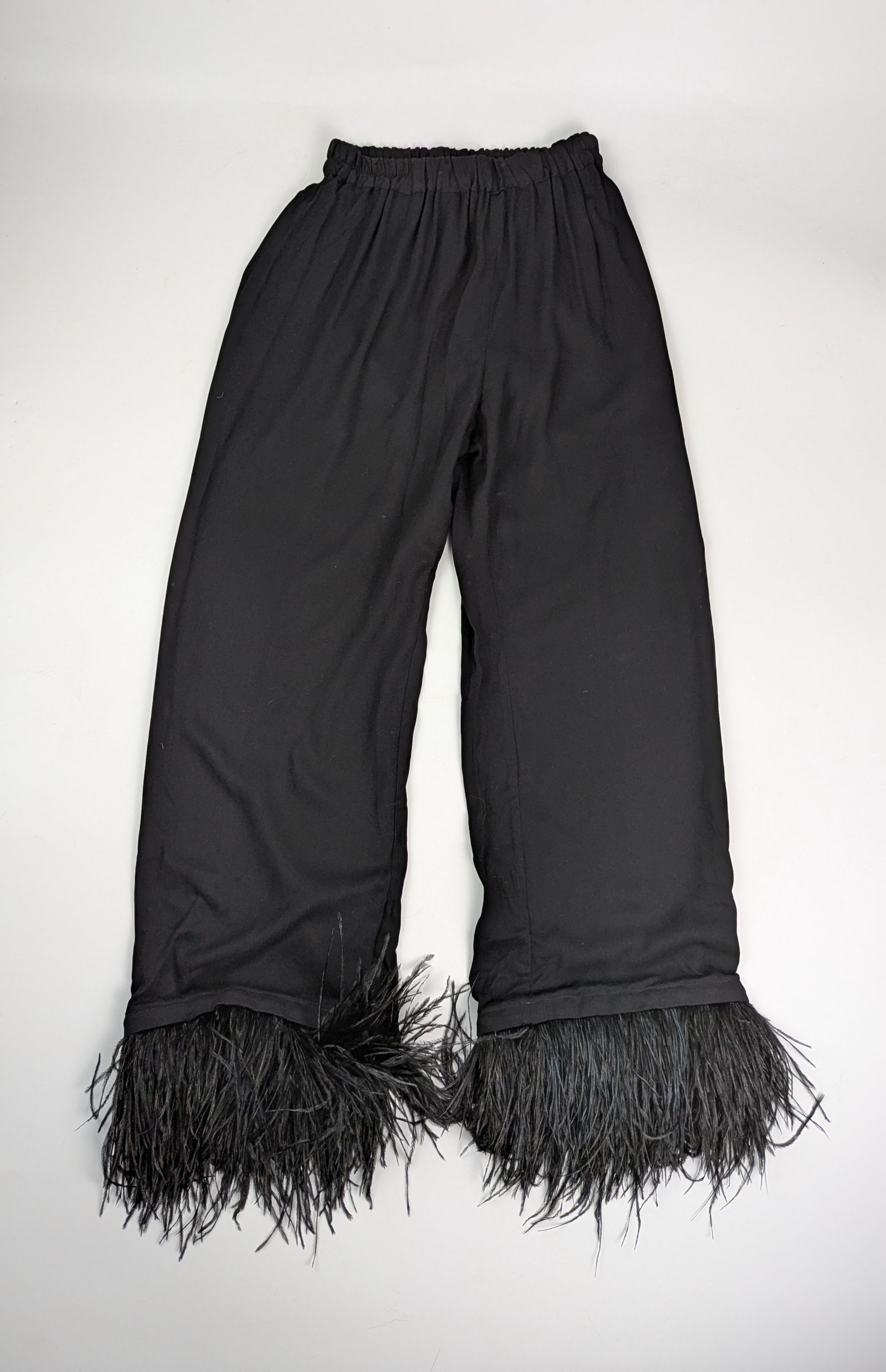 Cropped pants with an elasticated waist. It is known for its signature detachable feather trim on the hems.