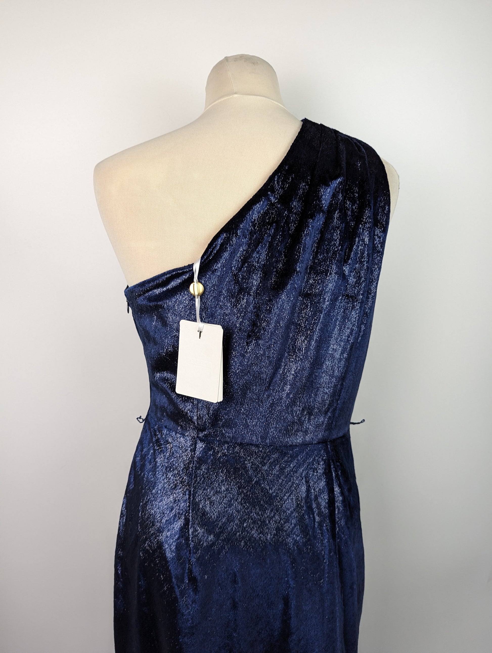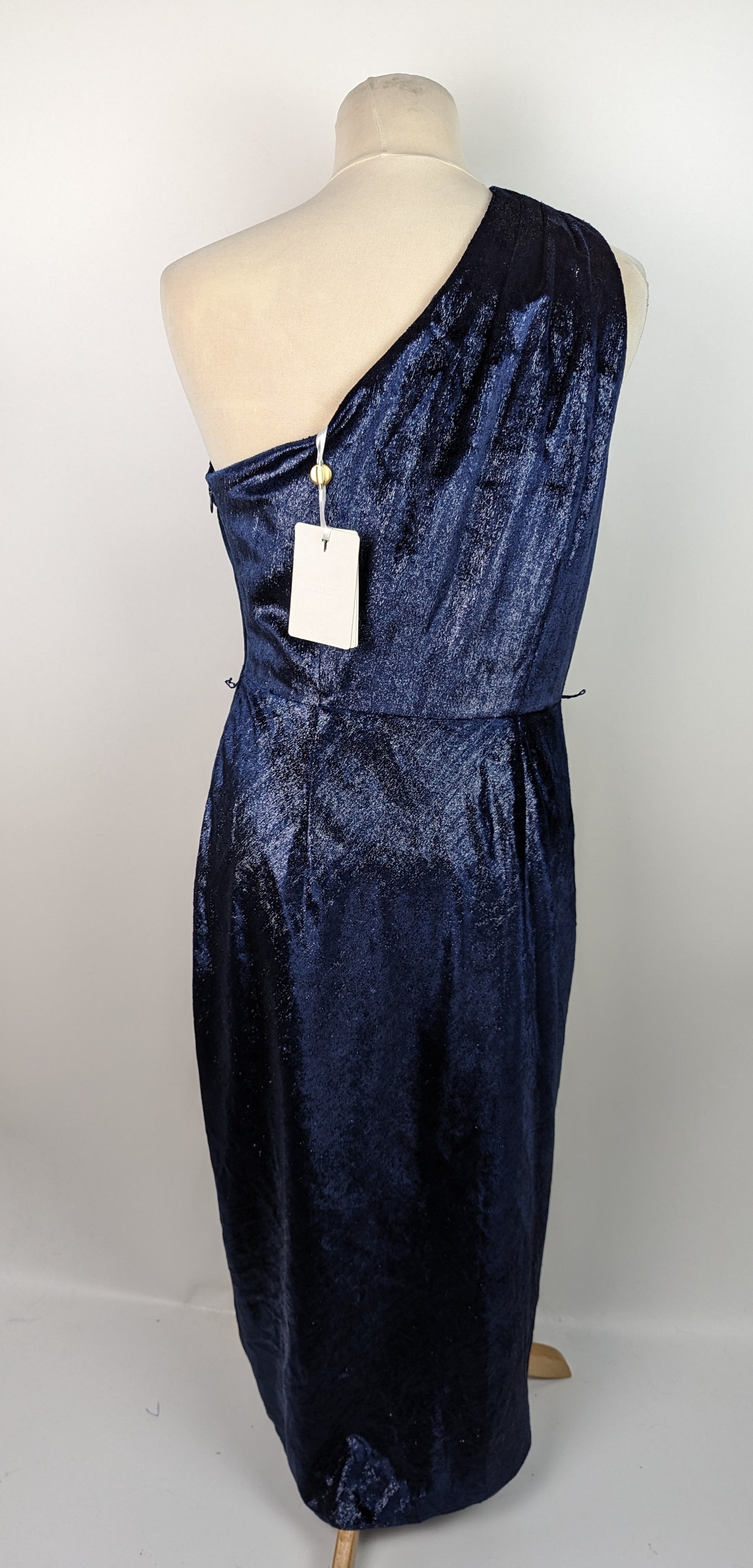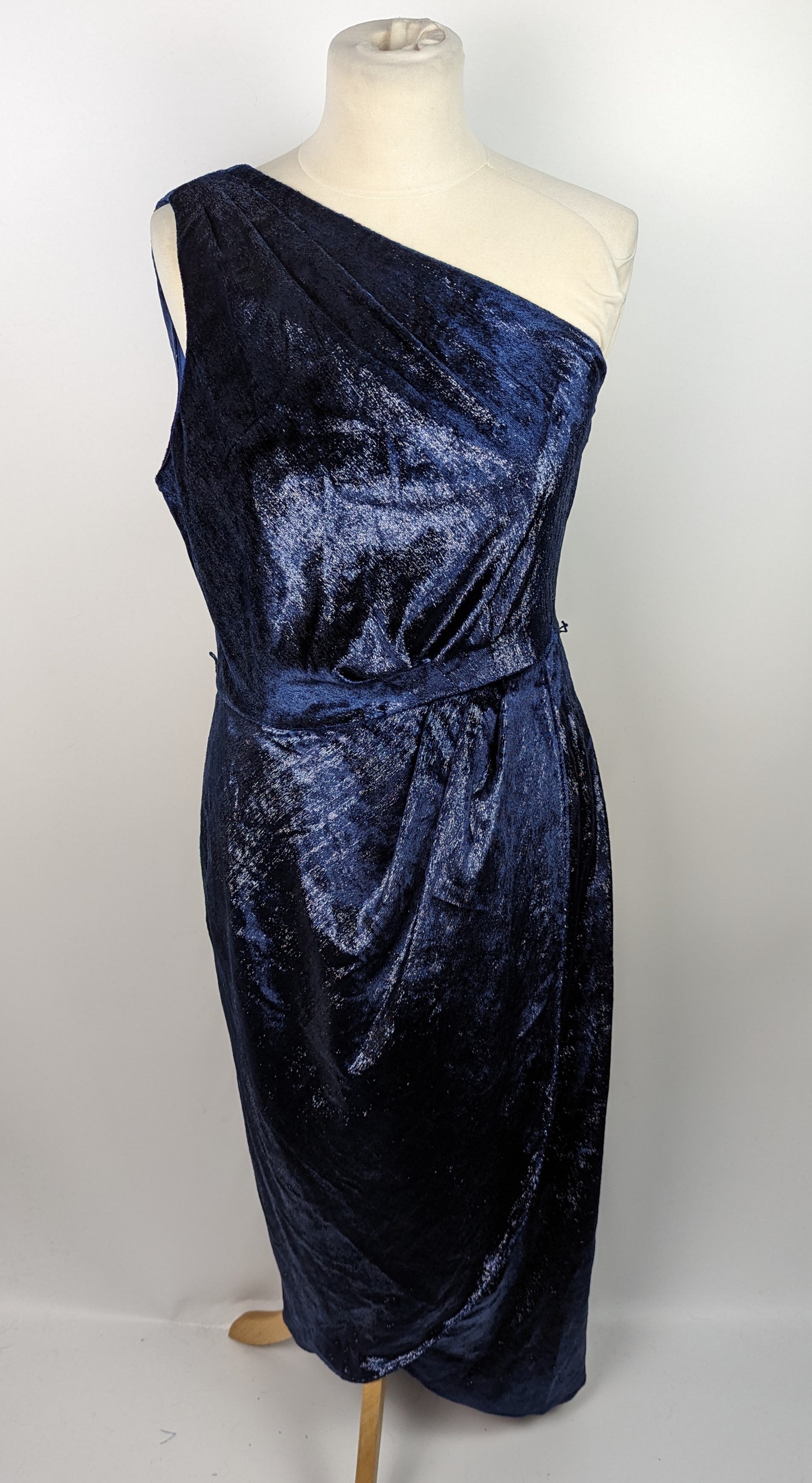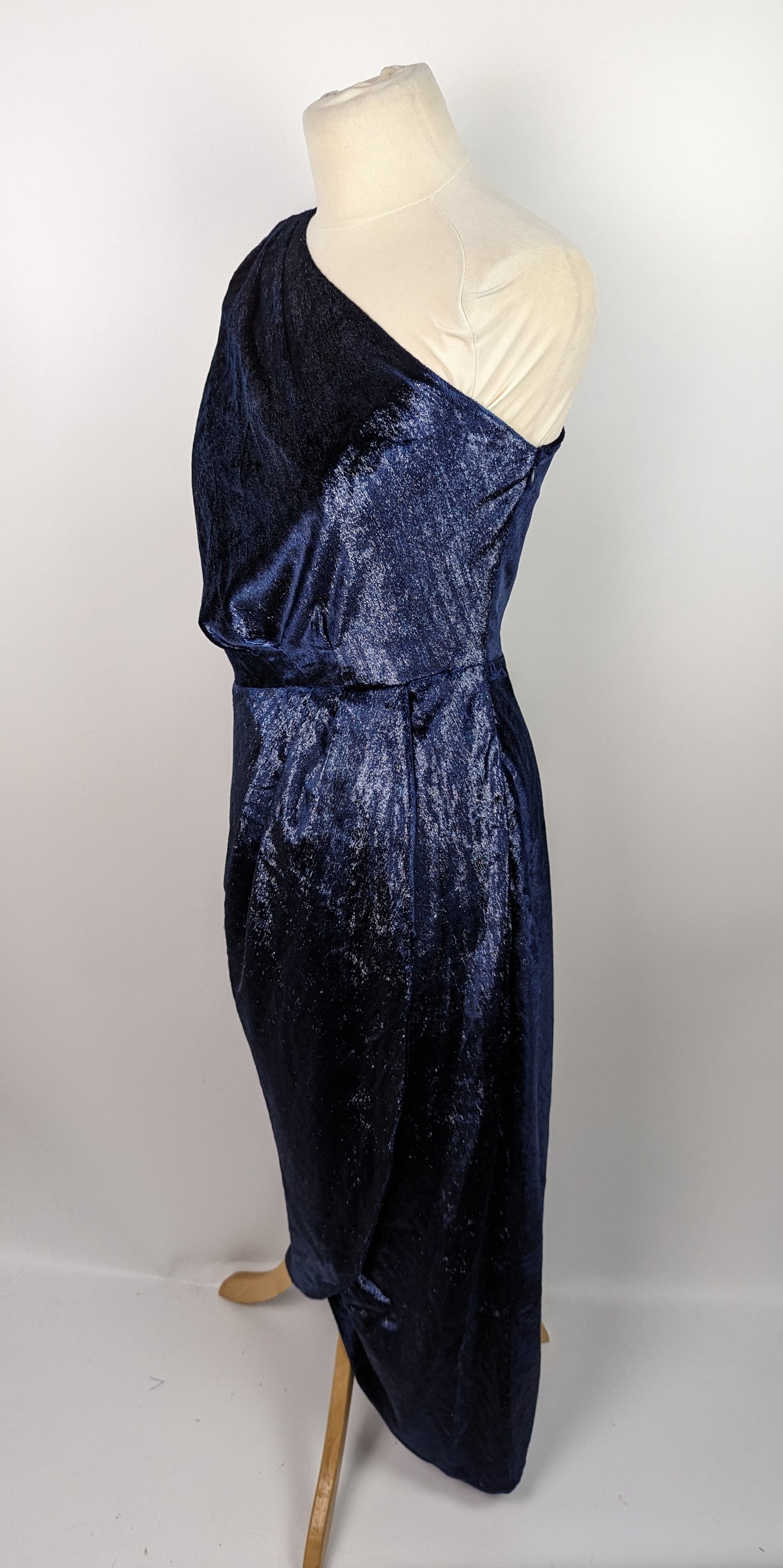 From Ted Baker, the Abinaa dress is crafted from super soft velour, balancing a one shoulder design. Covered in a metallic shine, this dress is a mid length with an invisable zip to fasten.