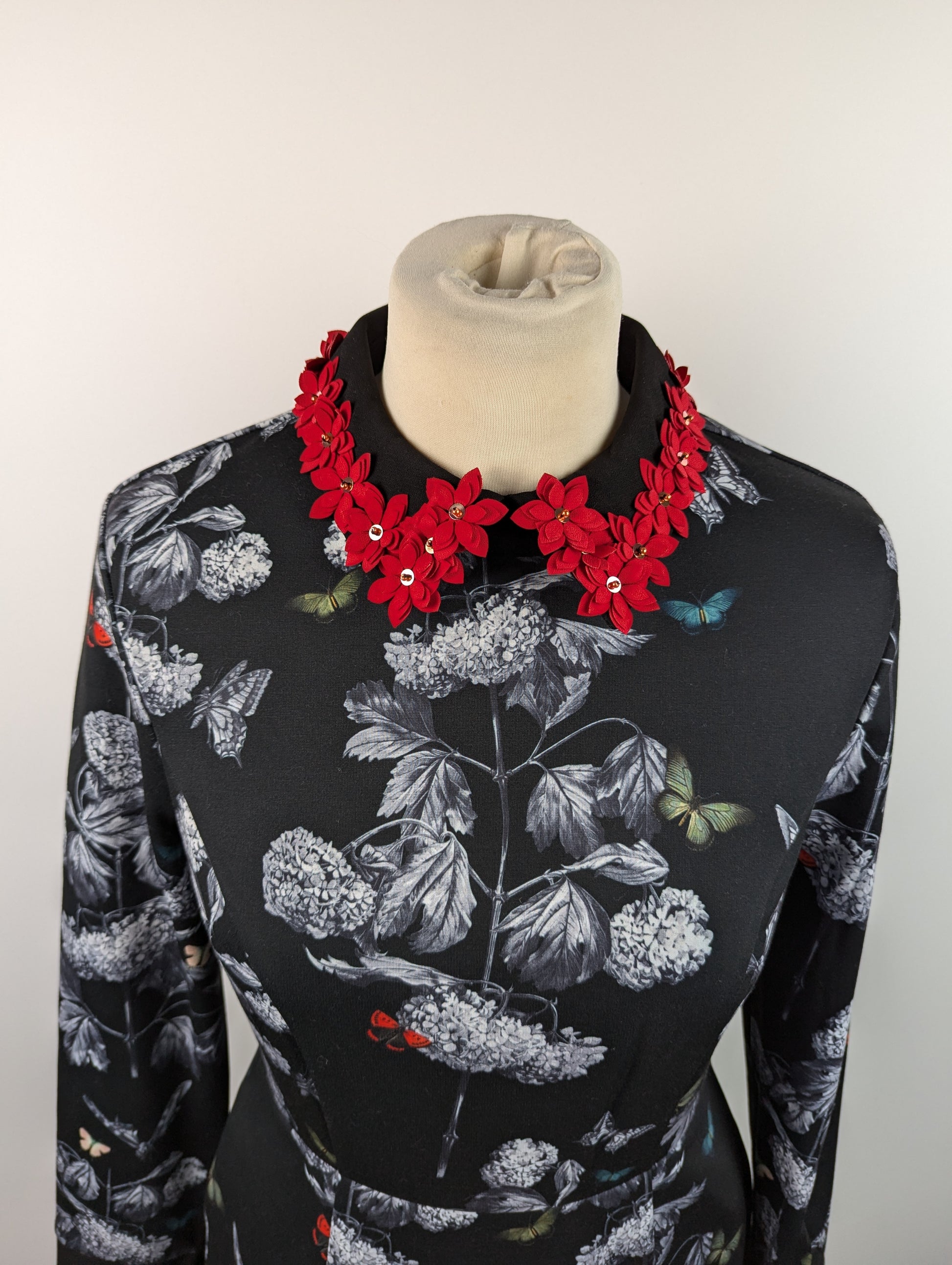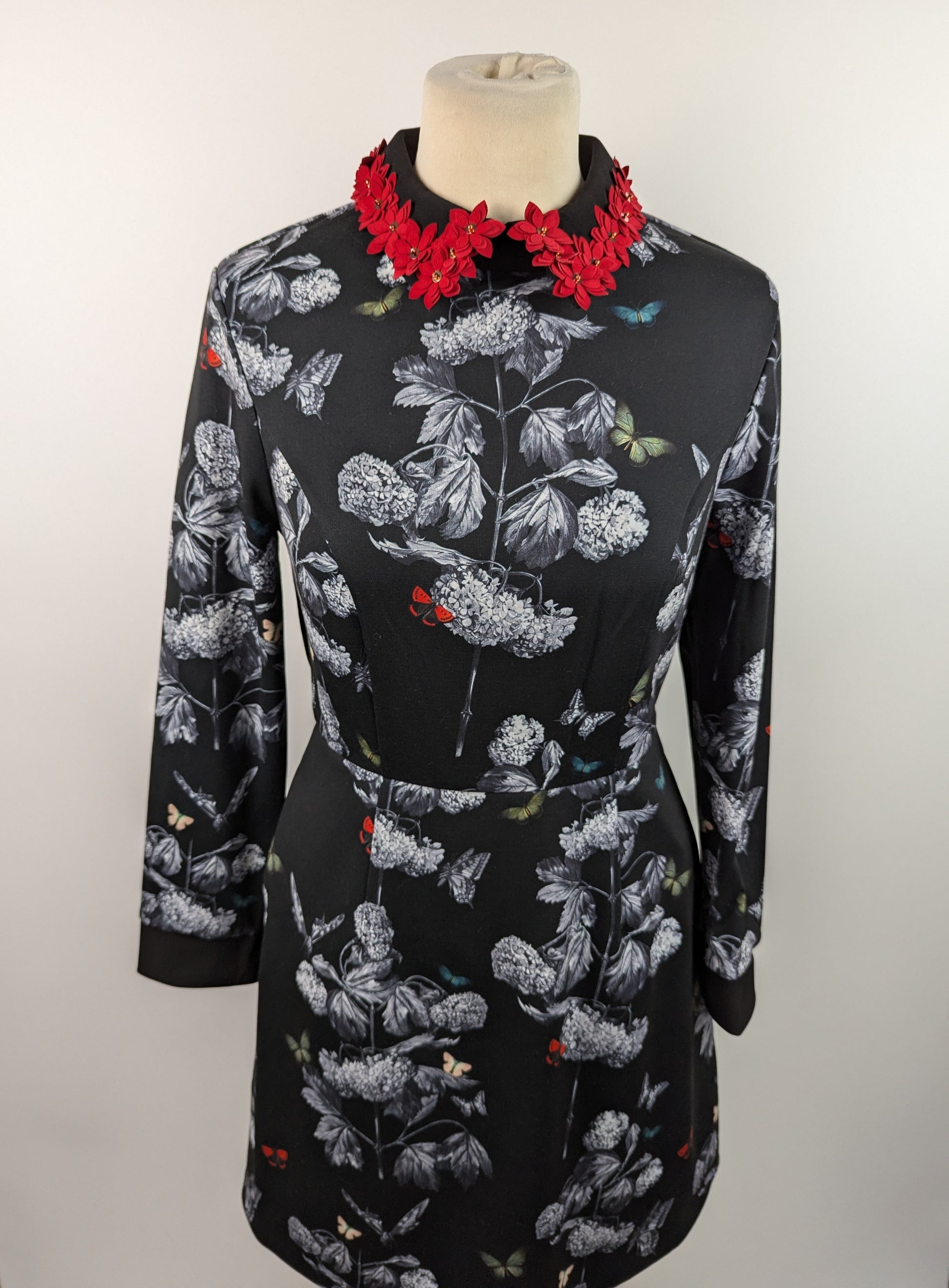 The Ted Baker Amaliia Narnia Collar Carnatic Dress in Black features a beautiful floral print and red flowers accenting the collar. It includes a zipper for easy fastening at the back and has long sleeves for added coverage.