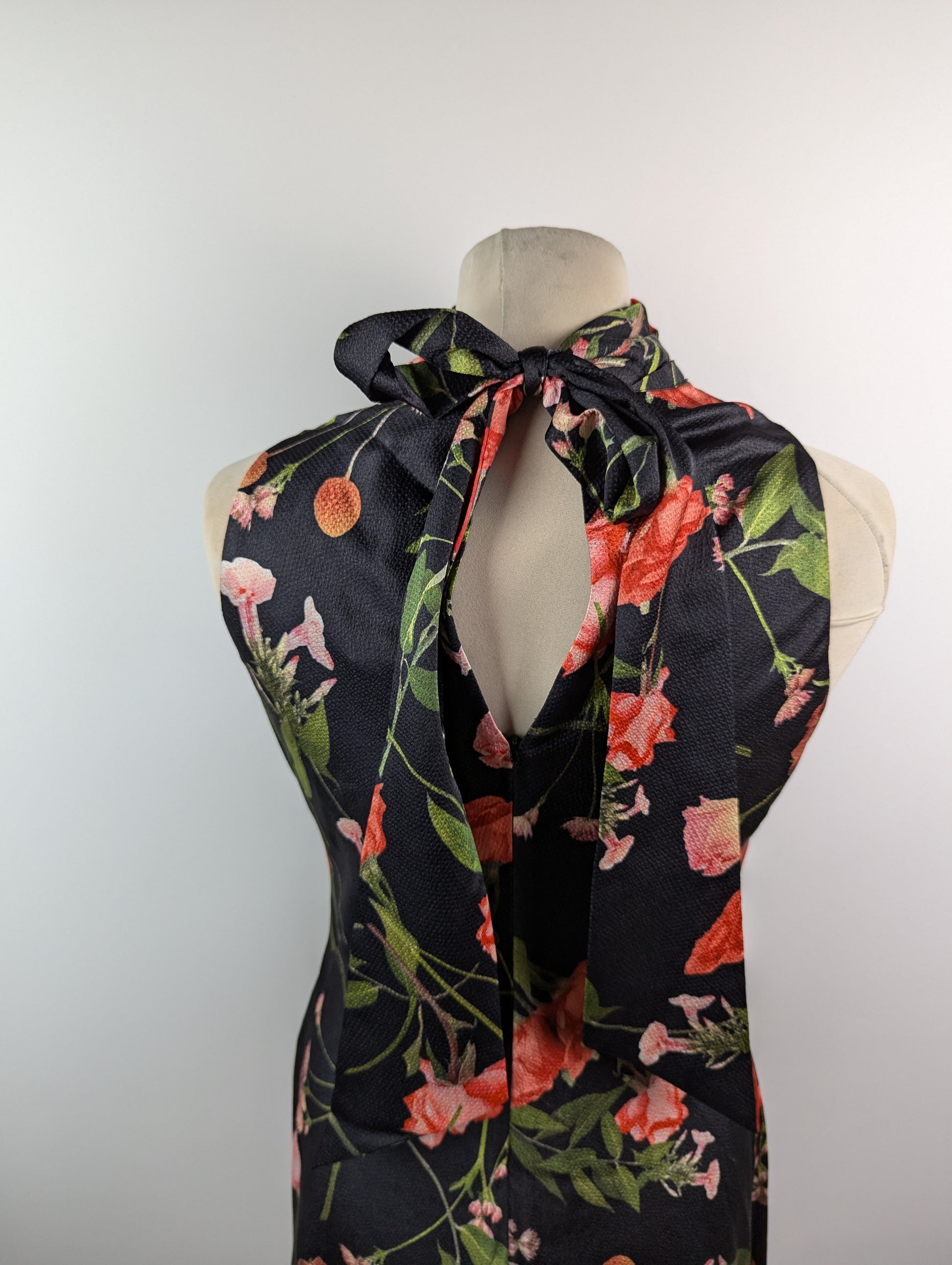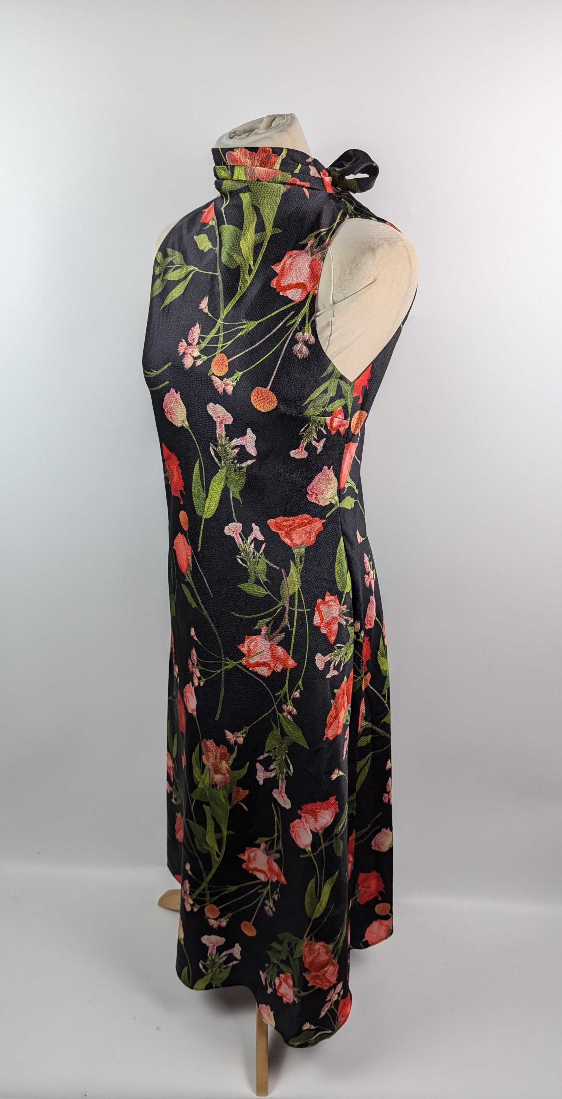 Crafted from 100% polyester, this midi dress features a halter neckline and sleeveless design. It showcases a fitted waist and an all-over floral pattern, secured with a zip closure at the back for a tailored fit.