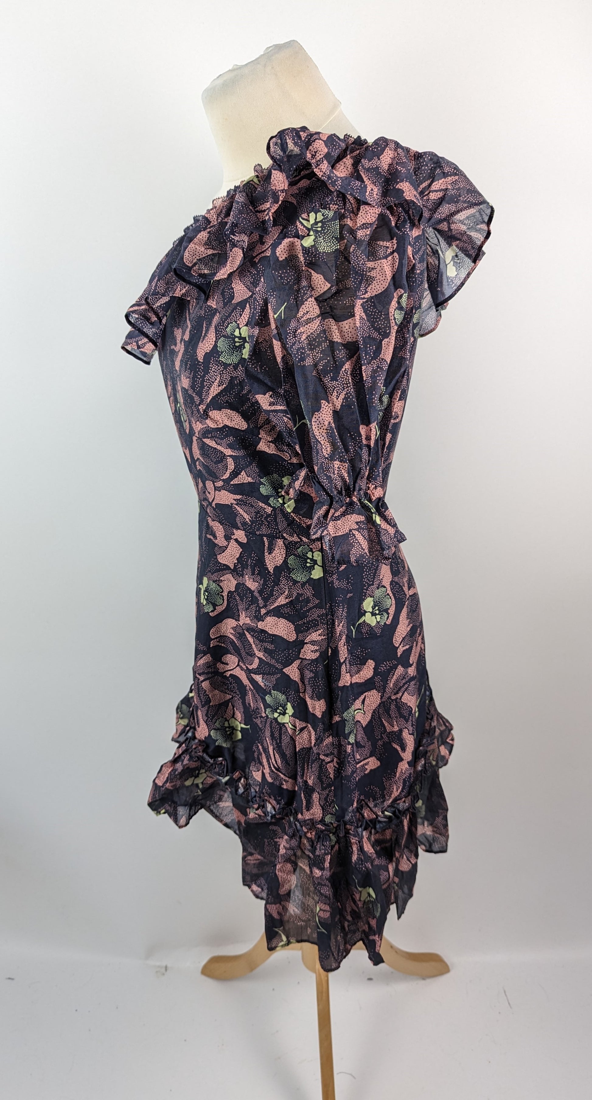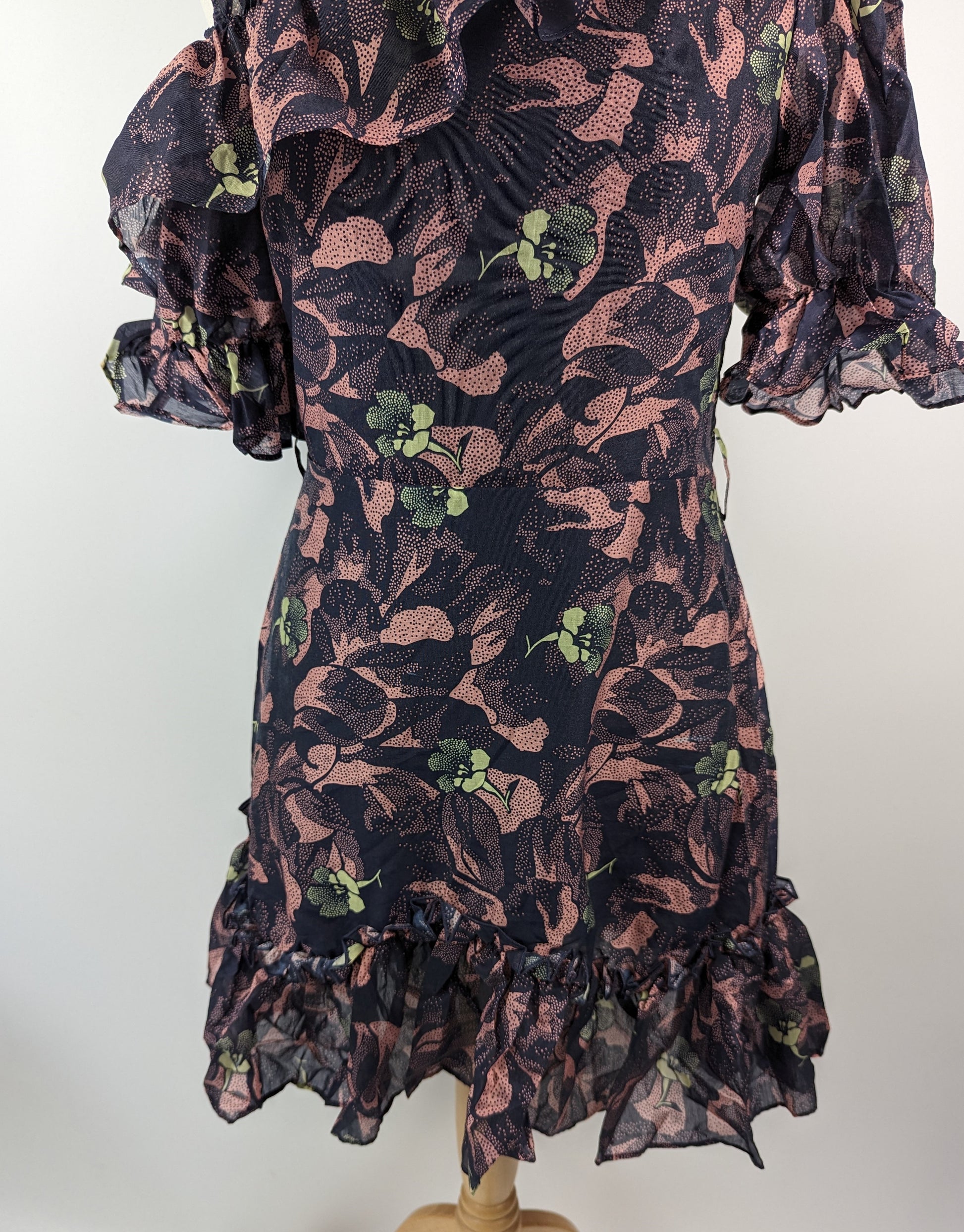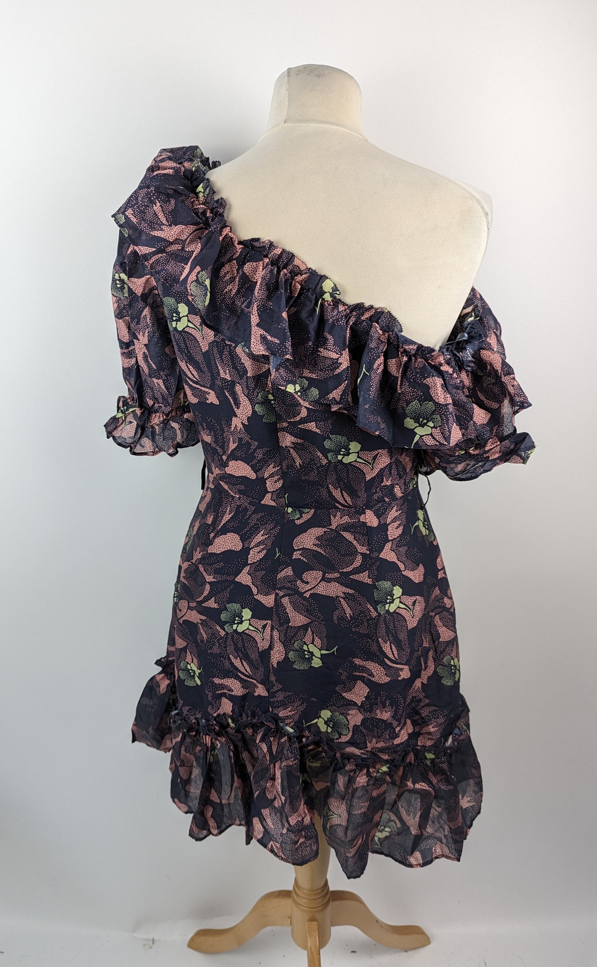 Your new go-to party piece from Ted Baker, the Hazpin design is a mini dress with extra character. The dress showcases ruffle detail at the neckline and skirt hem to add dimension, and a cinched in waist to add shape. The asymmetric hem and neckline offer a trendy aesthetic, the look is complete with an all-over floral print. One Sleeve is off the shoulder and the other lays like a normal design.