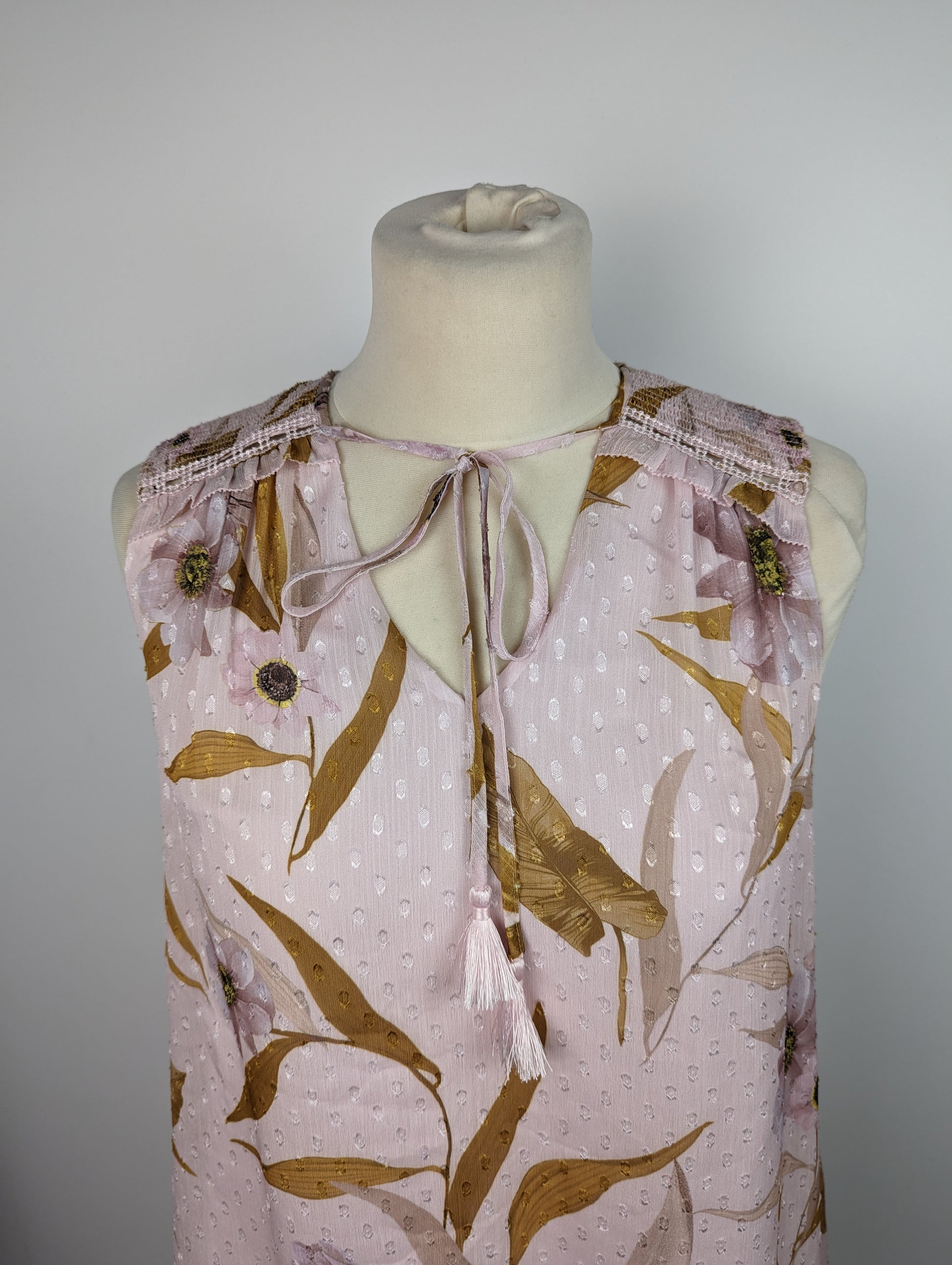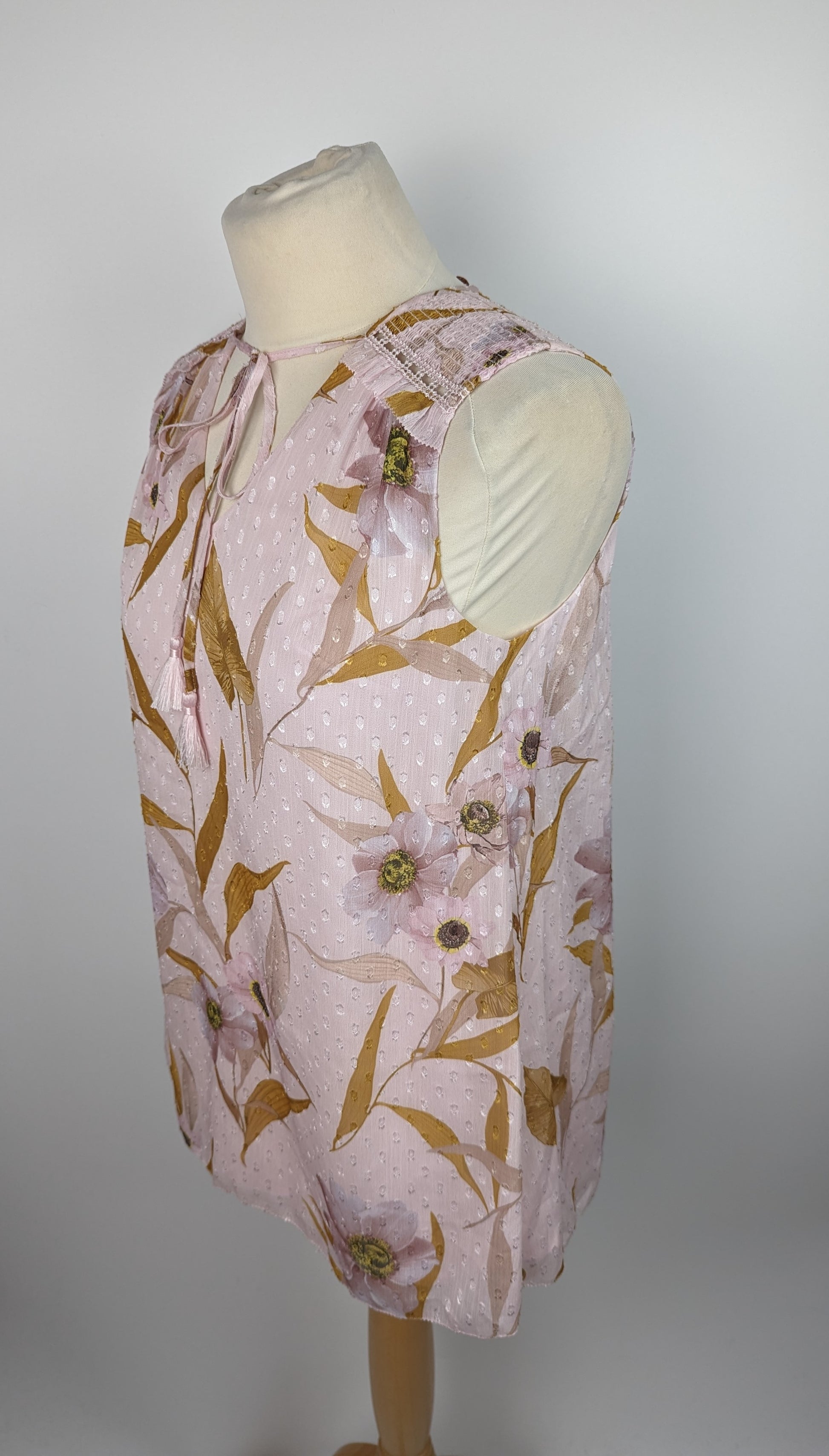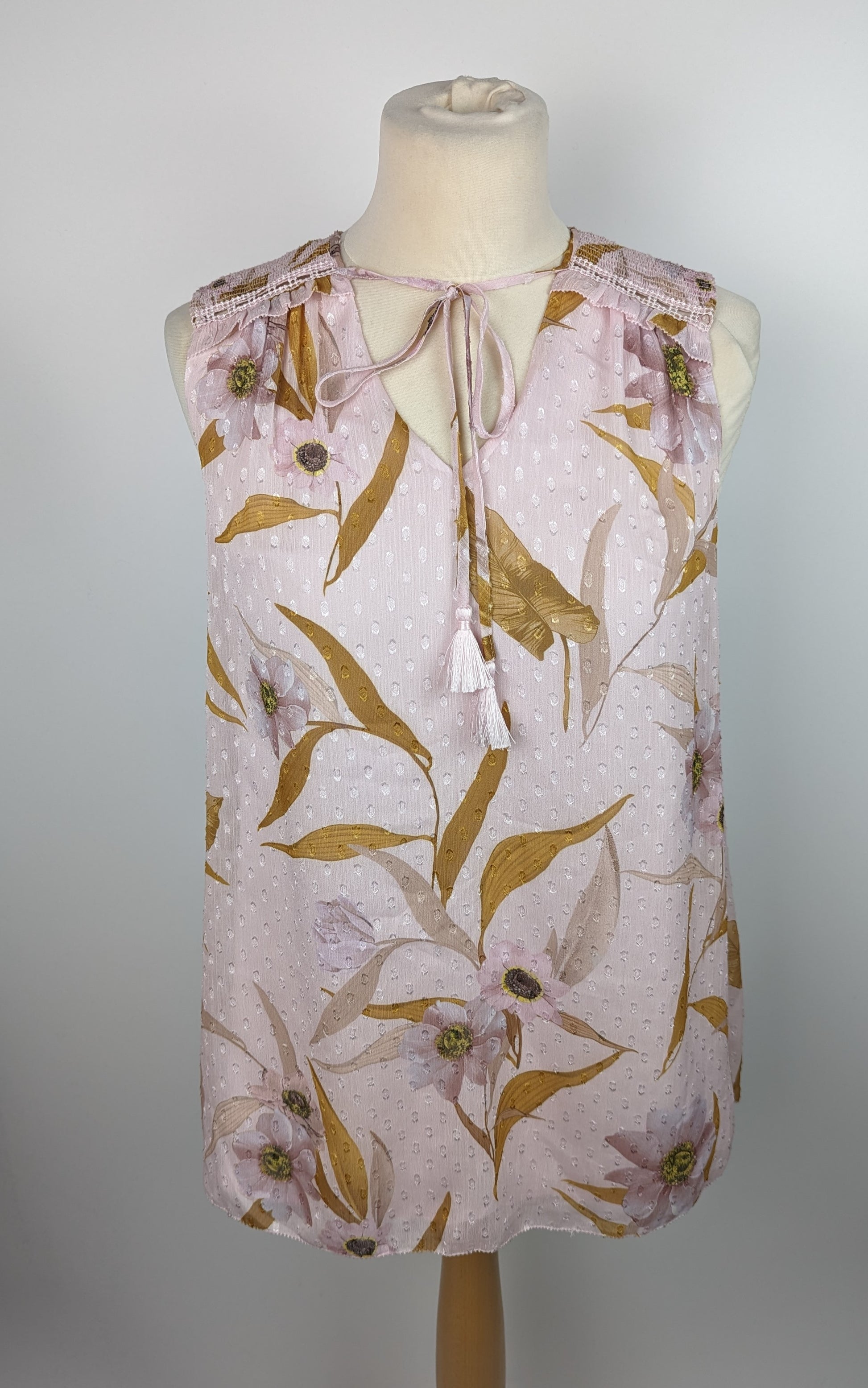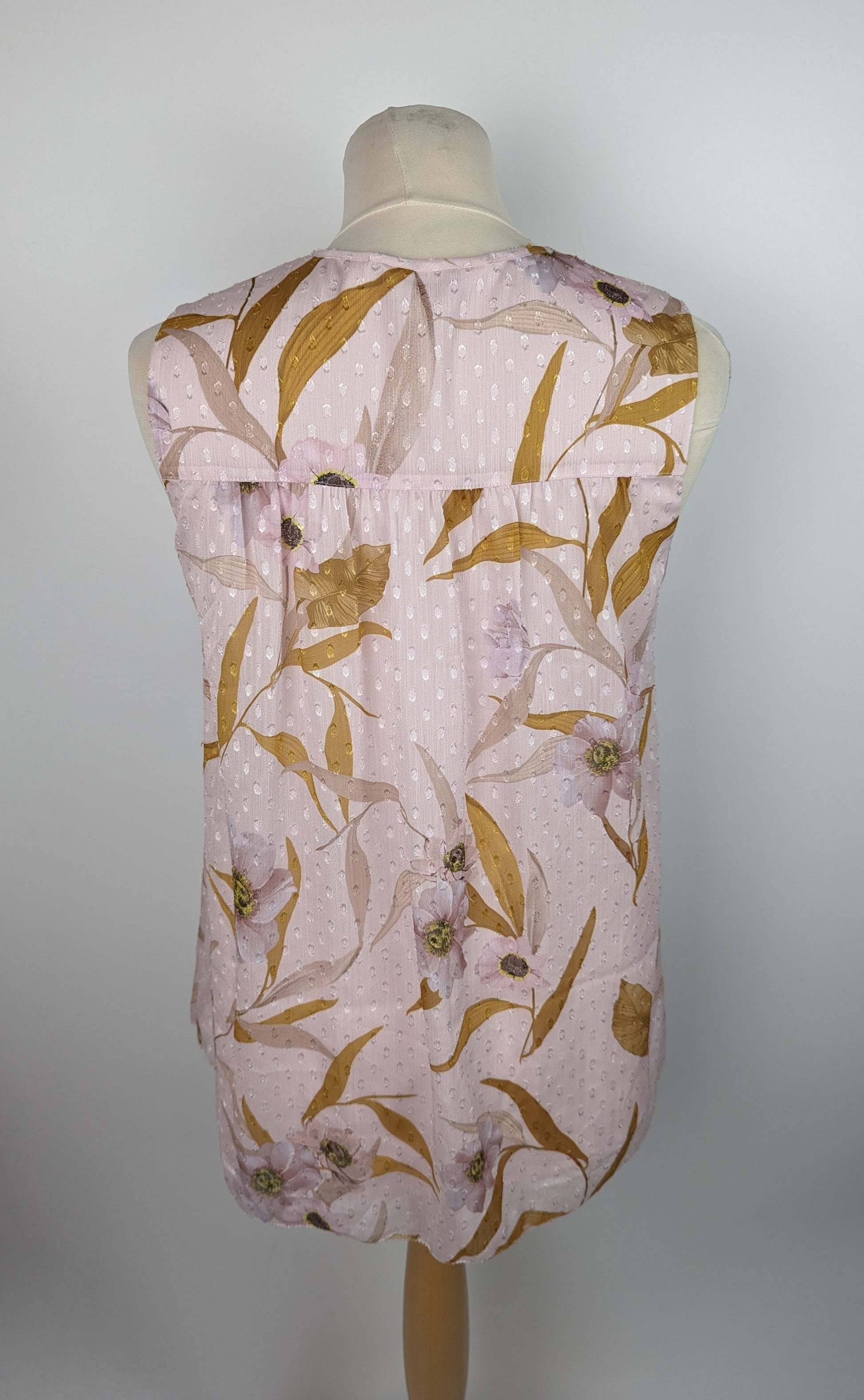 Comfortable, stylish and oh-so-flattering, the Jiylena top from Ted Baker is a refreshing design, and the perfect piece to solve ‘jeans and a nice top’ style dilemmas. A sleeveless, floaty piece in a delicate pale pink shade, the blouse is finished with a floral pattern and rich gold leaves. Ruched detailing at the shoulders and a slim tie to the neckline add detail to the design.