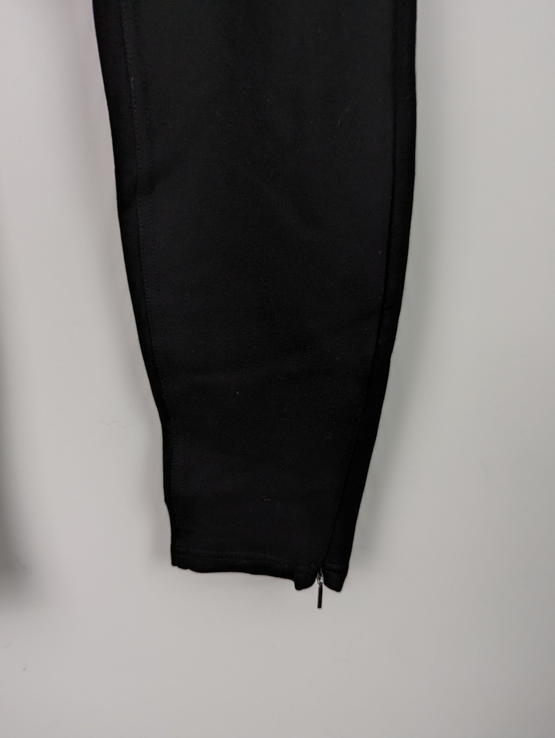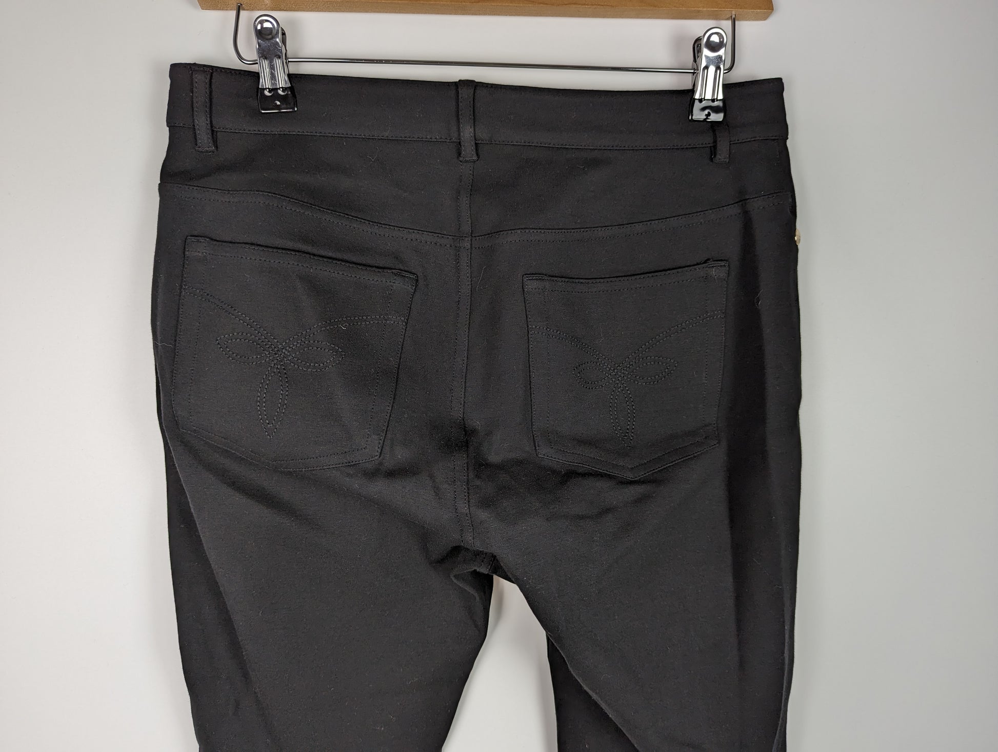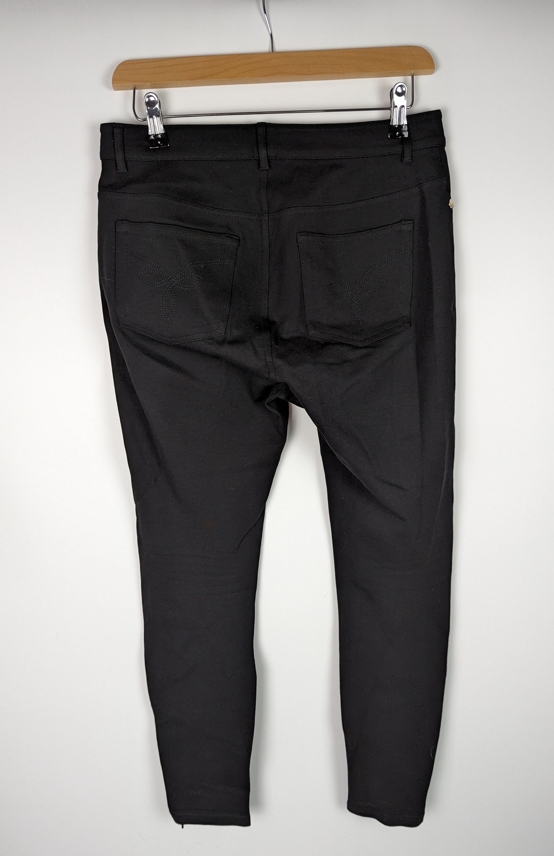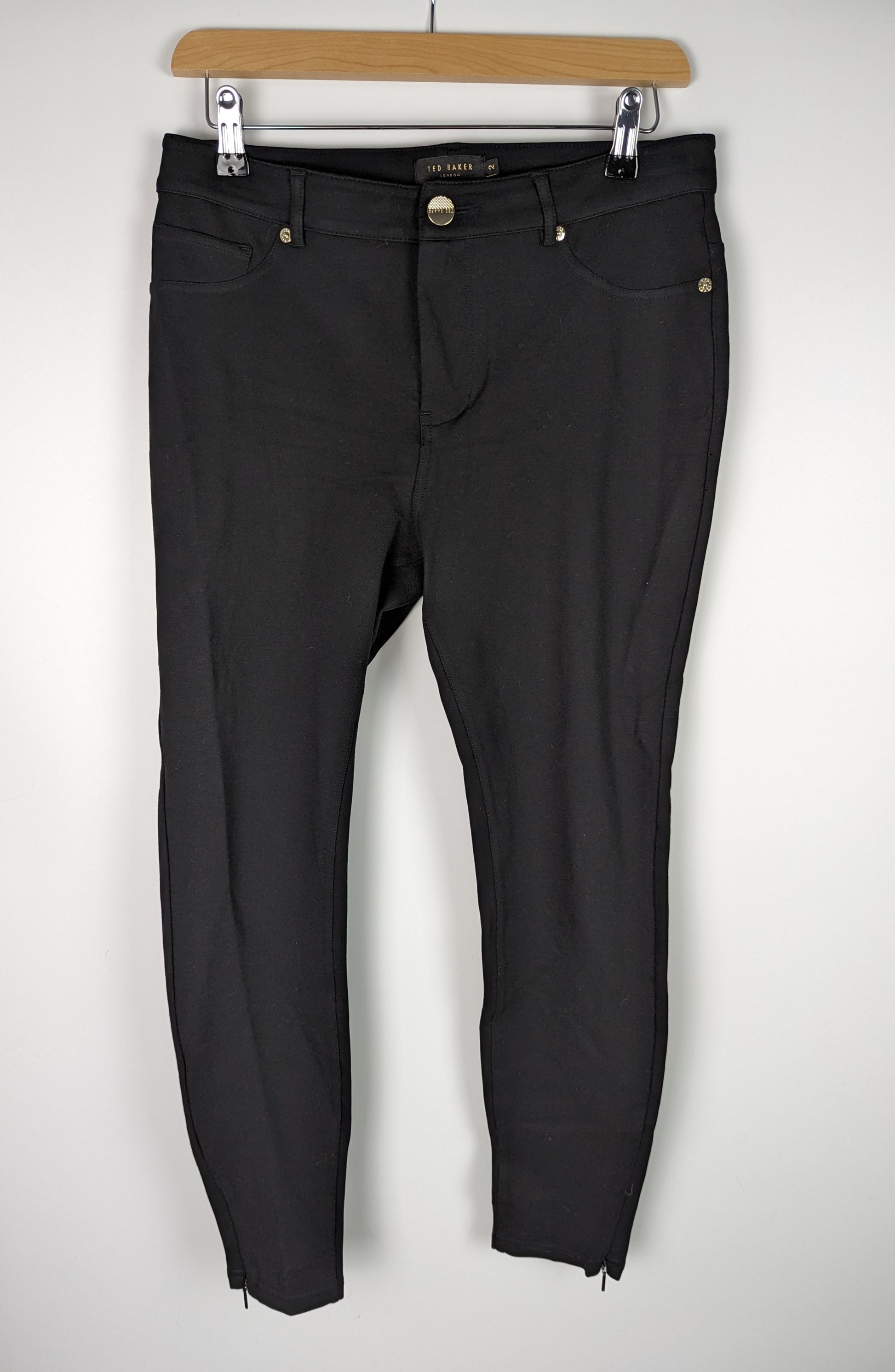 Classic pair of jeggings by Ted Baker. The Strenti design combines elements of jeans and leggings for a slim fitting, flattering style with plenty of stretch to keep you comfortable all day. In block black colouring, the jeggings feature belt loops, a zip fly and button fastener, with contrasting gold tone hardware engraved with subtle branding. Zips at the ankles allow for a different fit and look. The Strenti jeggings perfectly compliment a wide range of outfits and are perfect across all seasons.