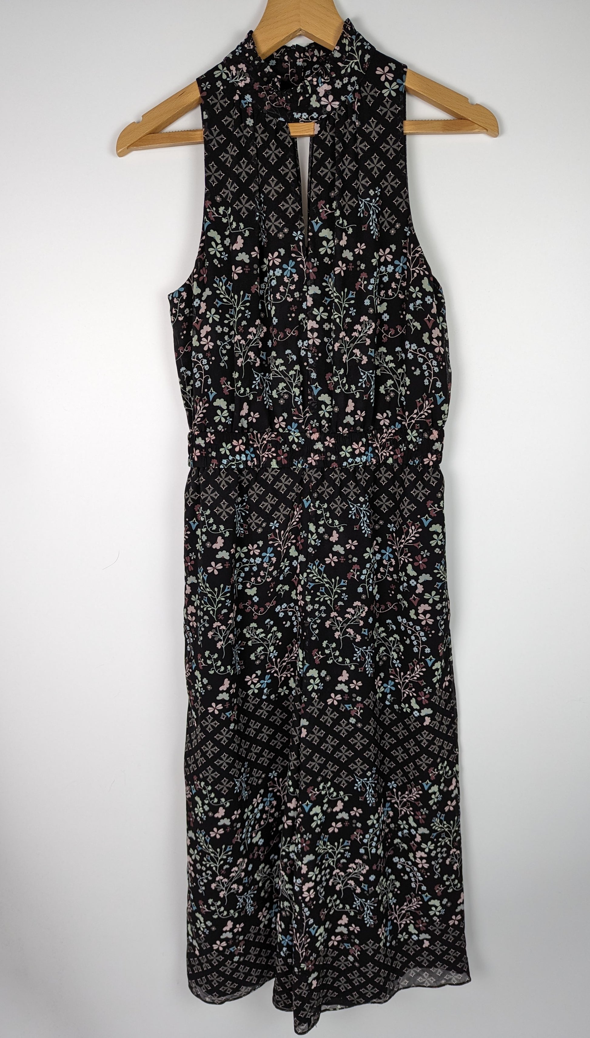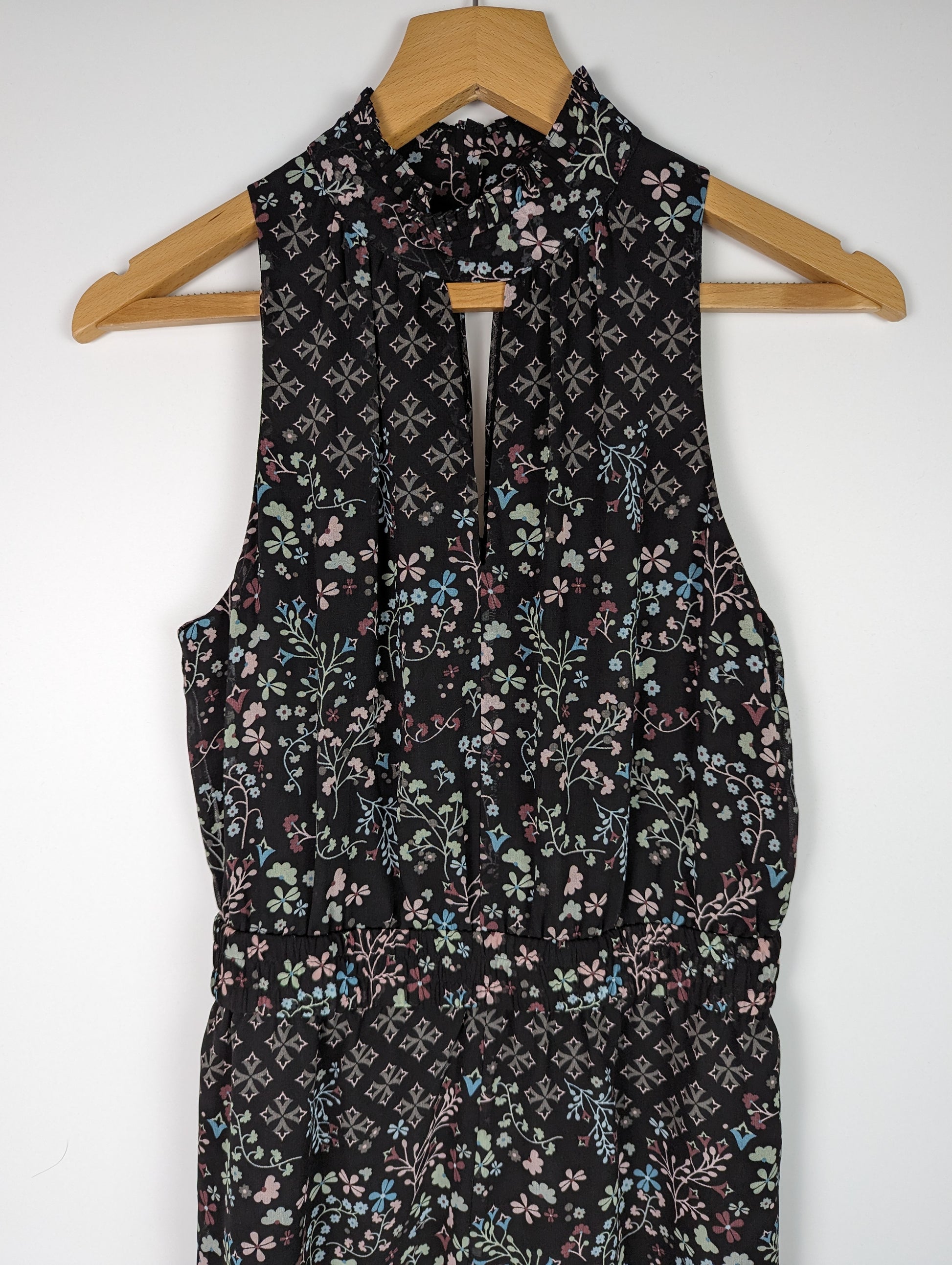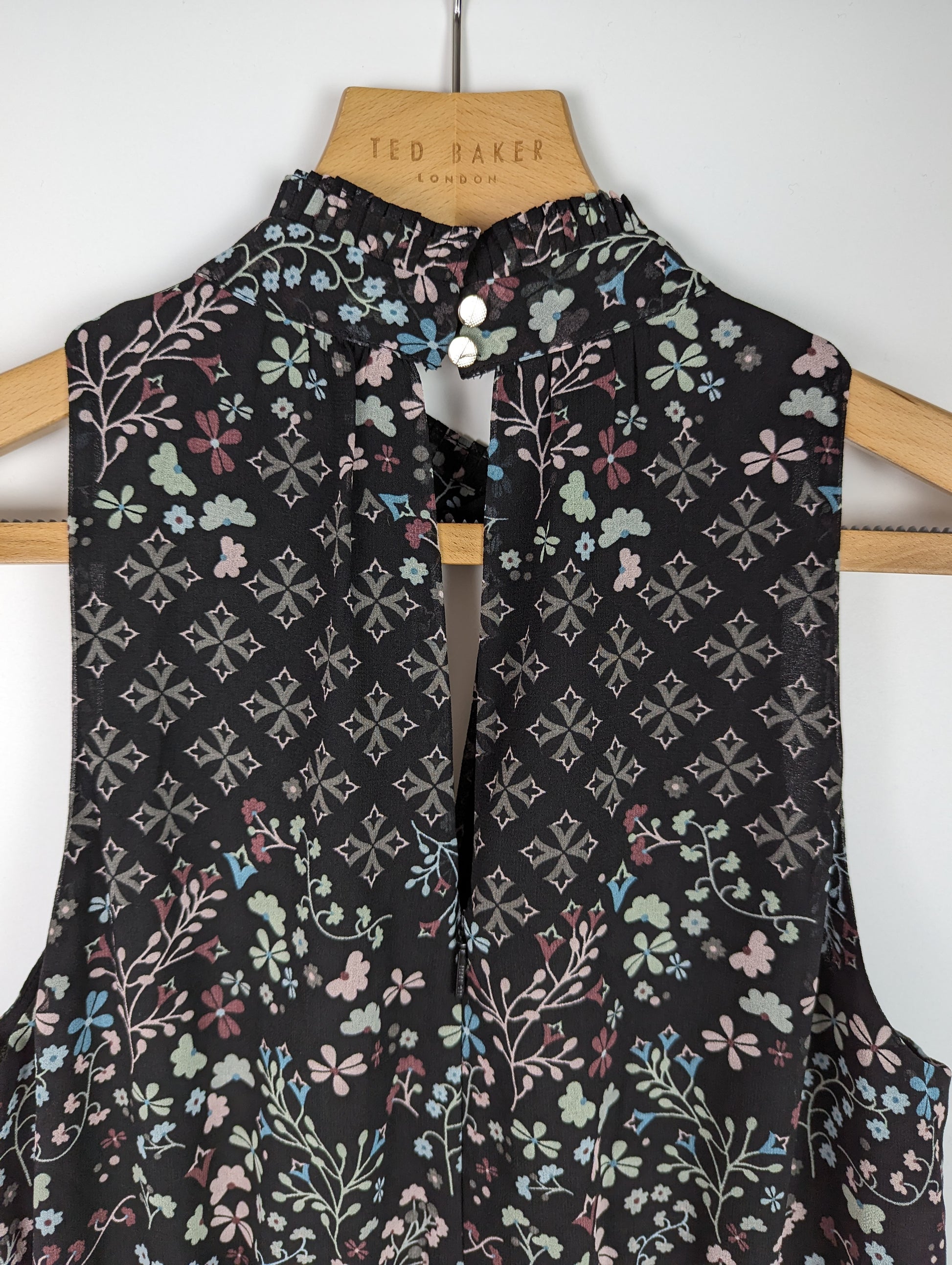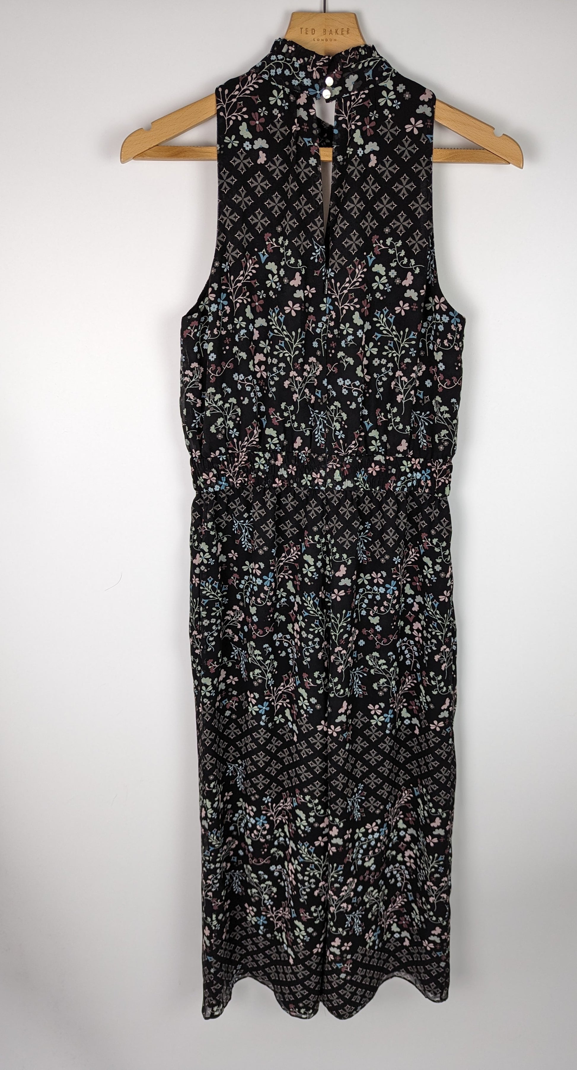 Beautiful formal jumpsuit by Ted Baker. The Marcila is the perfect pretty one piece for your next evening out or special event. Crafted in a semi sheer, lightweight fabric with lining, the jumpsuit is a striking black with all over ditsy floral print. It has a sophisticated high neck with button fasteners, and fitted, elasticated waistband for added fit and shape. Finished with a concealed zip fastener down the back. A stunning addition to your eveningwear wardrobe.