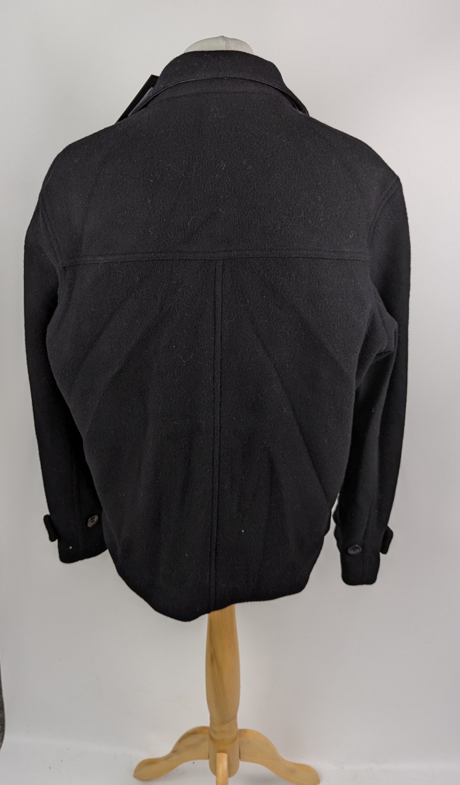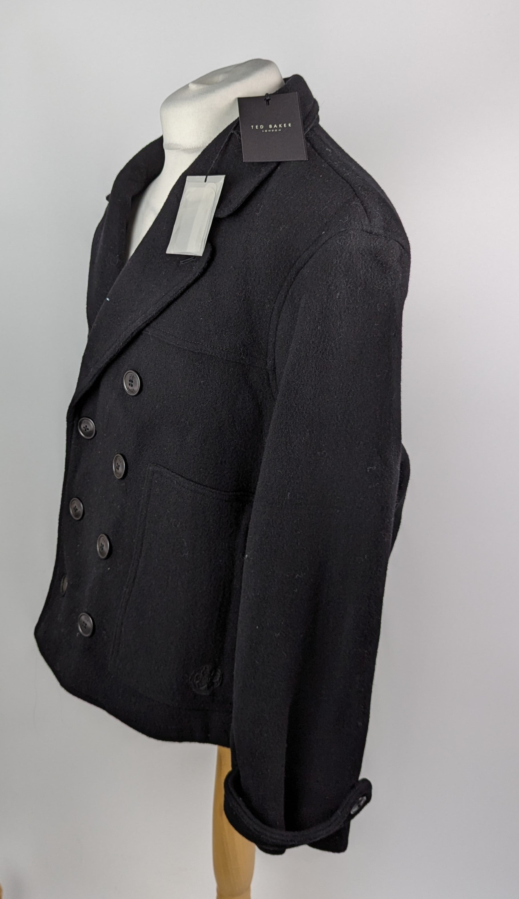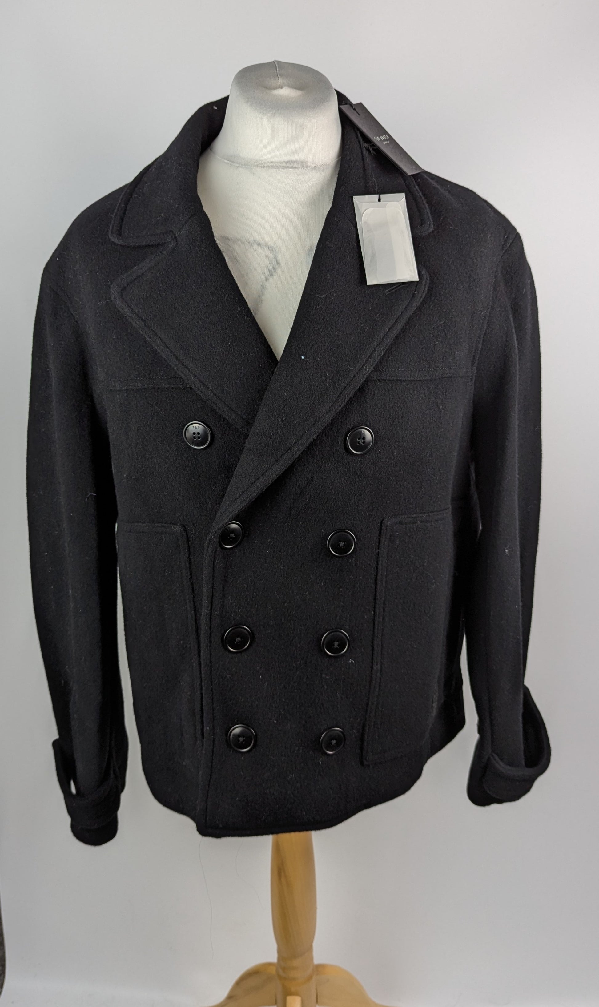 Expertly crafted, this black Atllas peacoat features a notch lapel, button cuffs, and front pockets for a sophisticated look. The double-breasted button front is made from a high-quality blend of 70% wool and 30% polyamide, ensuring warmth and durability. To maintain its impeccable appearance, we recommend dry cleaning only.