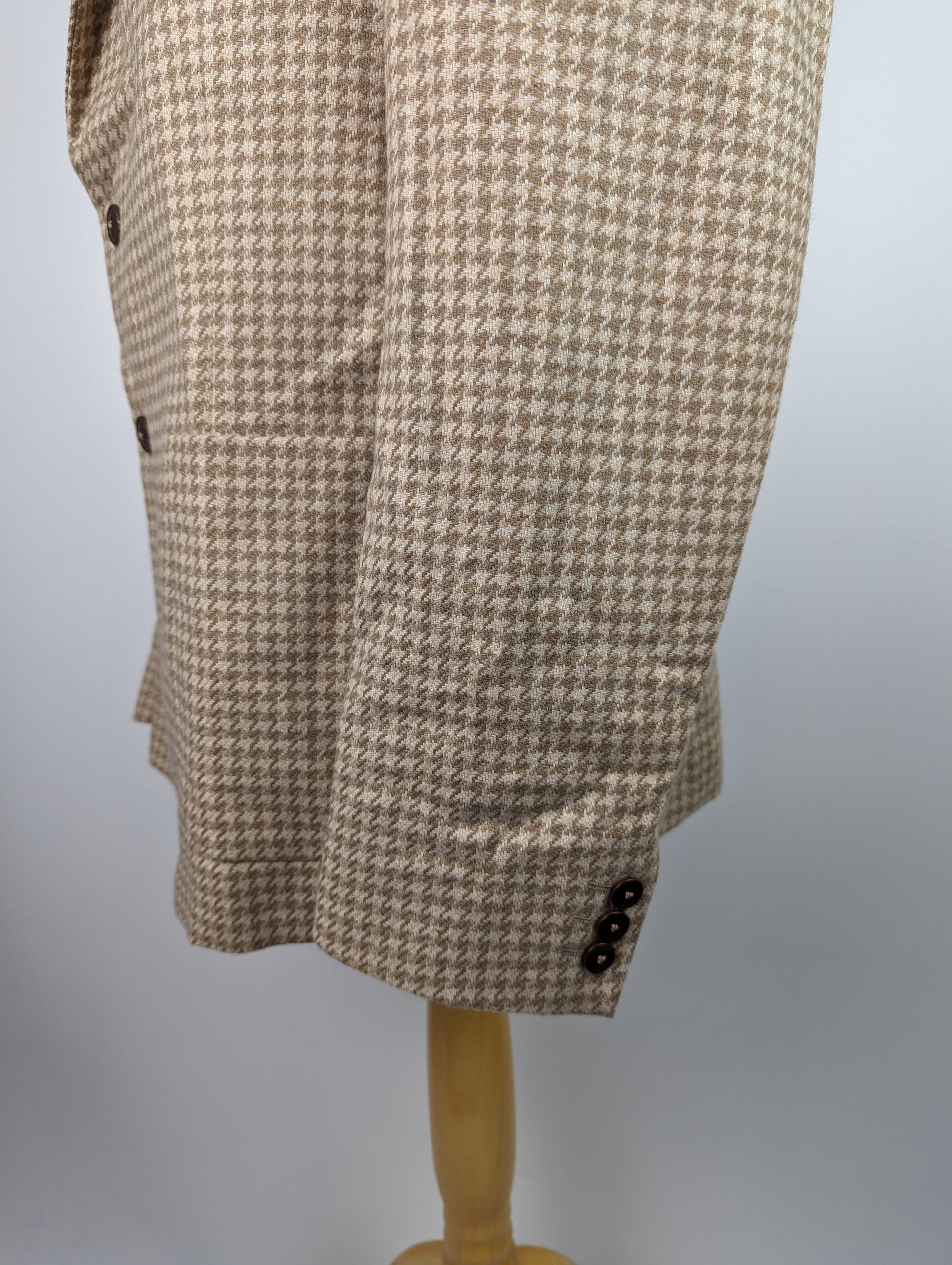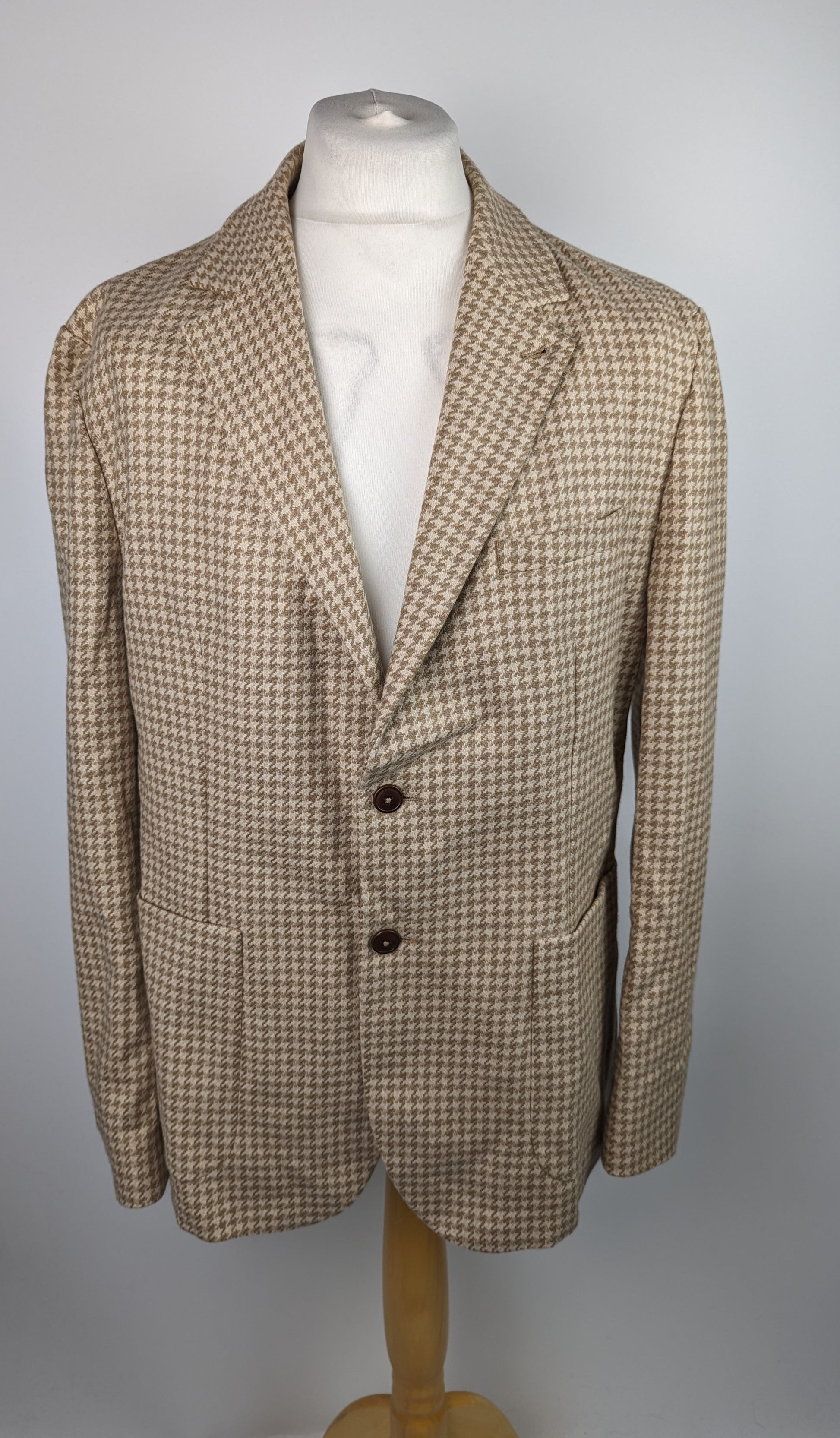 This blazer features a tan brown color, complete with a dogtooth pattern and two fornt open pockets. It is made from a blend of 52% cotton, 33% wool, 14% polyamide, and 1% other fibers. The blazer fastens with two buttons.