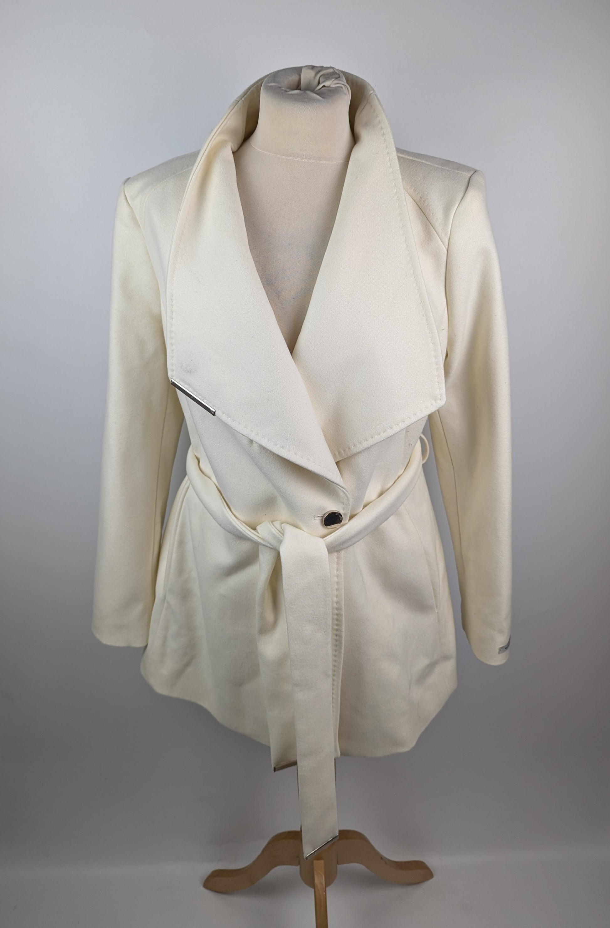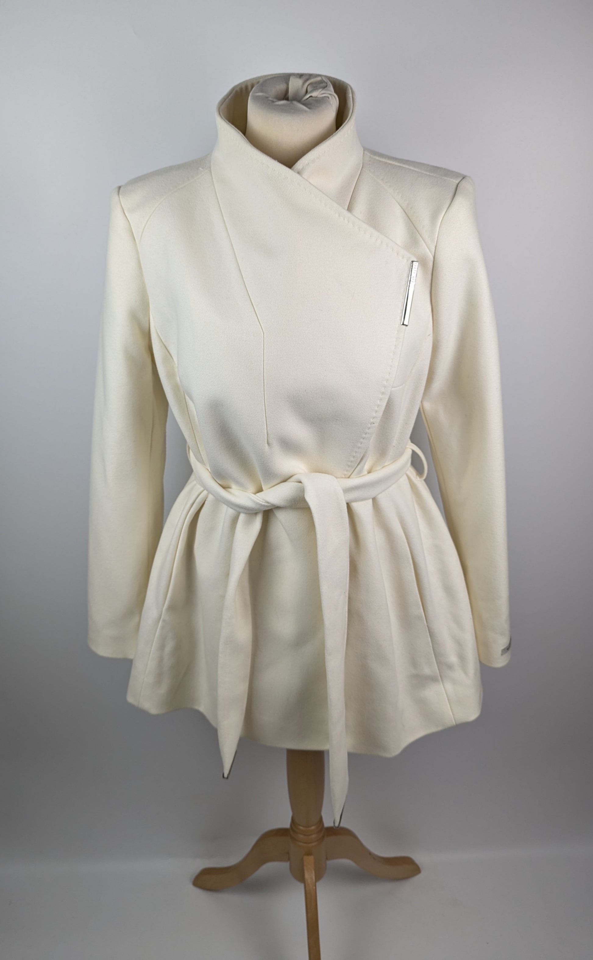 Distinguished tailoring meets modern design in this Ted Baker short overcoat. The wrap-style silhouette features a dramatic fold-over collar and metallic hardware detailing that adds a contemporary edge. A self-tie belt cinches the waist, creating a flattering shape while maintaining practicality. The clean lines and precise cut demonstrate exceptional attention to detail, from the long sleeves with branded cuff details to the practical side pockets.