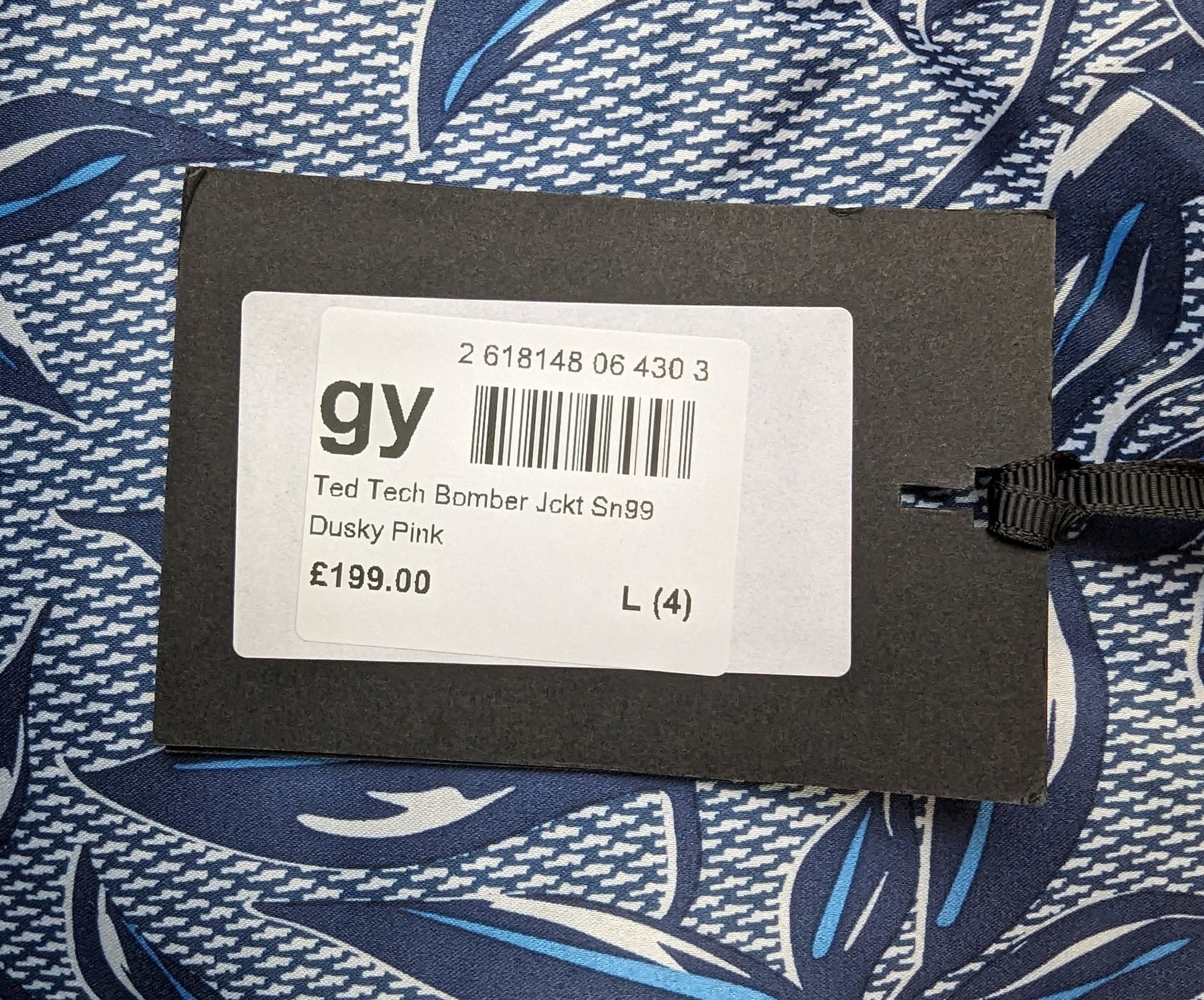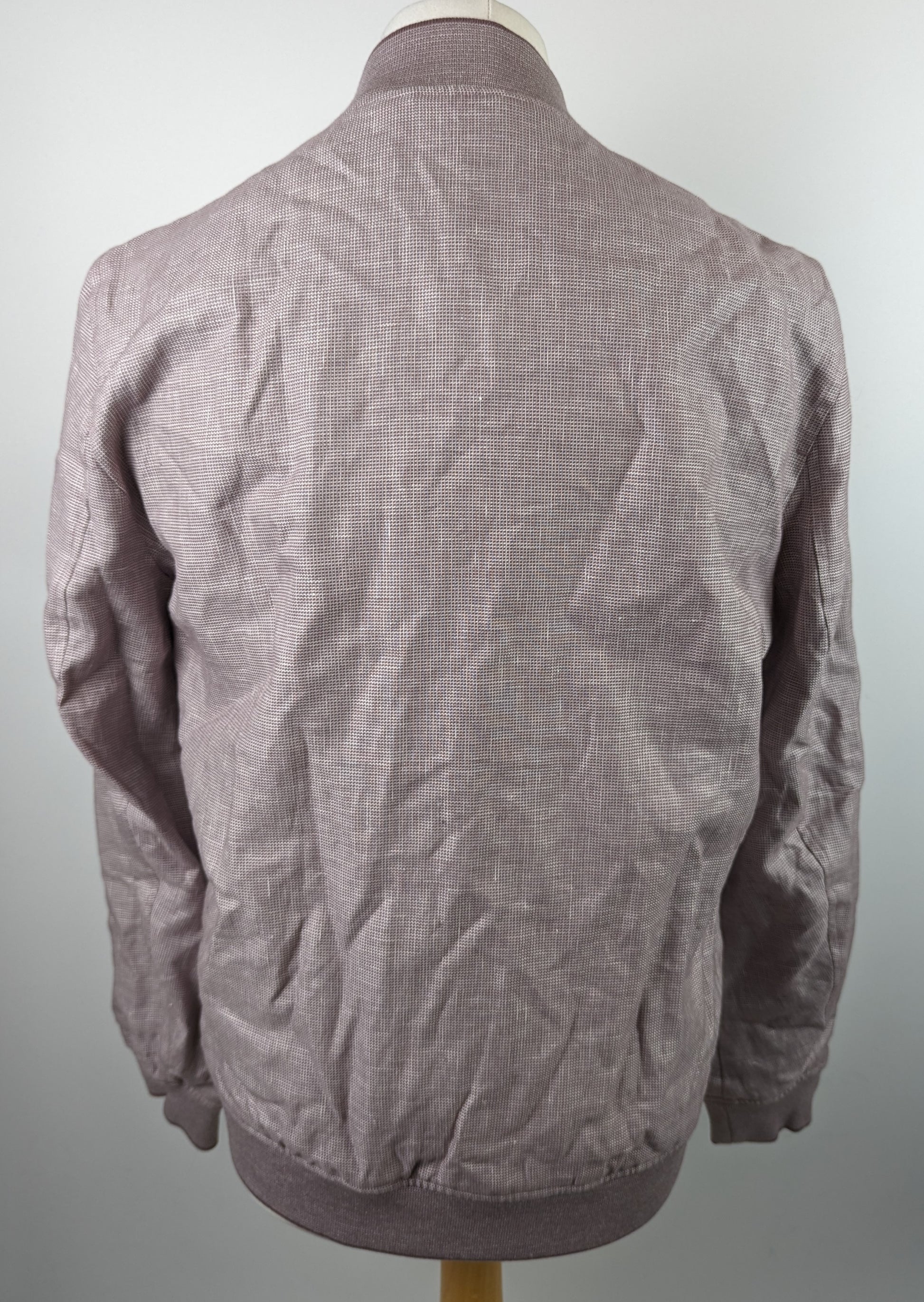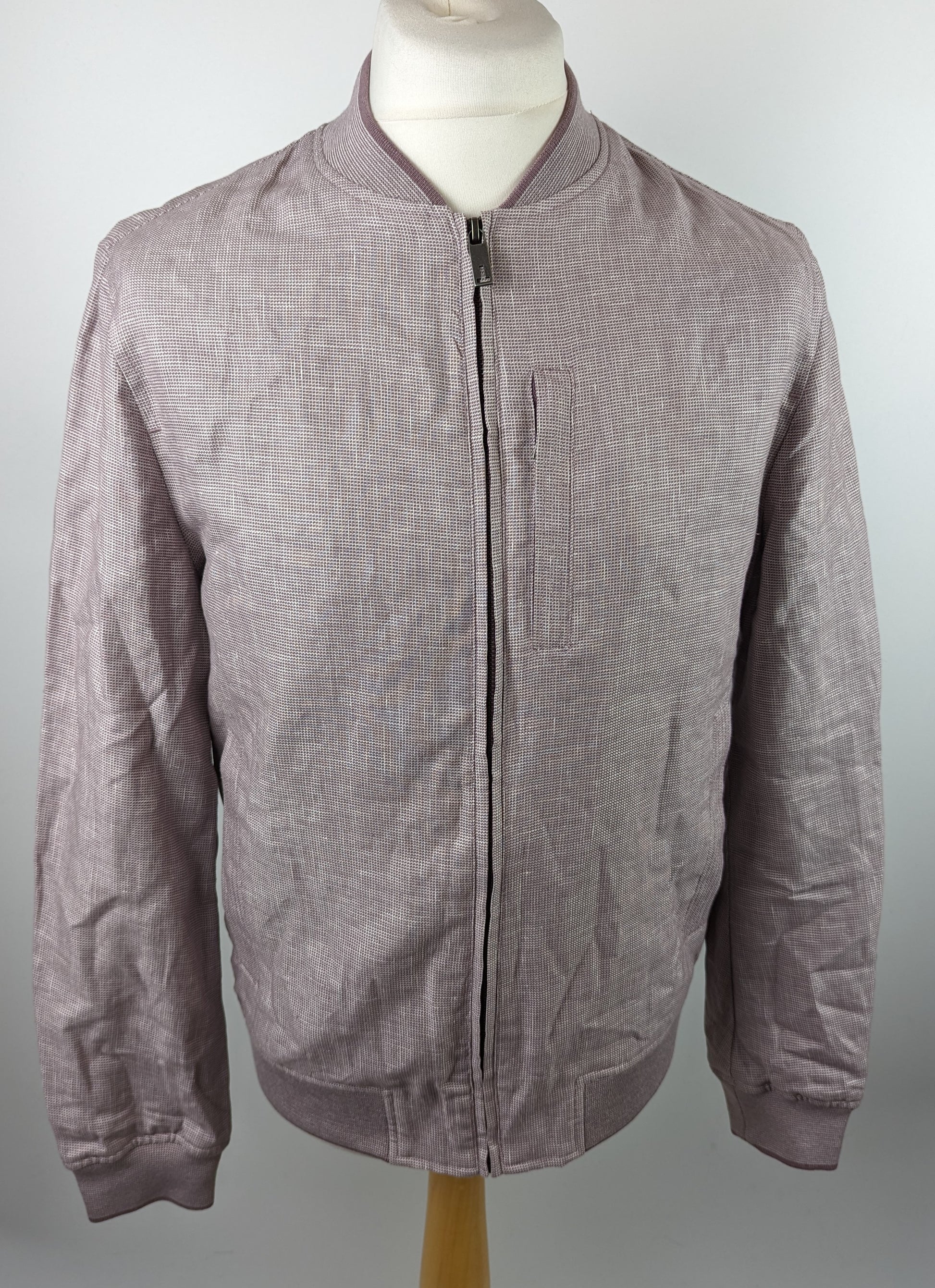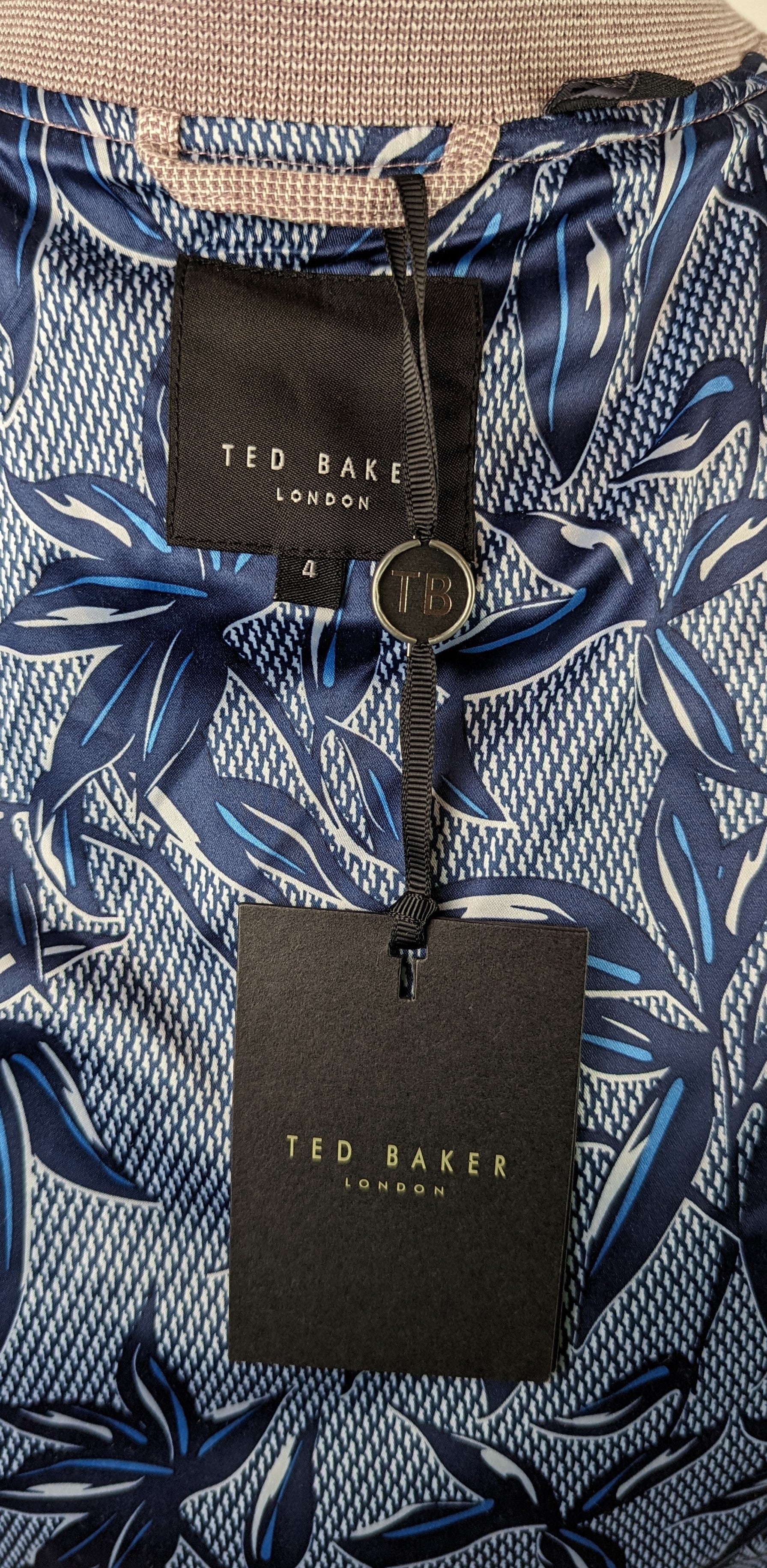 Add some class to your collection with this TED BAKER Tech Bomber Jacket. Crafted in dusky pink pattern linen and cotton blend fabric, the colourway is perfect for the changing seasons. Accompany with jeans for everyday wear, or trousers for a more formal or work occasion. The jacket features comfortable ribbed trims, and three external pockets. The inside is lined with a striking blue satin feel, leaf print fabric, creating the perfect contrast with the muted outer. A further internal pocket is included for your personal items.