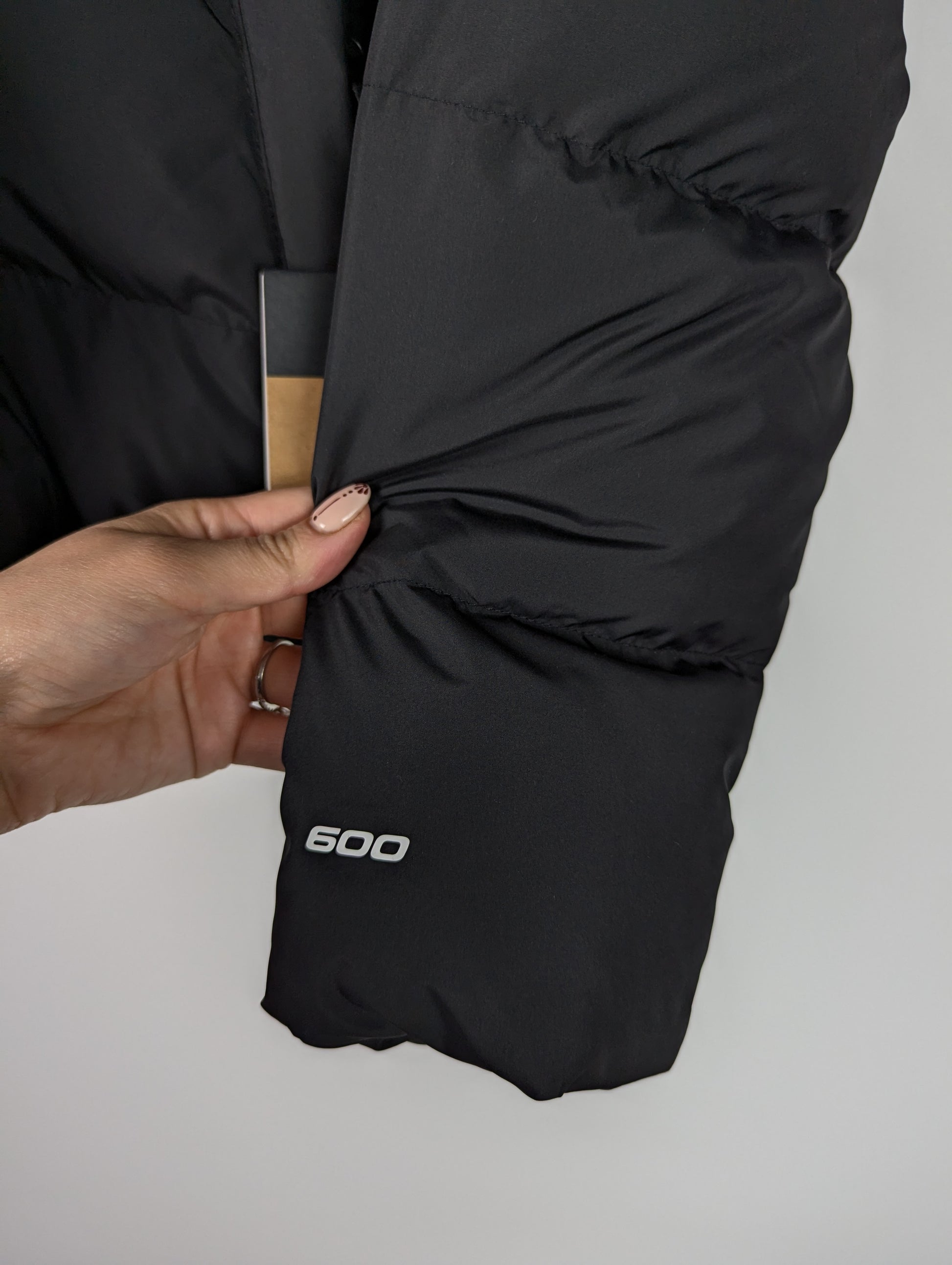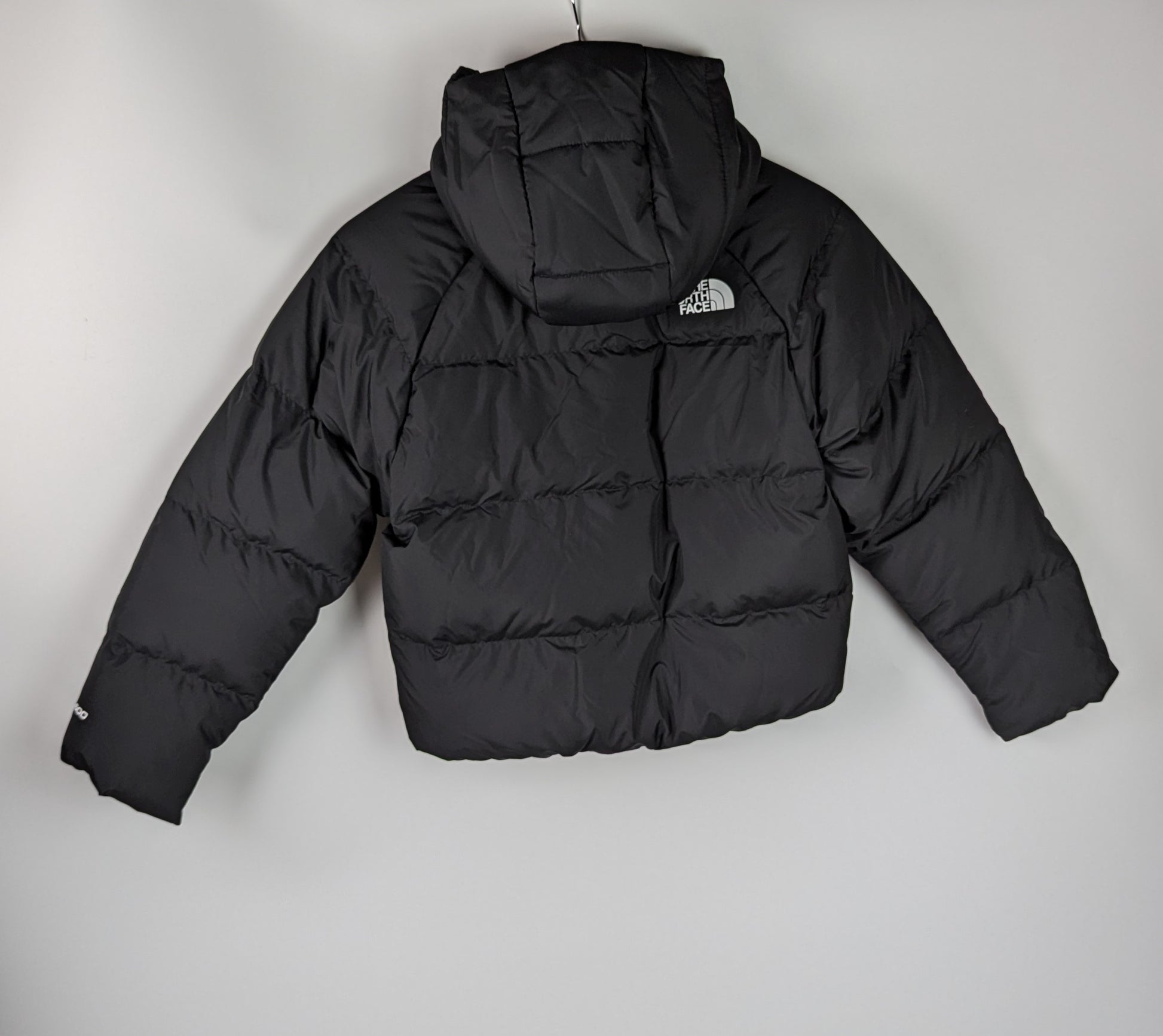 This girls' black down jacket from The North Face features a funnel neck and long sleeves with a zip-up closure. Water resistance, a secure-zip chest pocket, hand pockets, and elastic binding on the hood, cuffs, and hem for a snug fit.