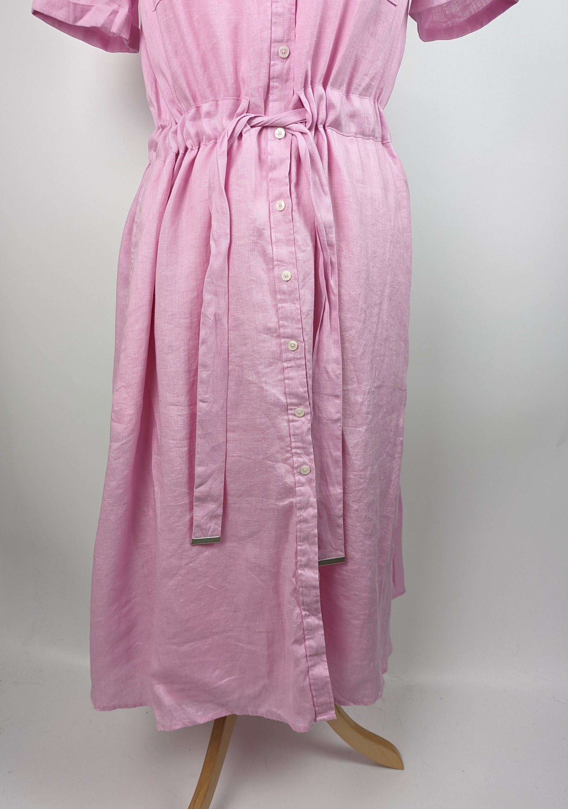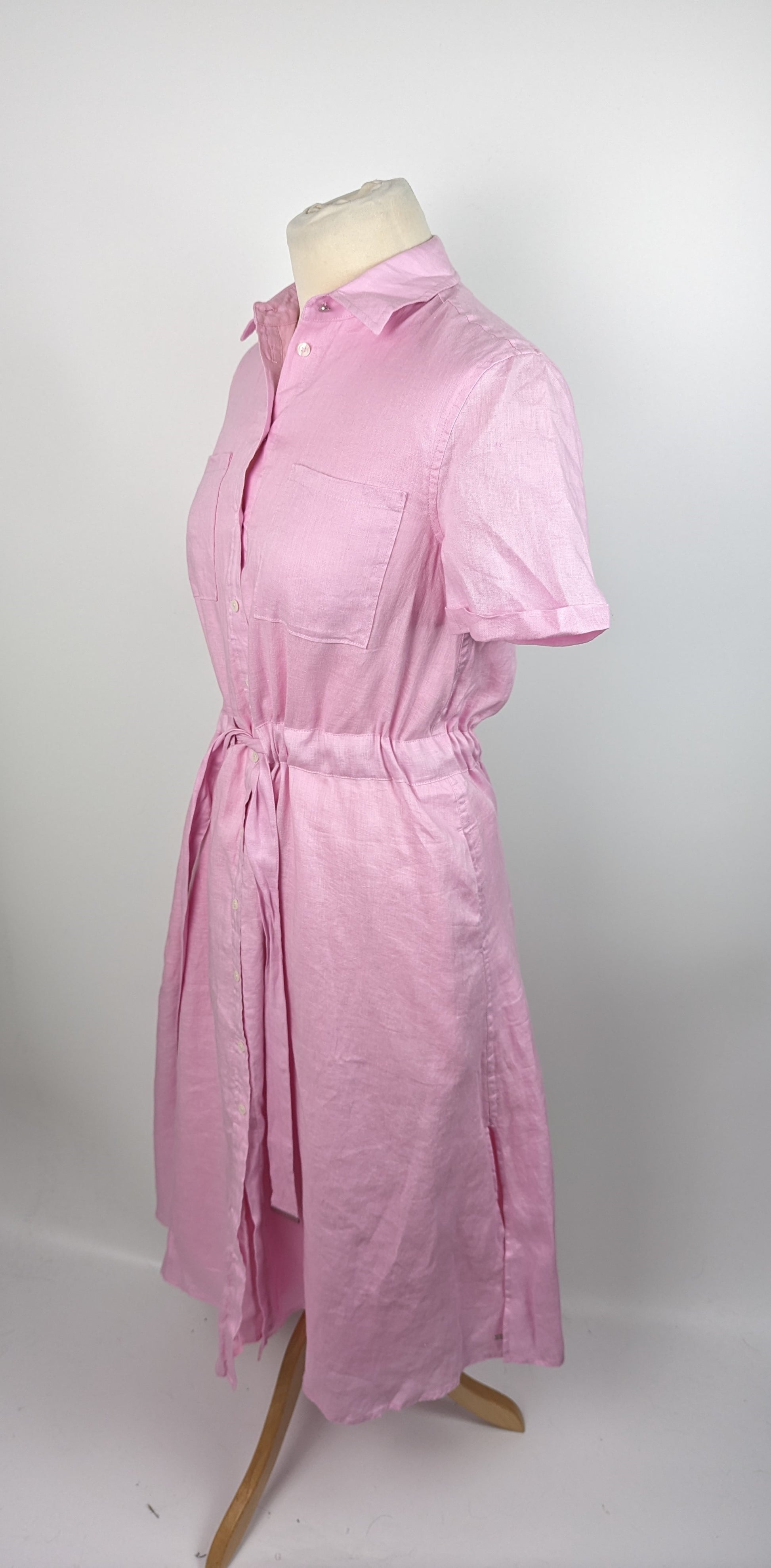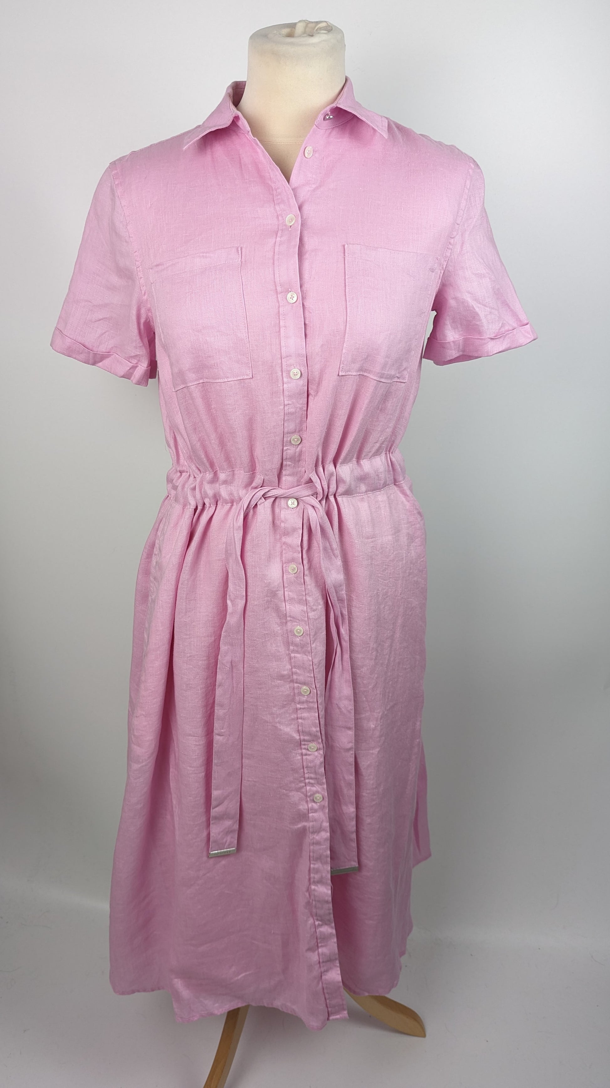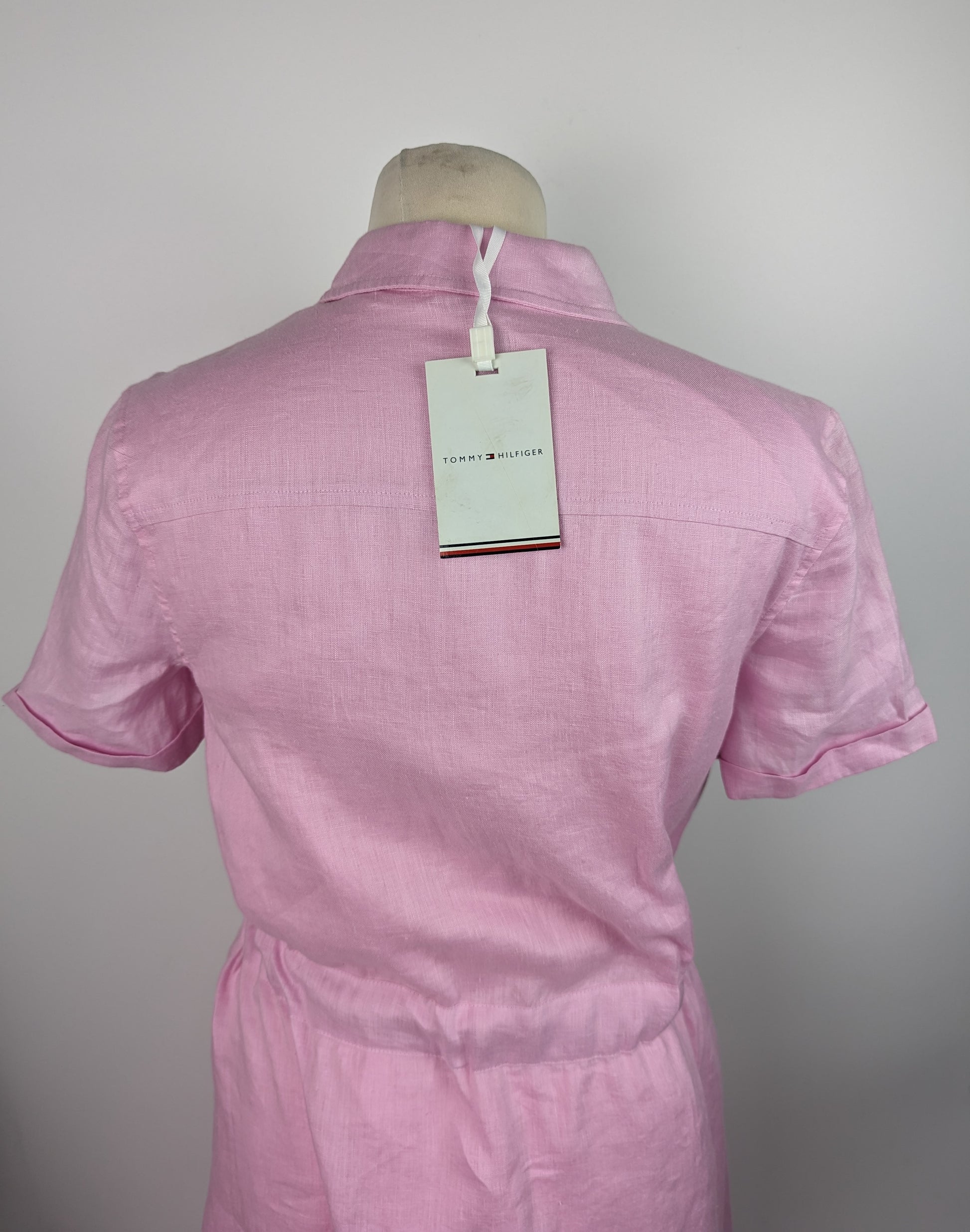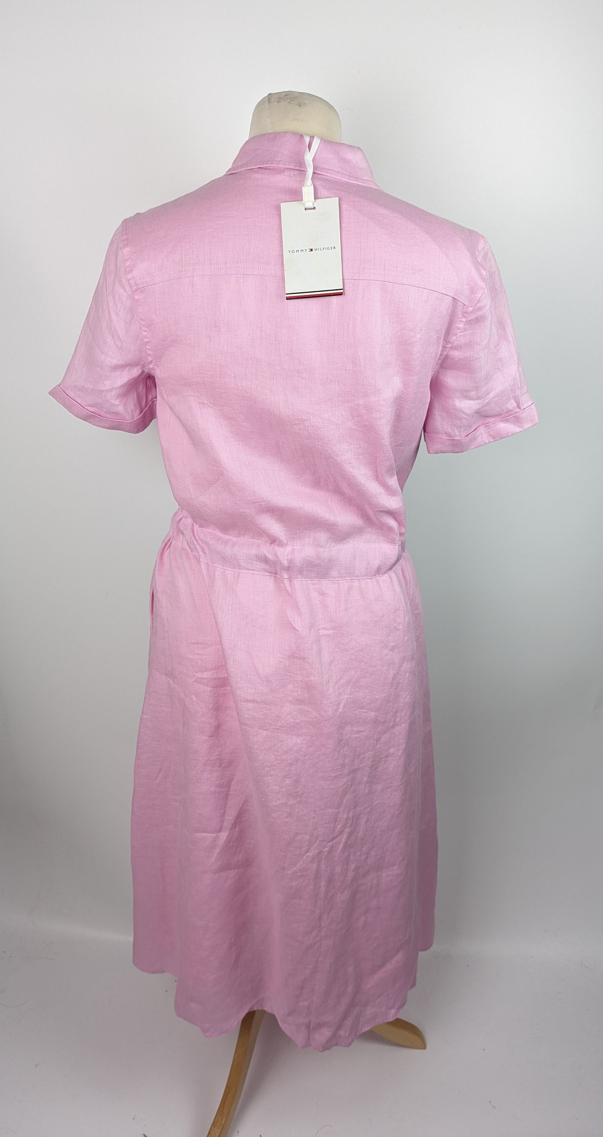 This pink TOMMY HILFIGER Linen Dakota Dress is crafted from 100% linen and features button fastenings, a collar, and an adjustable waist with a belt. Its mid length adds a touch of sophistication to any outfit.