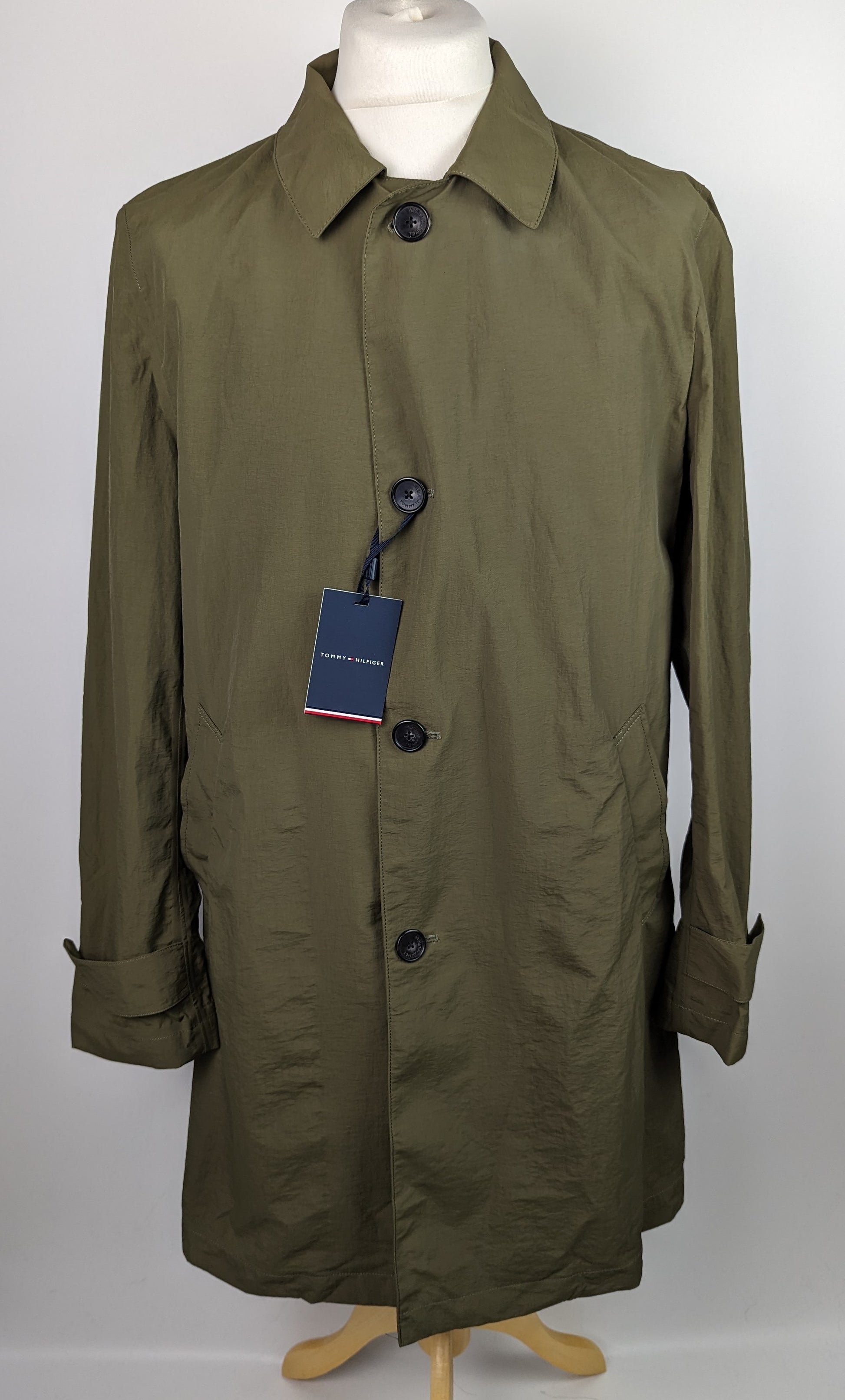 Simple but stylish design jacket by TOMMY HILFIGER. A lightweight, packaway mac, perfect for the unpredictable British weather all year round. Longer length to keep you extra comfortable and dry, with button fasteners up the front for added warmth. The jacket is the perfect accessory to wear over knitwear and jeans or chino trousers.