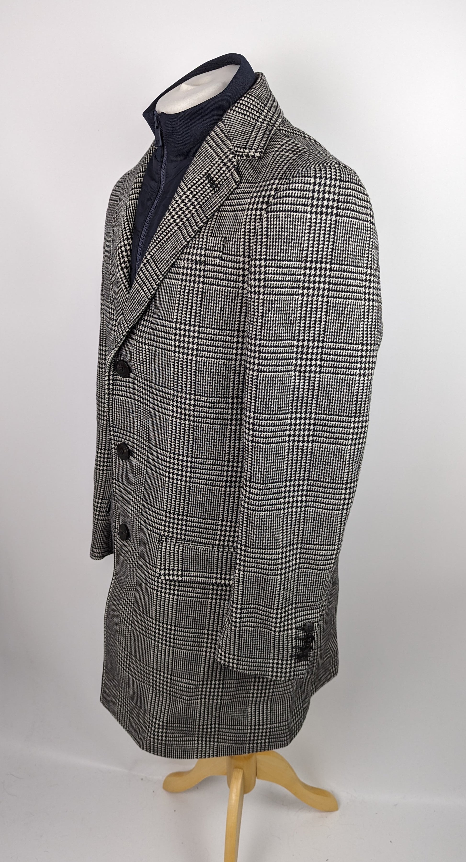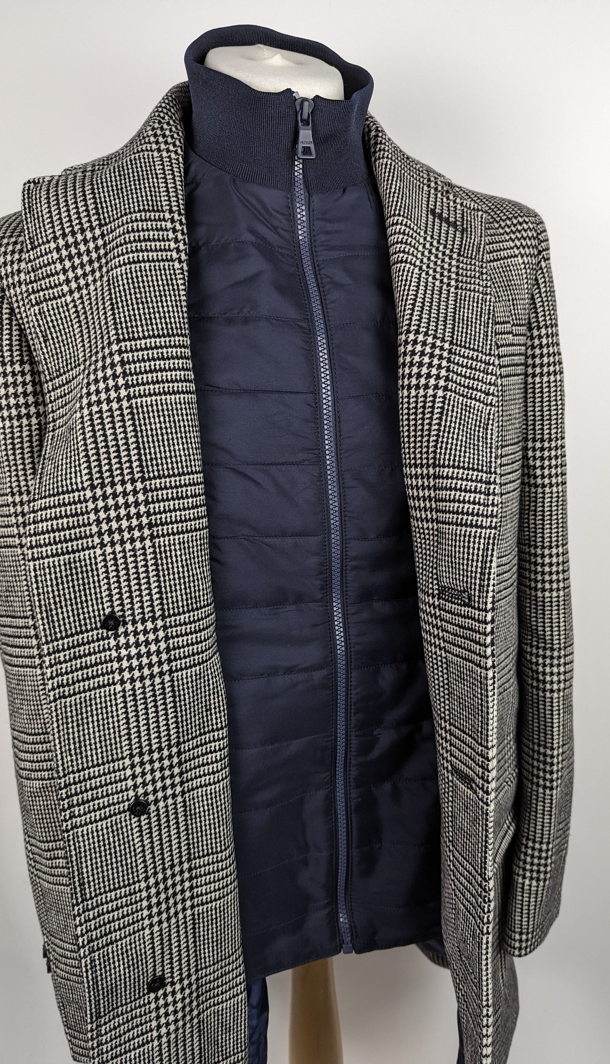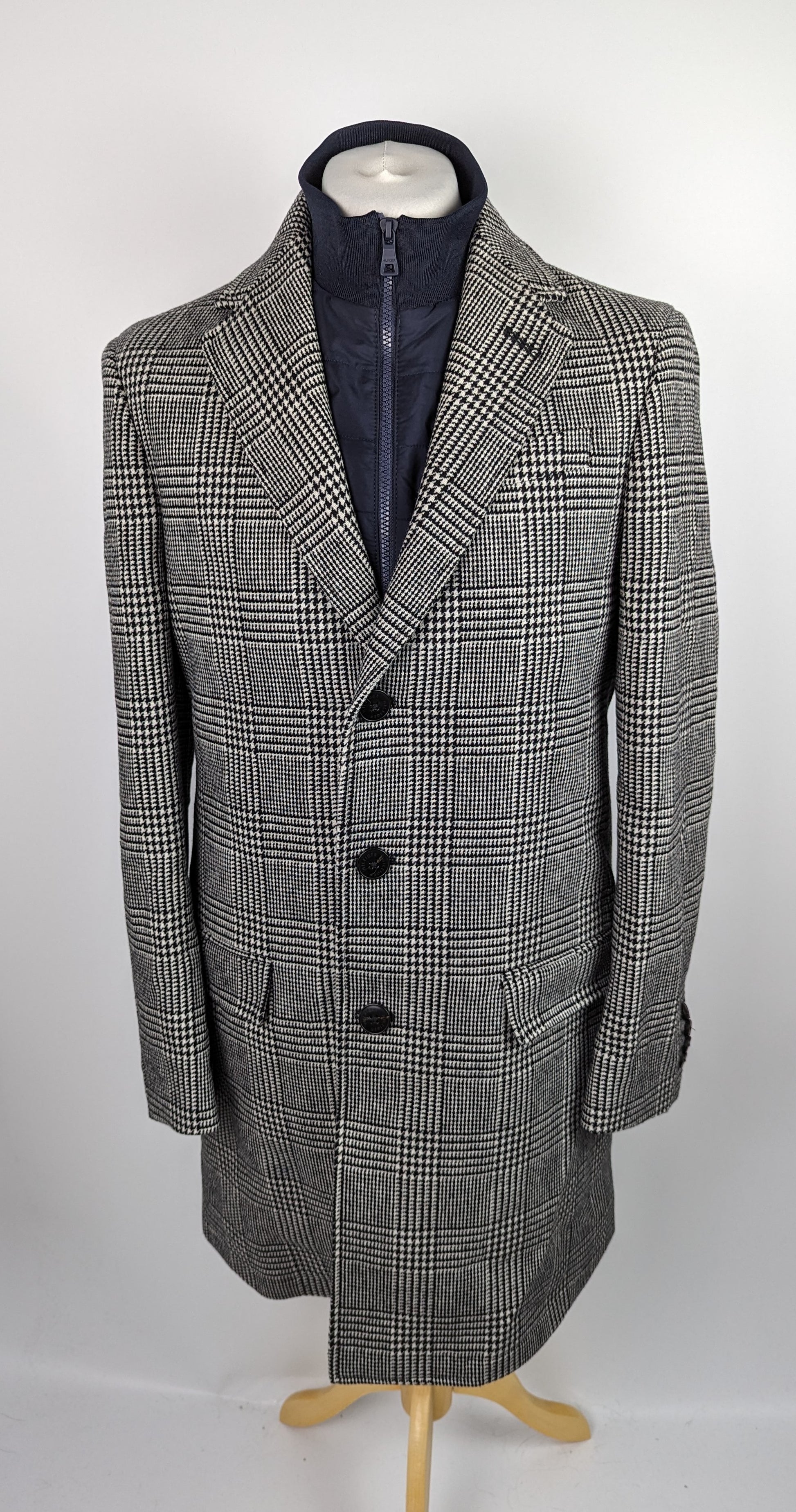 City-smart meets street-style in the refined jacket from Tommy Hilfiger. Finished in a Prince of Wales check design in contrasting monochrome shades, this wool blend coat is the ultimate modern classic. The jacket is a single breasted, button close design with spread collar and notched lapel. Fitted with a lightly quilted blue lining with full length zip fastener for added warmth and comfort. Fabric content: 75% wool, 25% nylon.