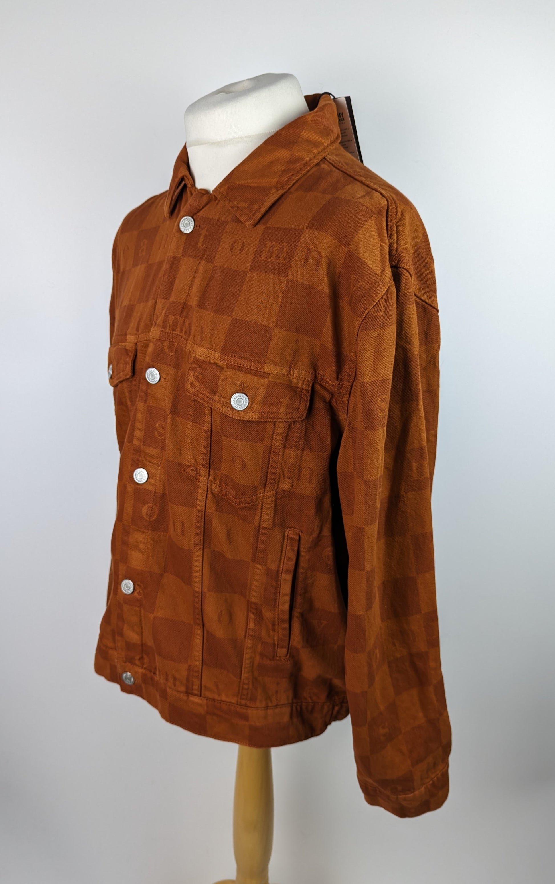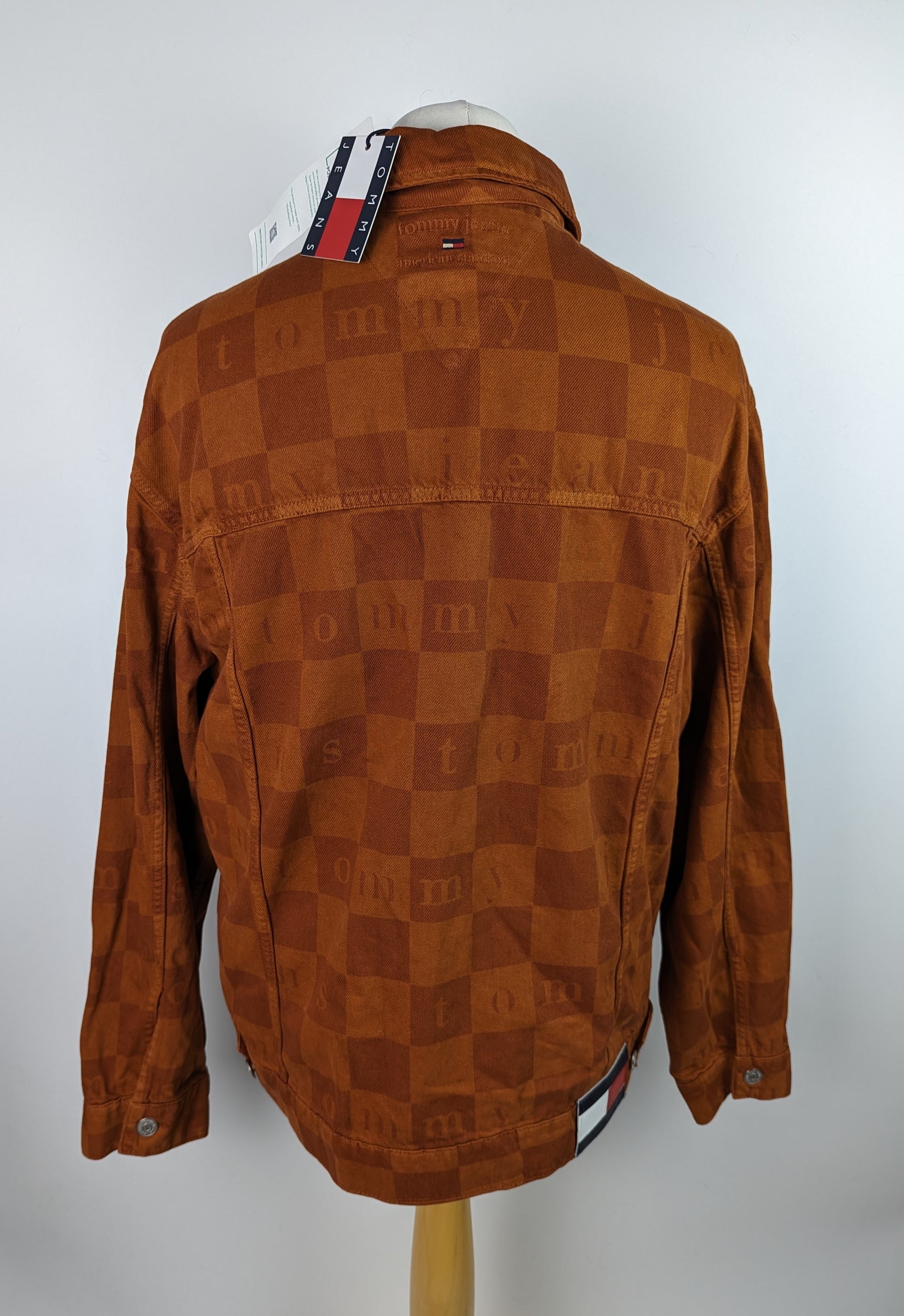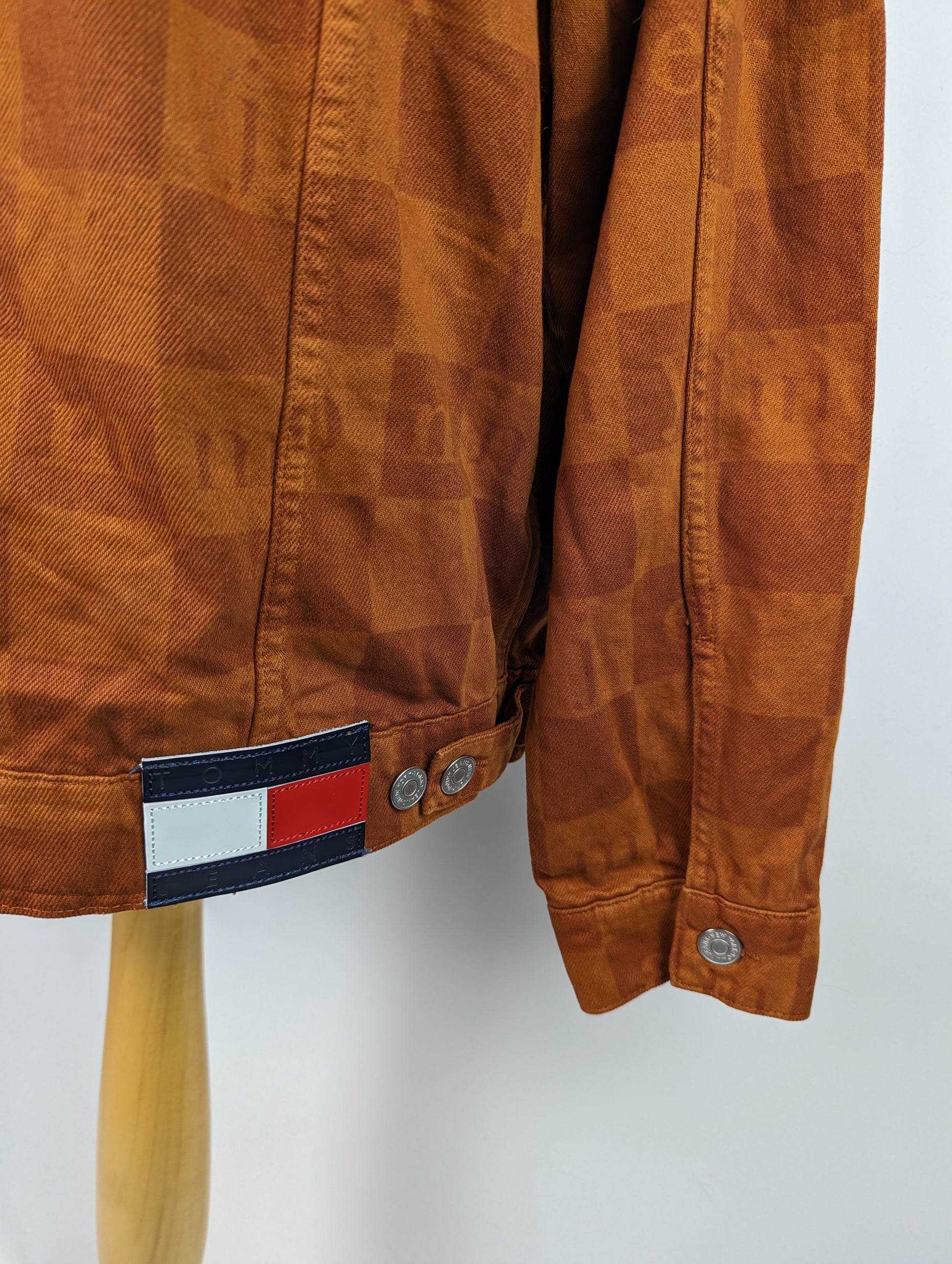 Stylish men's casual jacket from TOMMY JEANS. The Check Trucker Jacket is a classically cut denim design with metal buttons and pockets to the chest and waist. The jacket is crafted in a rich, deep burnt orange "Wood" colour denim, with all over check pattern and Tommy Jeans text. A timeless style with a modern twist, this is the perfect jacket for the ever changing seasons.