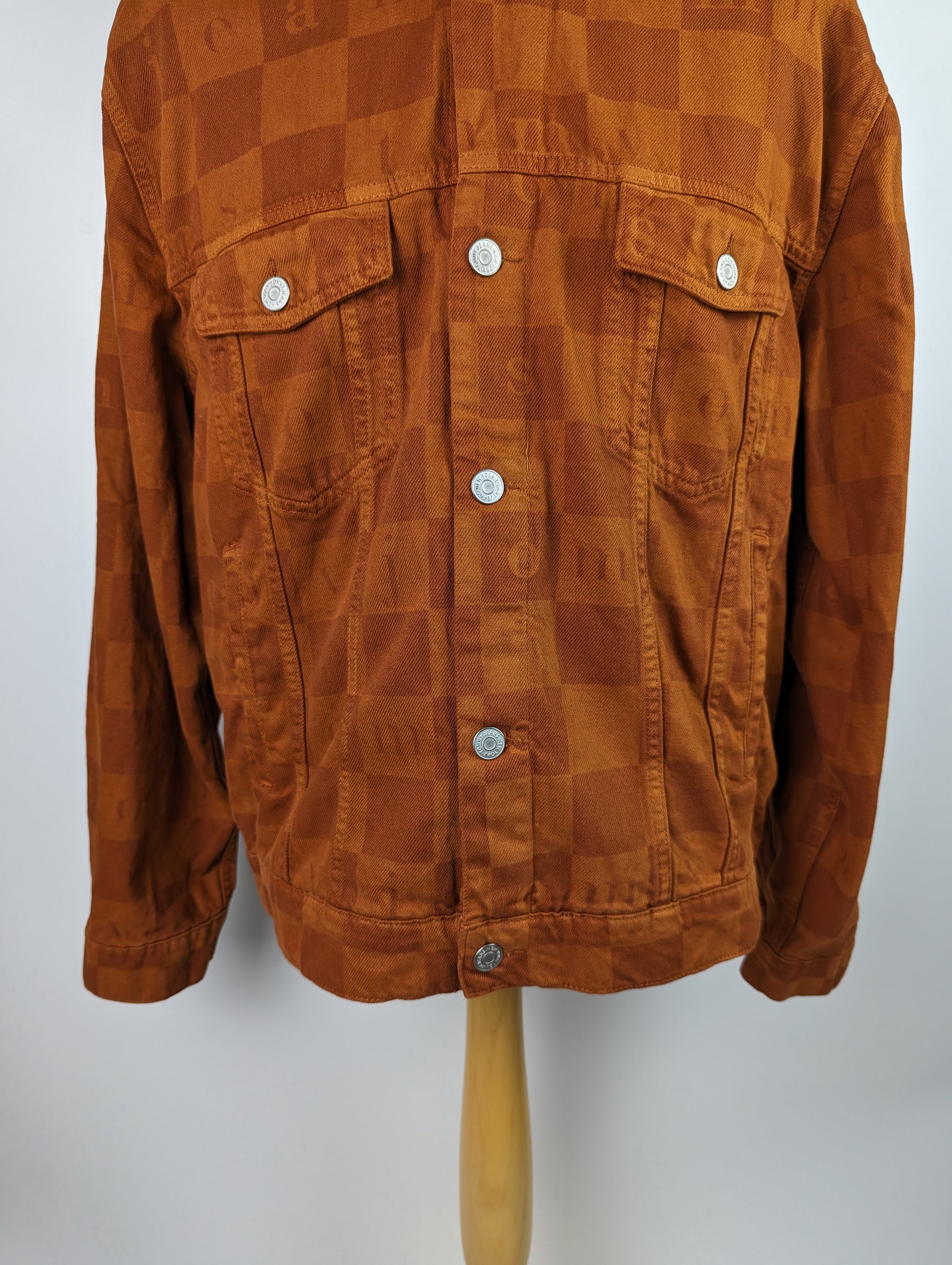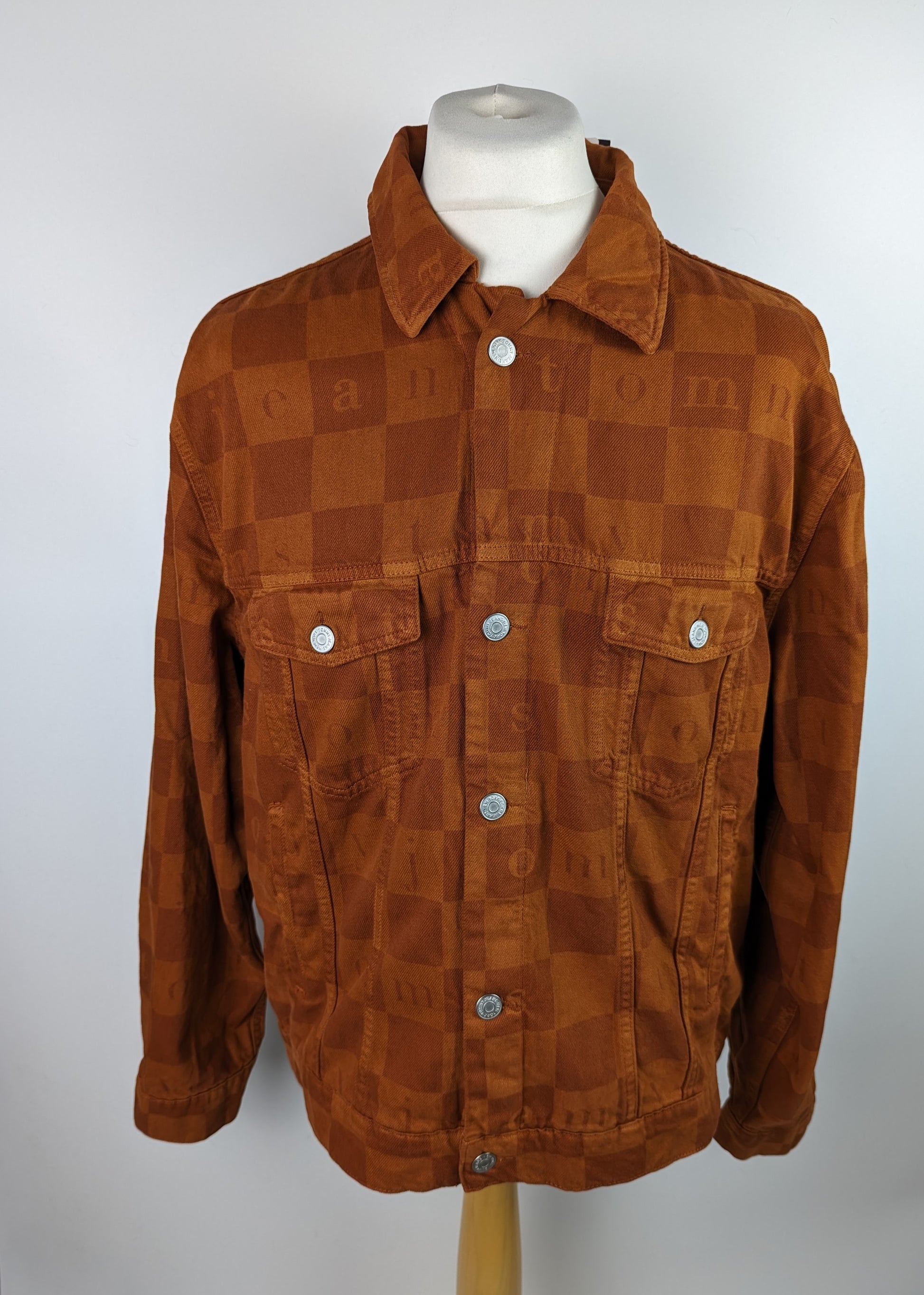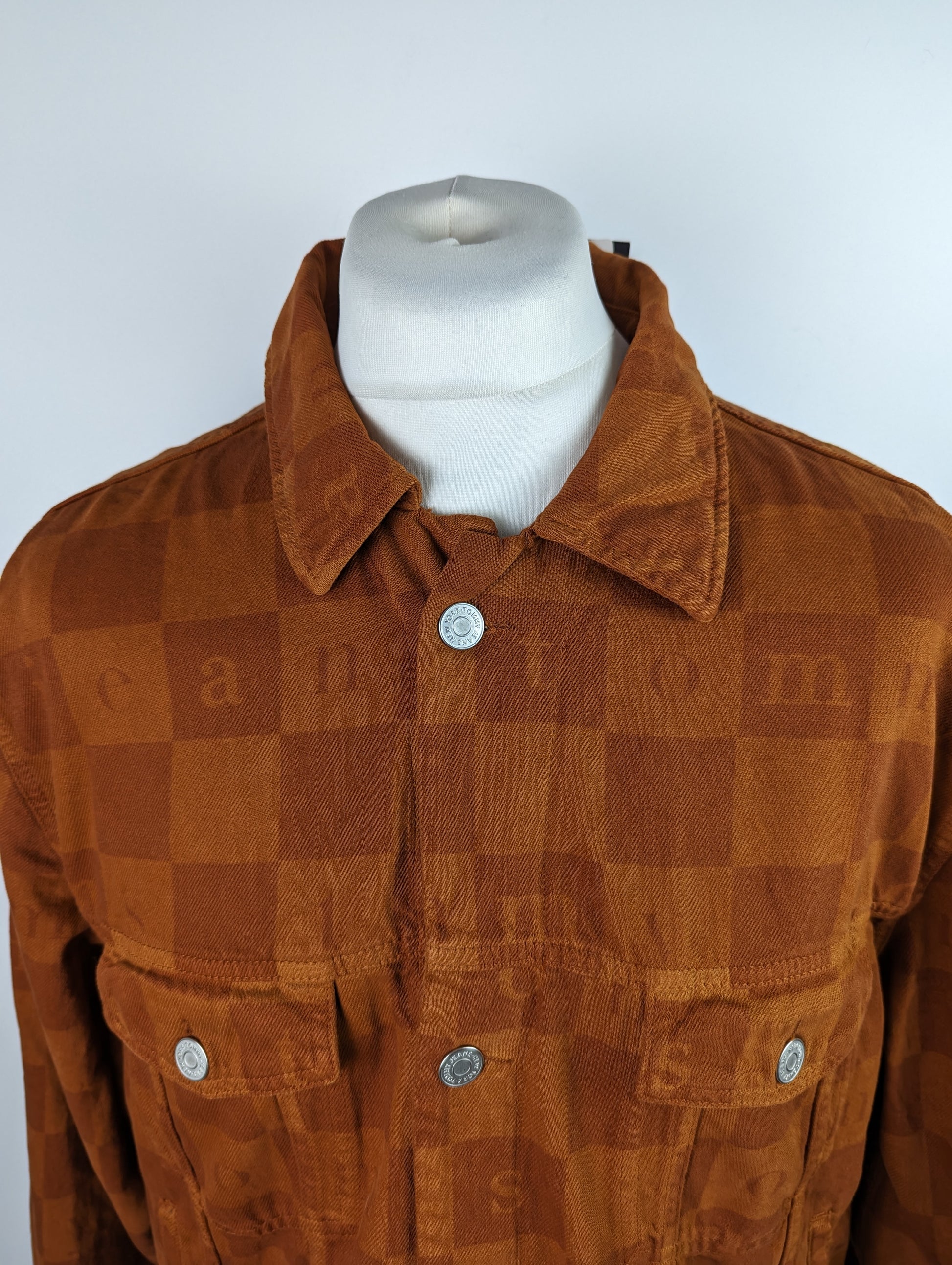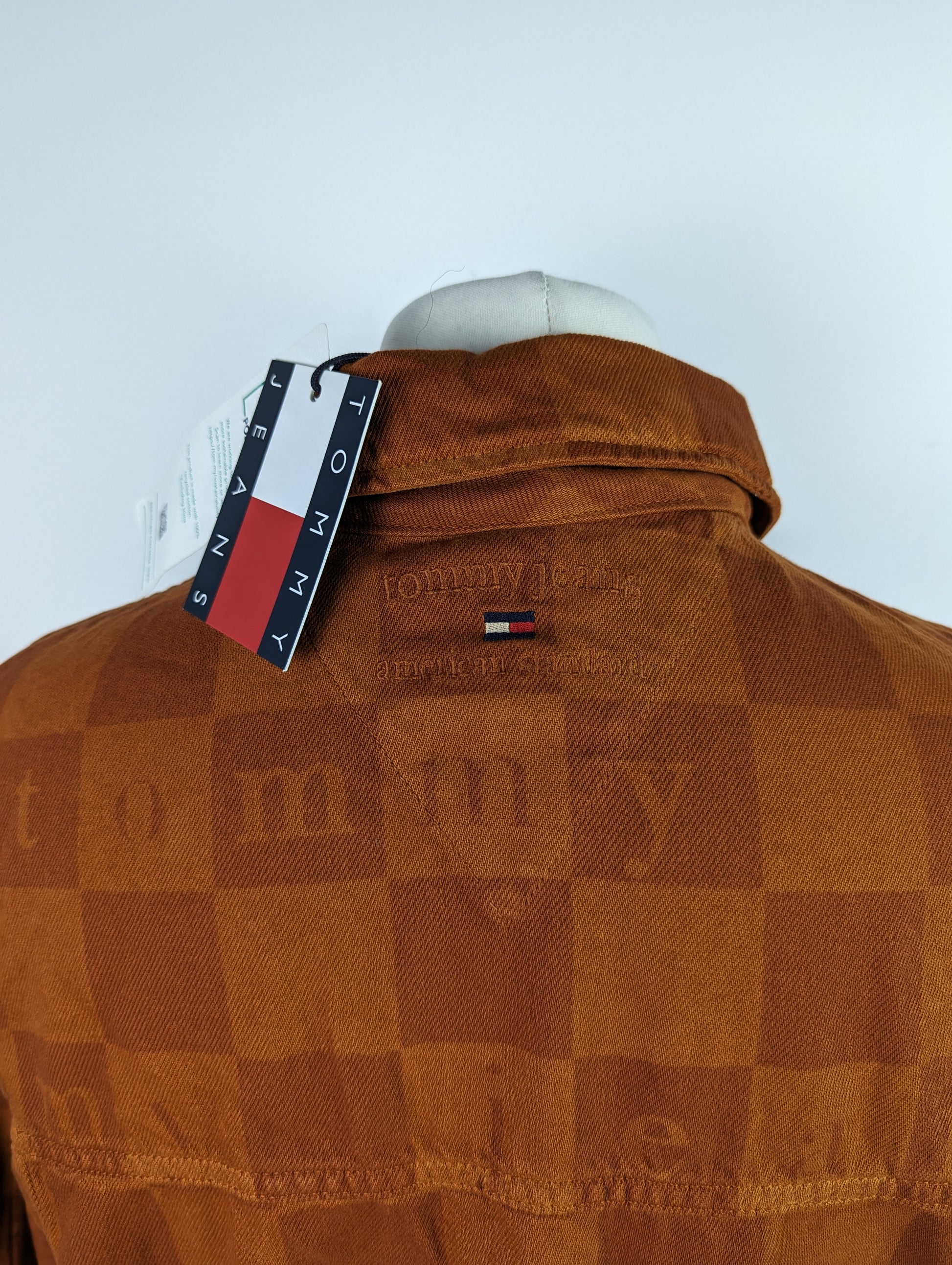 Stylish men's casual jacket from TOMMY JEANS. The Check Trucker Jacket is a classically cut denim design with metal buttons and pockets to the chest and waist. The jacket is crafted in a rich, deep burnt orange "Wood" colour denim, with all over check pattern and Tommy Jeans text. A timeless style with a modern twist, this is the perfect jacket for the ever changing seasons.