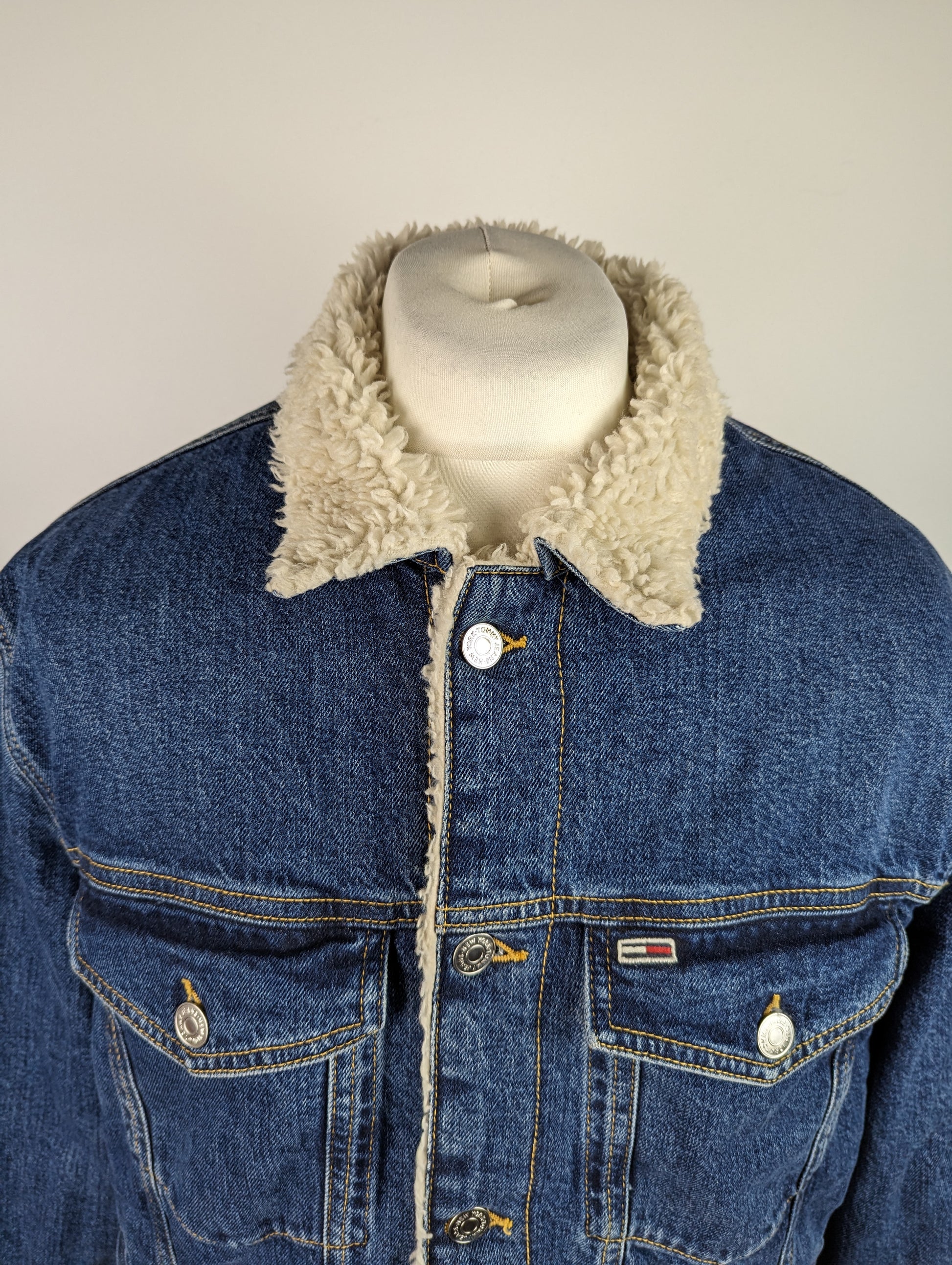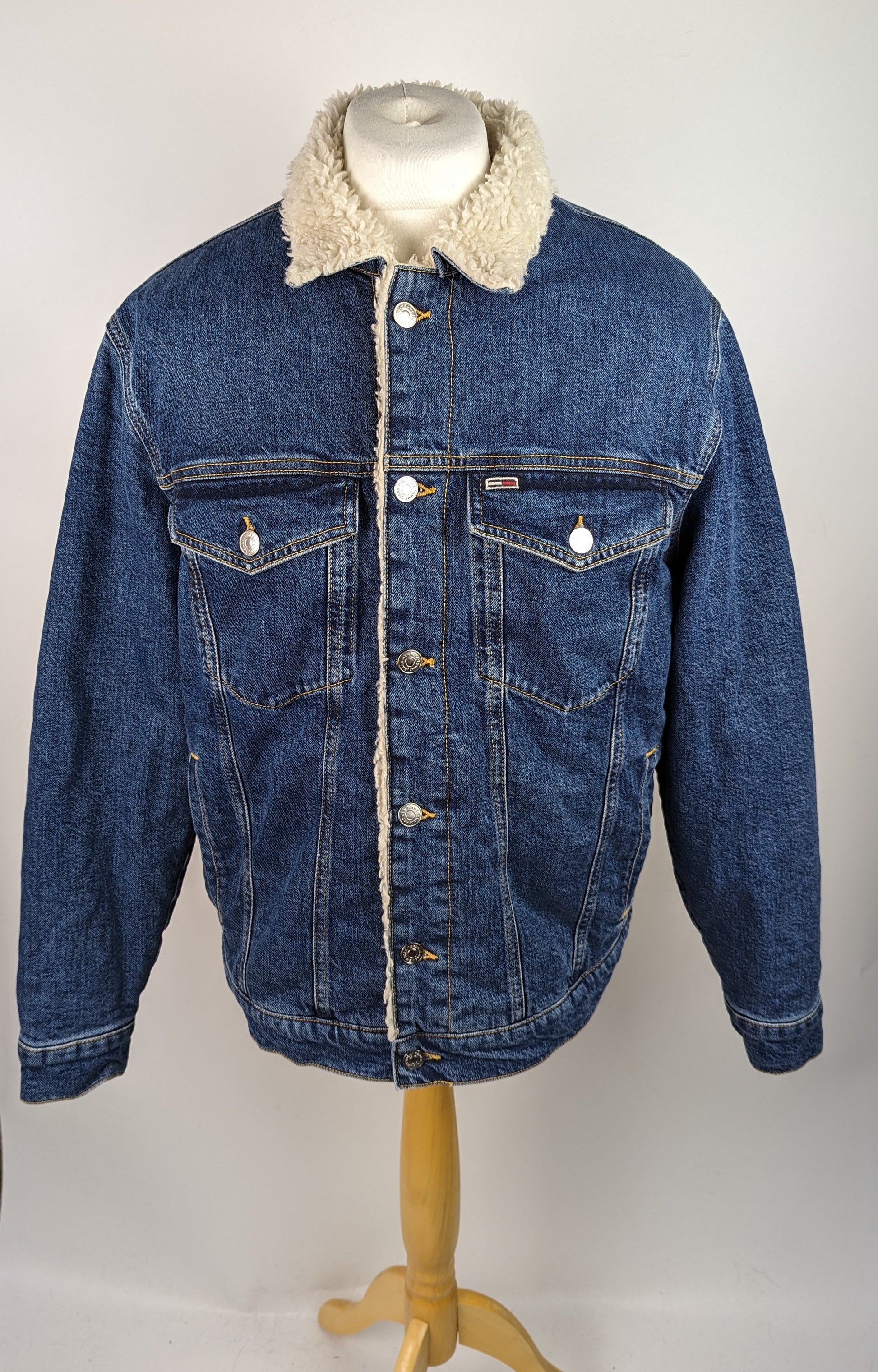 The Tommy Jeans Men's Oversized Sharp Trucker Denim Jacket features the brand logo at the hem and a multi-coloured pattern on the back. With a classic neckline and long sleeves, this jacket also includes buttoned cuffs and a sherpa interior for added warmth. The button closure and multi pockets add functionality to this stylish denim jacket.