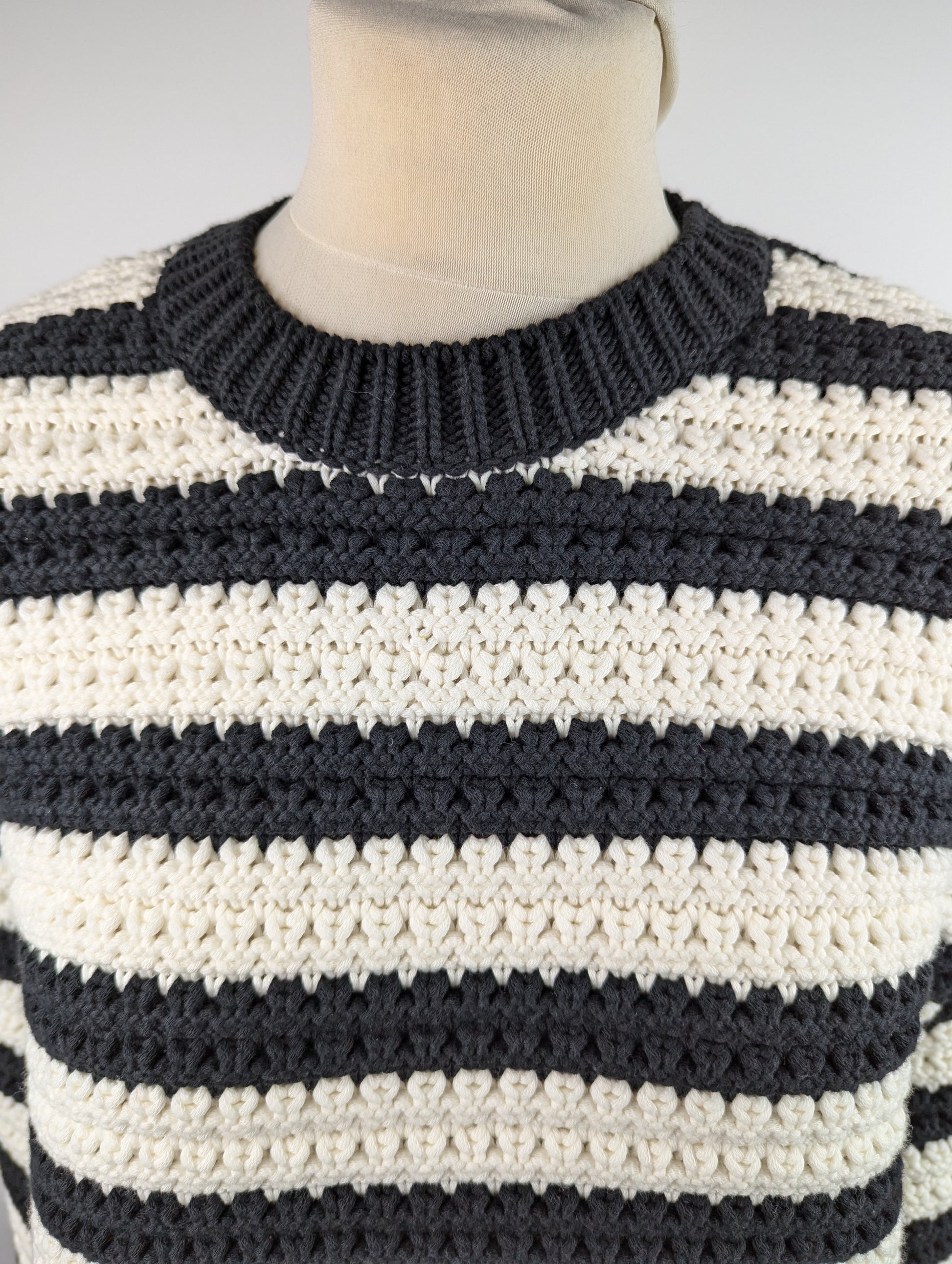 - This unisex sweater combines needle punch embroidery with a heavy crochet knit construction, made from 66% cotton and 34% polyamide. It features a distinctive red accent on the sleeve which contrast with the stripe knit. Oversized fit.